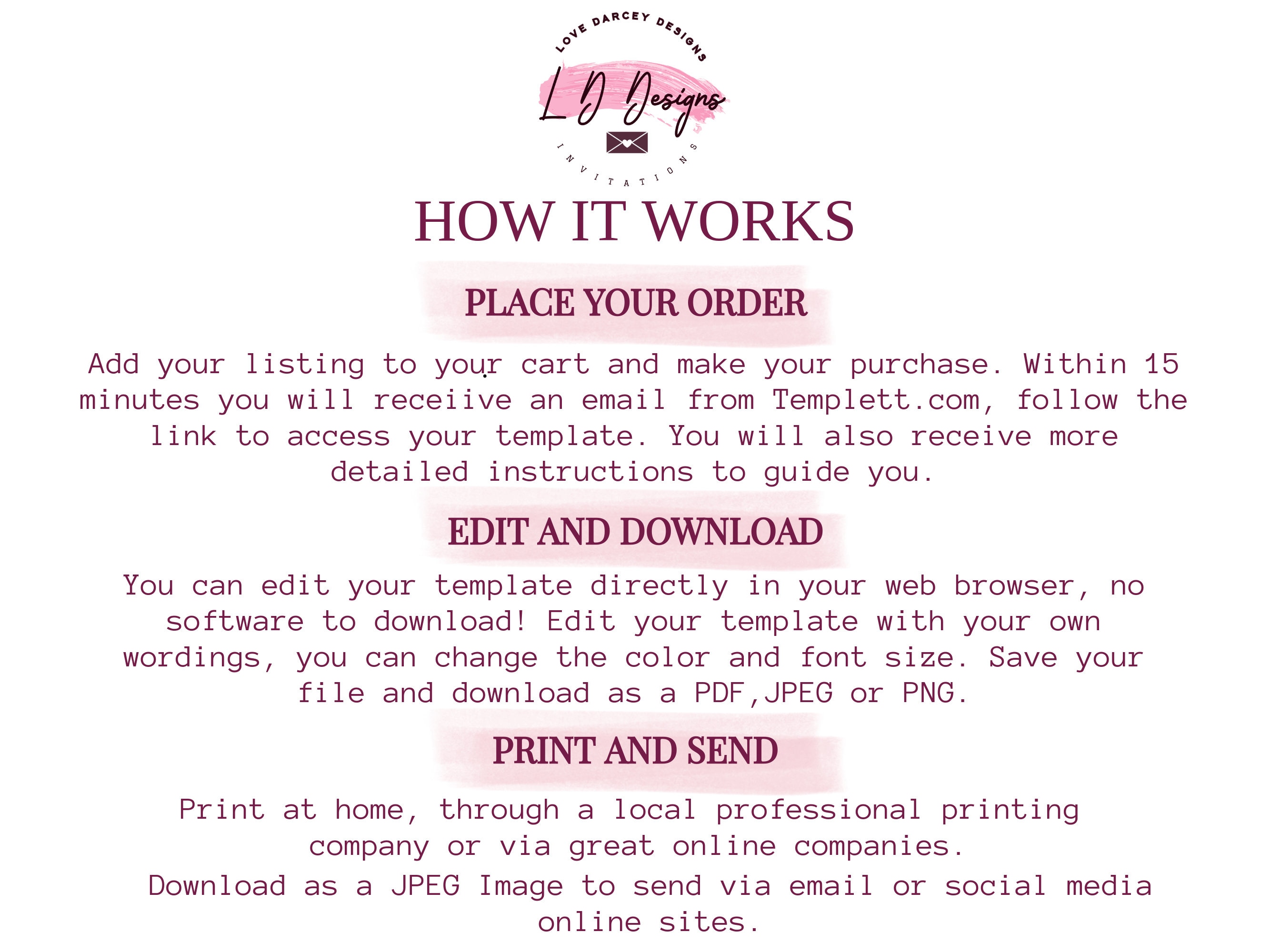 Once making your purchase, you will receive an email from Templett within a few minutes, click on the link that takes you directly to Templett where you can access your purchased files. Please note you will have to create an account if you do not already have one, then you can edit away, you can return and re edit anytime until you are happy. Be sure to save as you go. Once you are satisfied download and print yourself or professionally.
