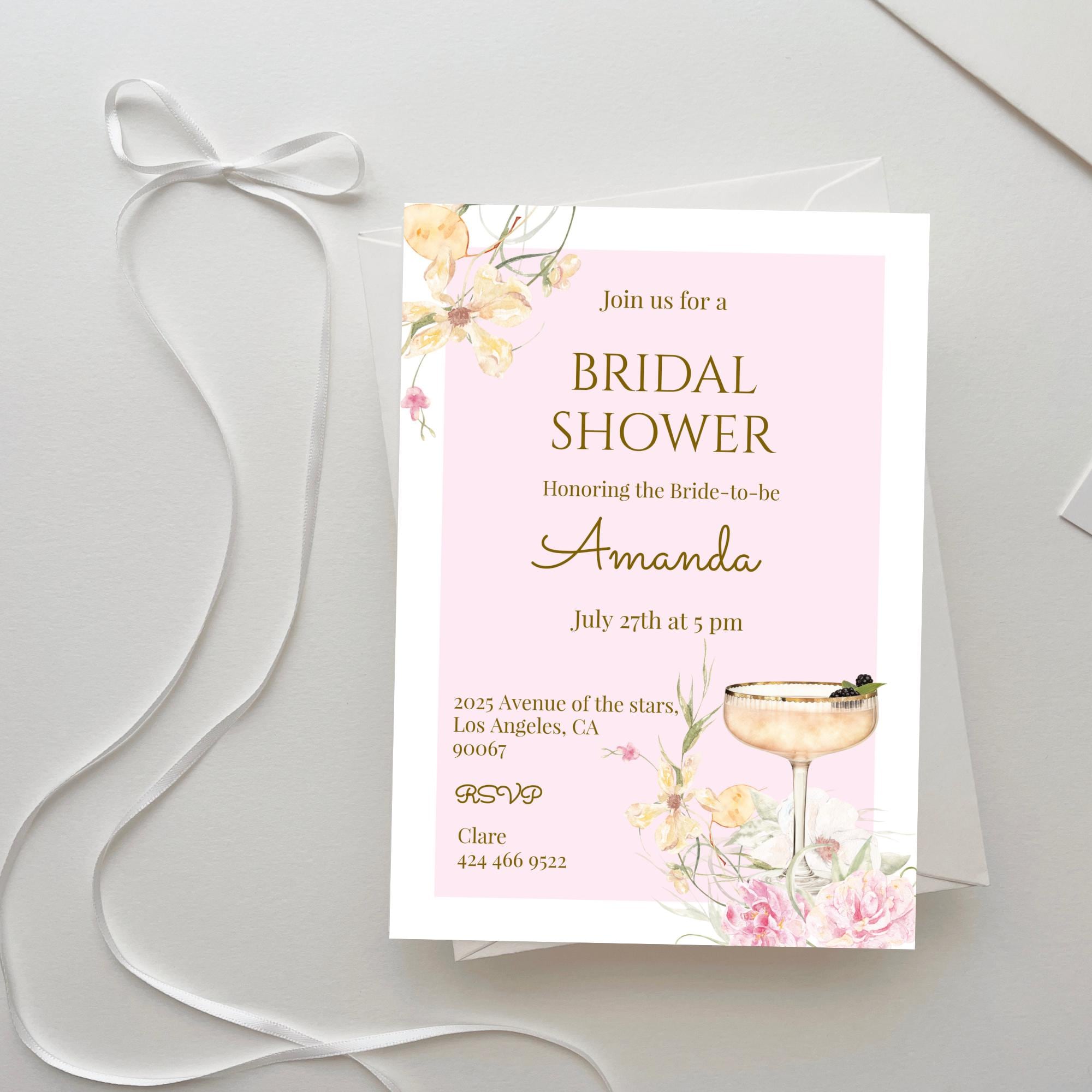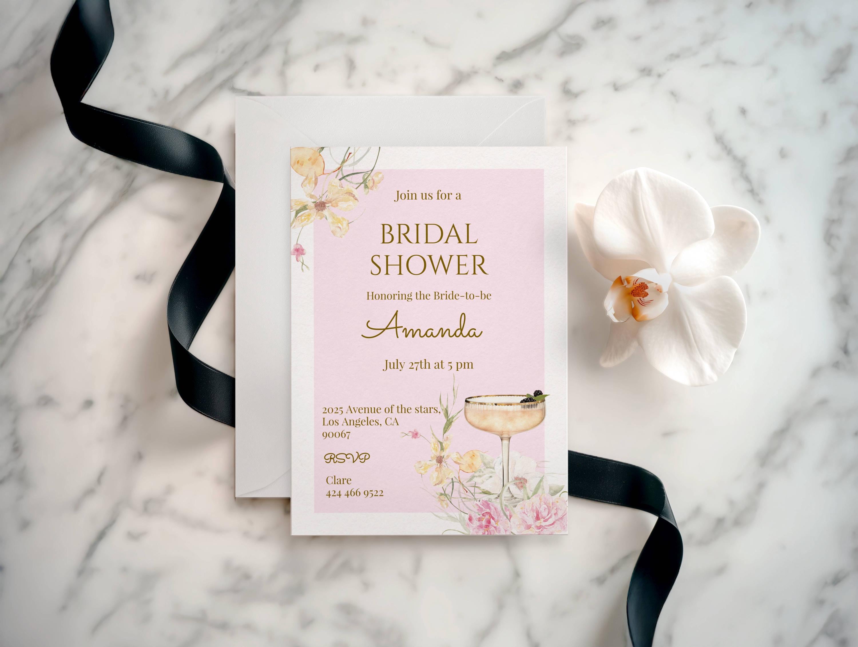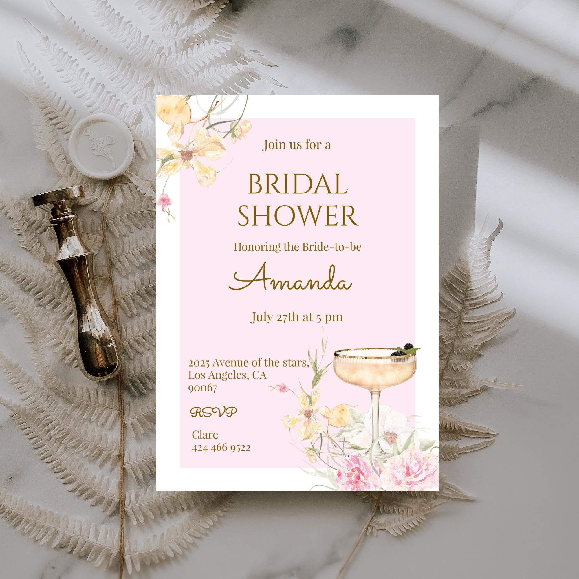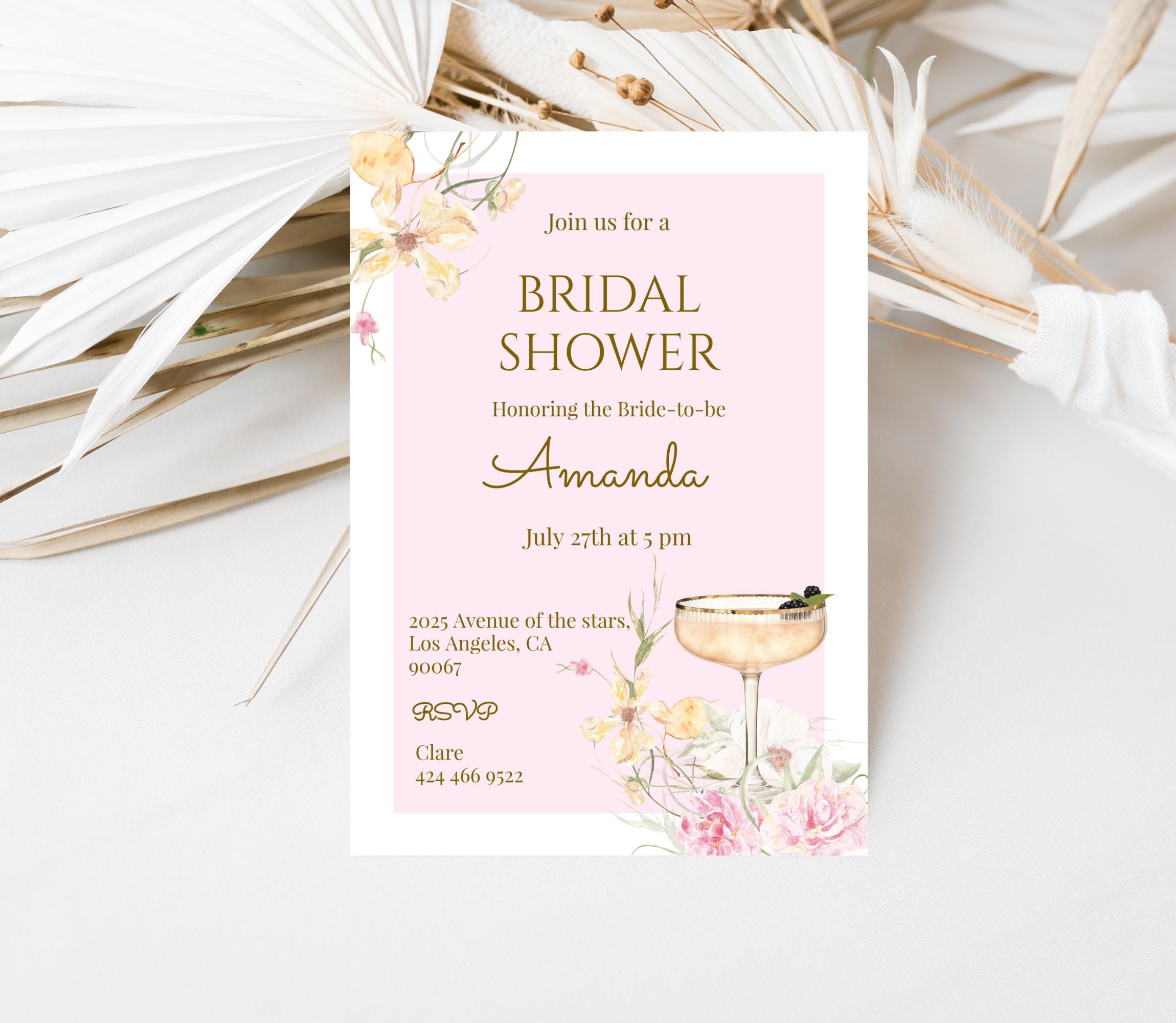 Pretty Pink Floral Champagne Bridal Shower Invitation Template. An instant download digital file for you to edit in your web browser with Templett straight after your purchase. Once personalized you are ready to print.
