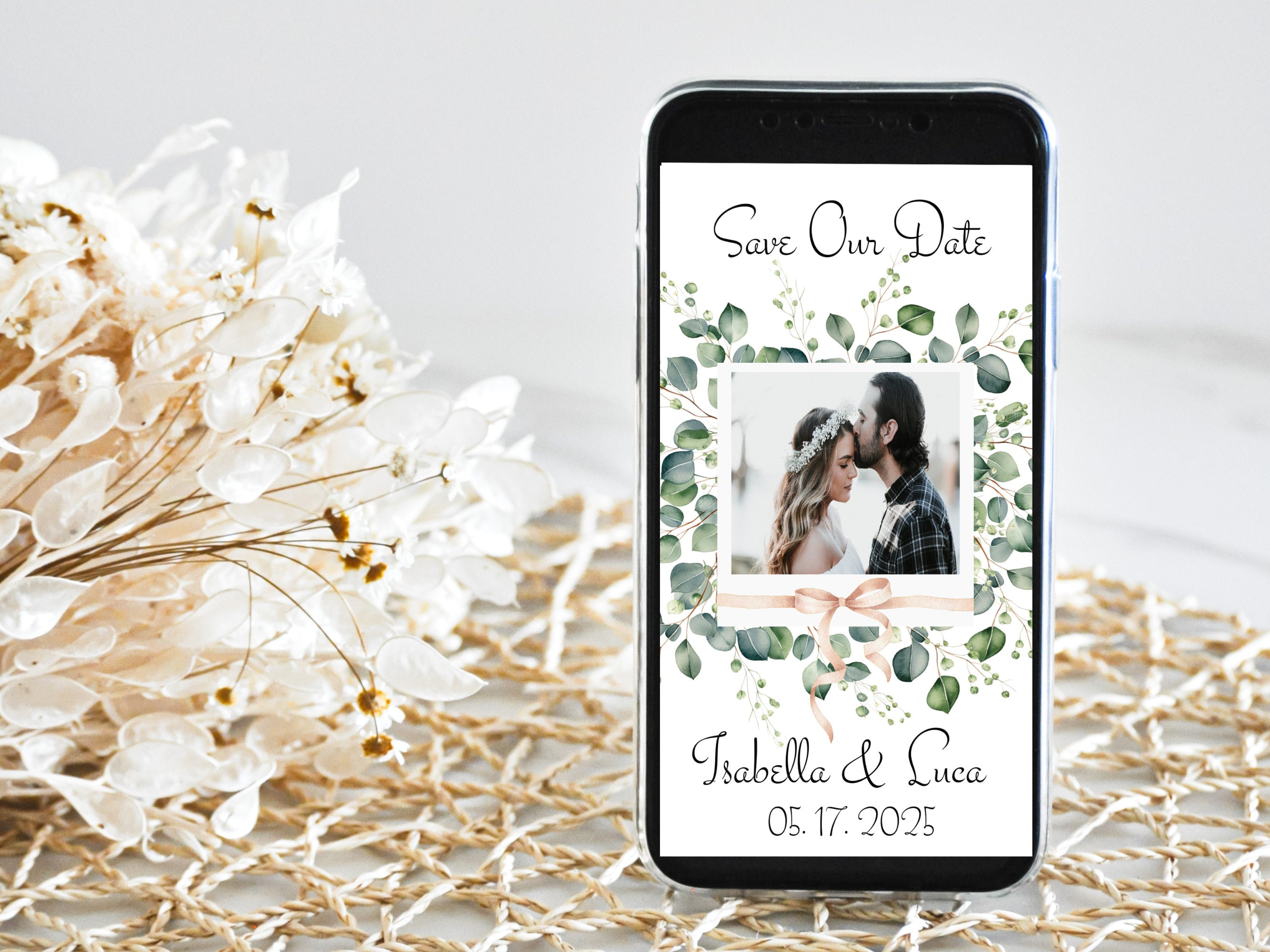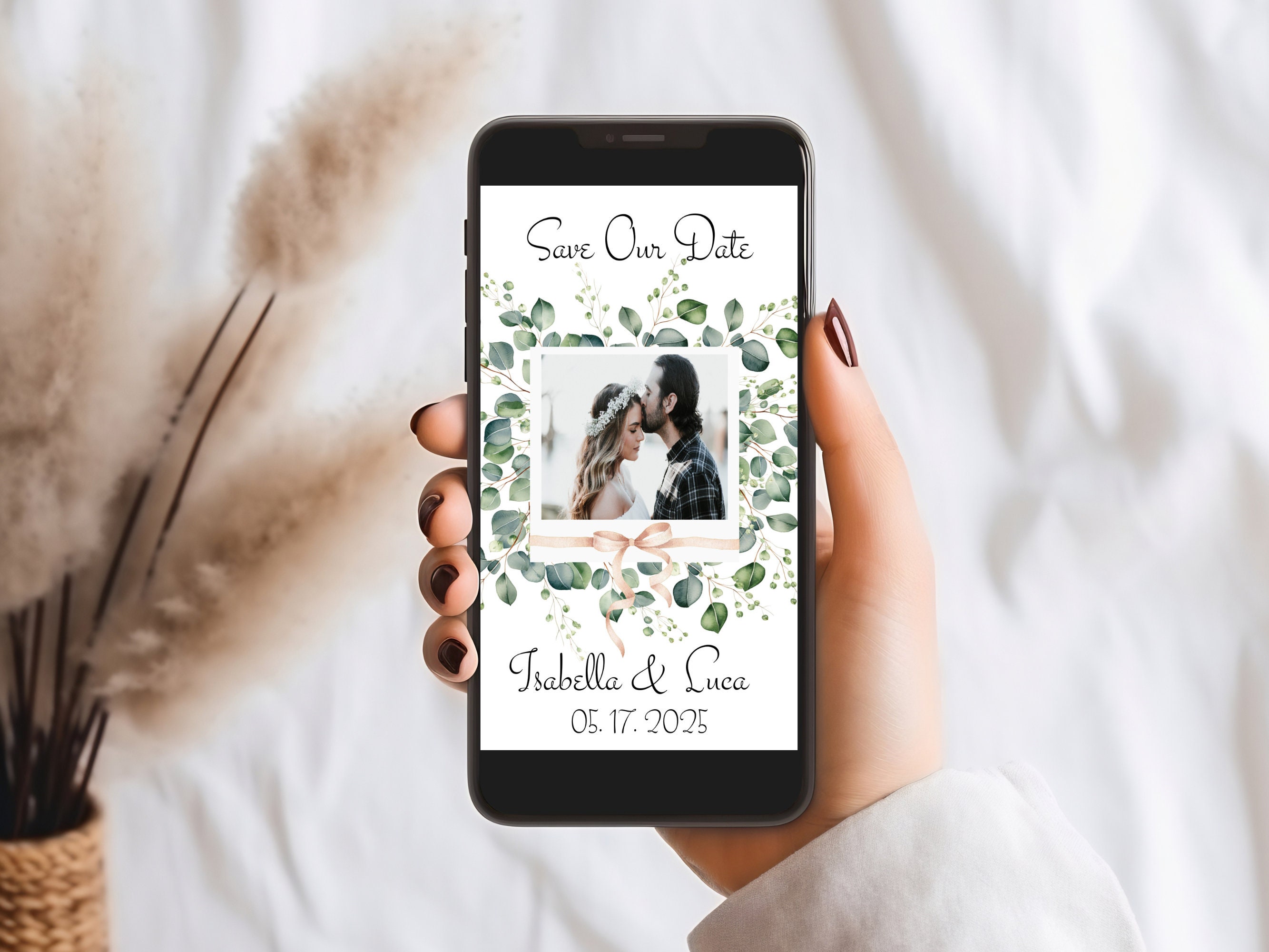 Photo, Save Our Date Boho Eucalyptus Evite. An instant download digital file for you to edit in your web browser with Templett straight after your purchase. Once personalized you are ready to send.