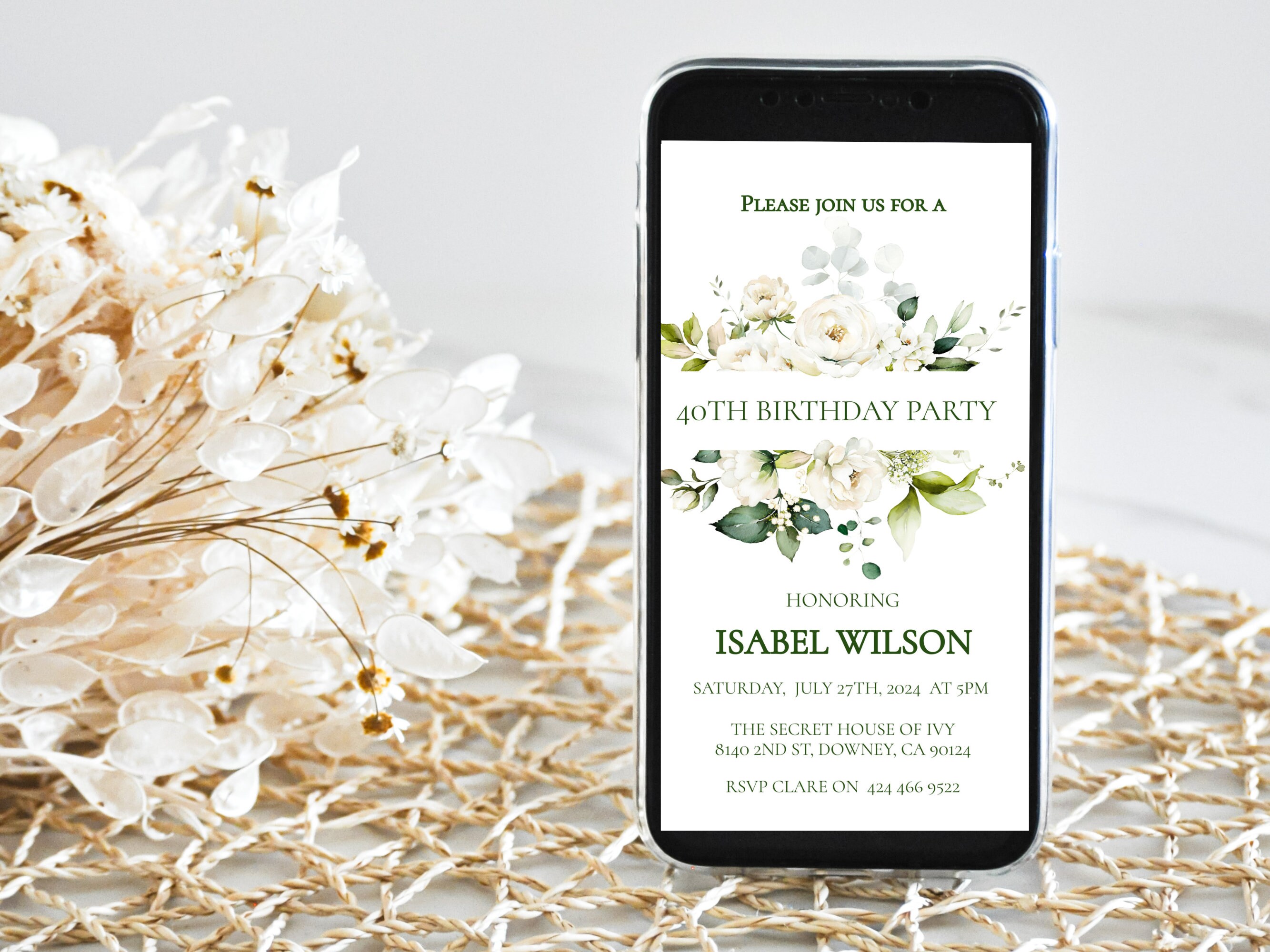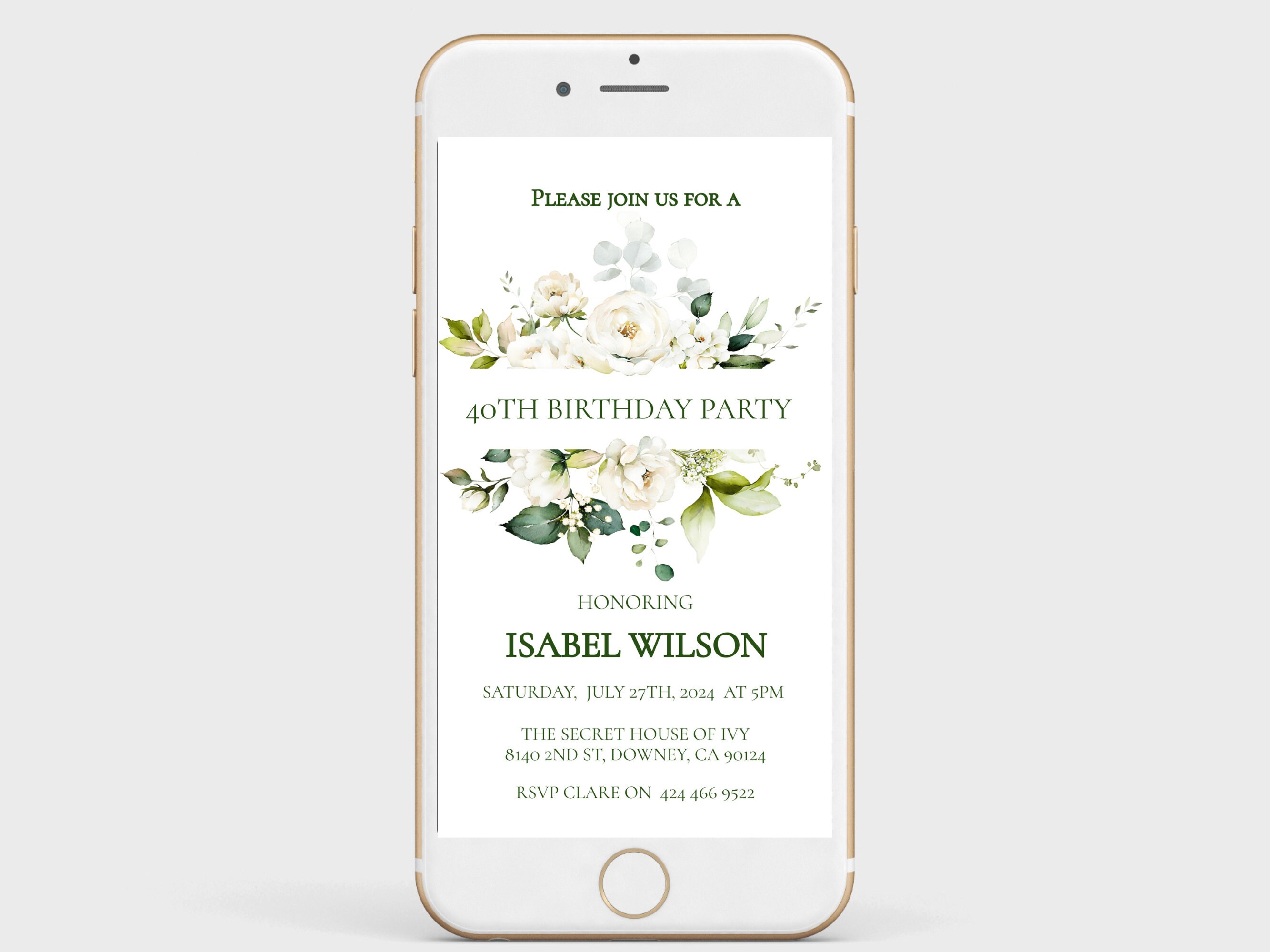 Elegant White Floral Birthday Evite. An instant download digital file for you to edit in your web browser with Templett straight after your purchase. Once personalized you are ready to send.