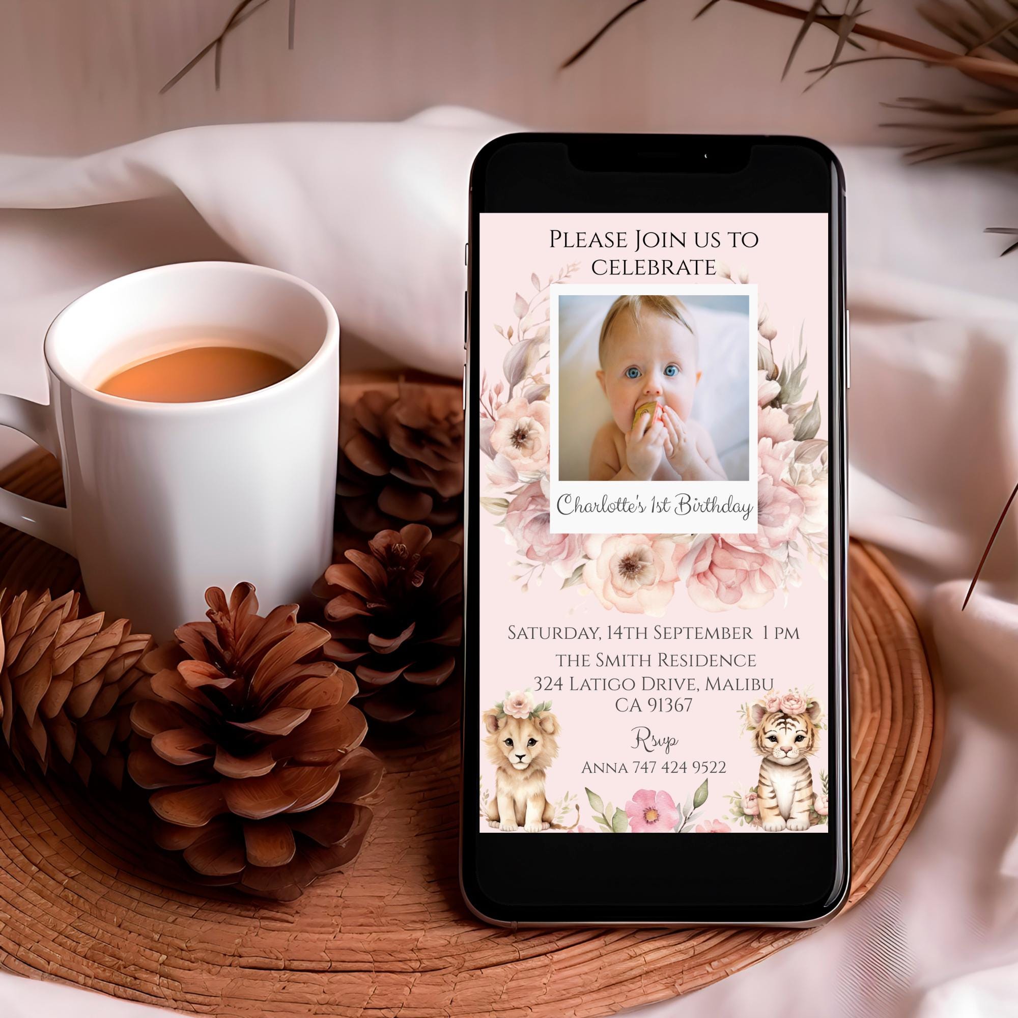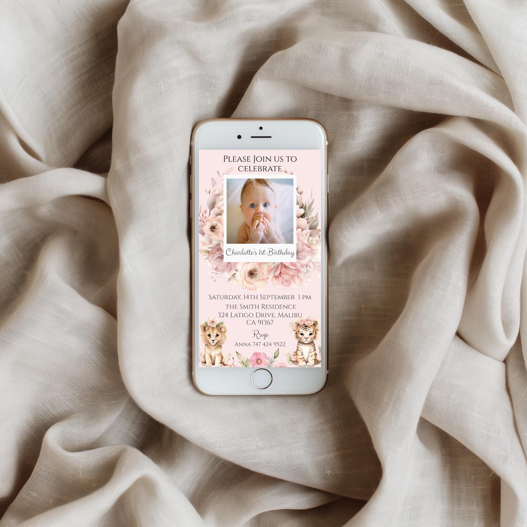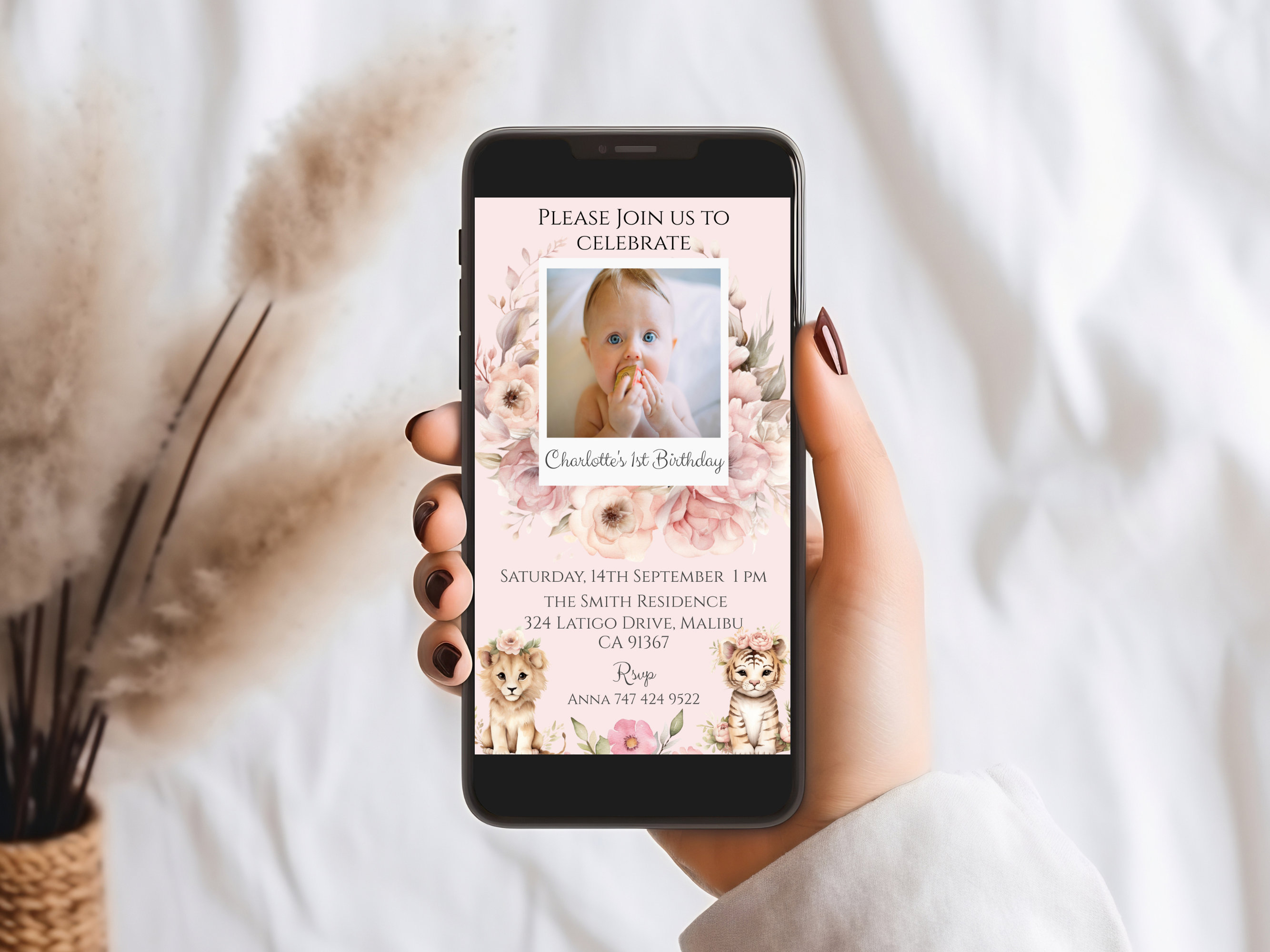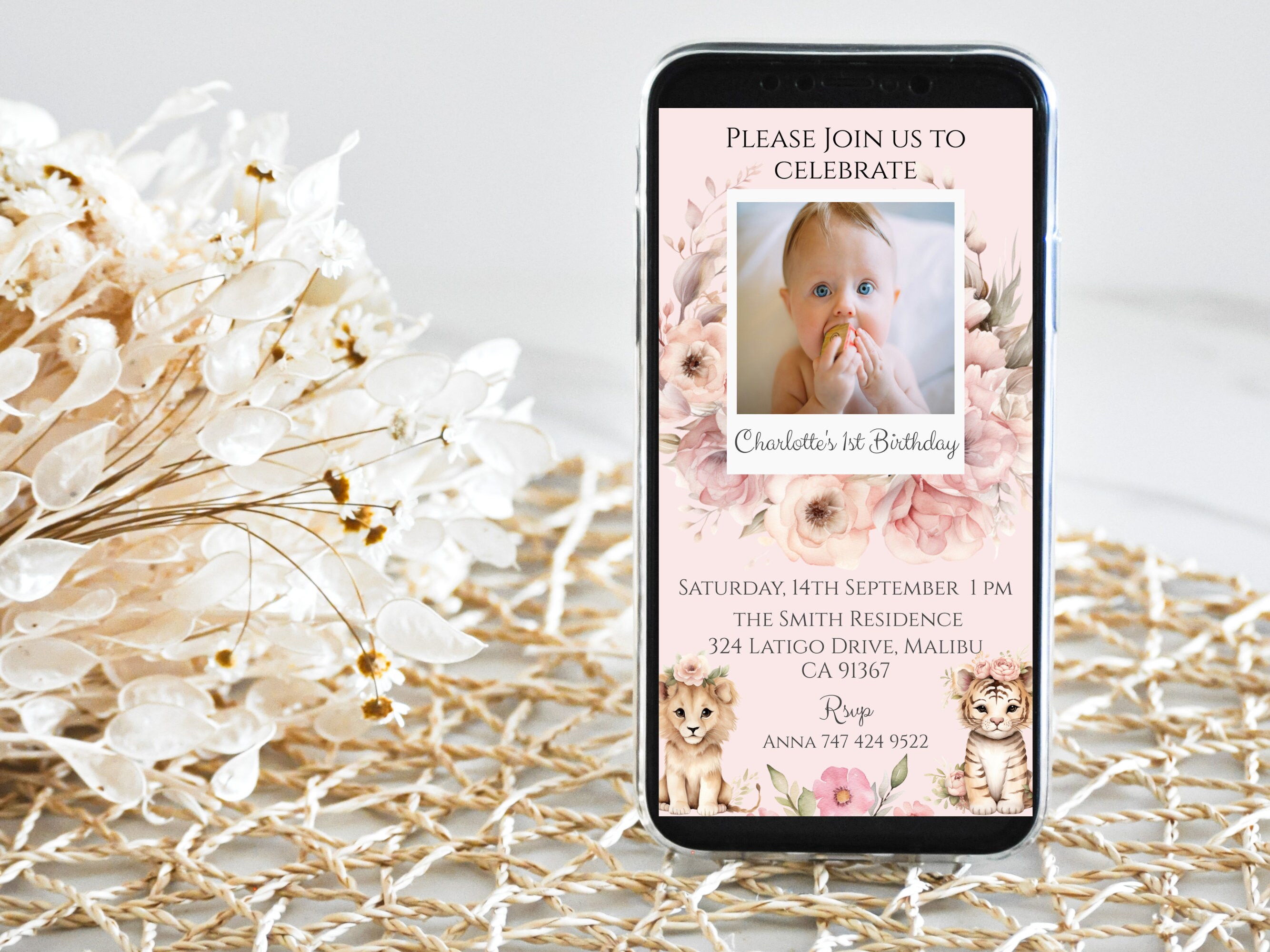 Baby Girl 1st Birthday Blush Safari Photo Evite. An instant download digital file for you to edit in your web browser with Templett straight after your purchase. Once personalized you are ready to send.