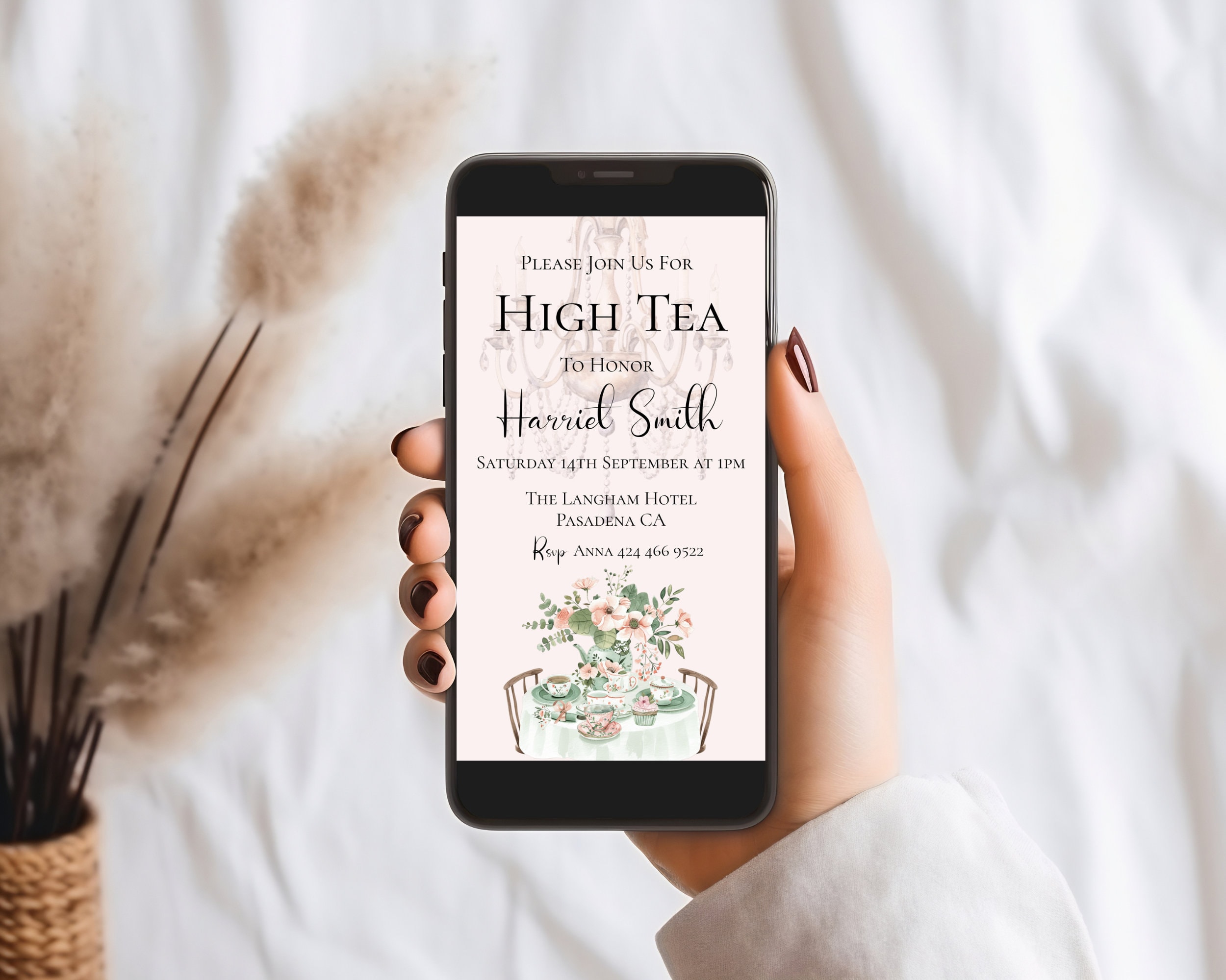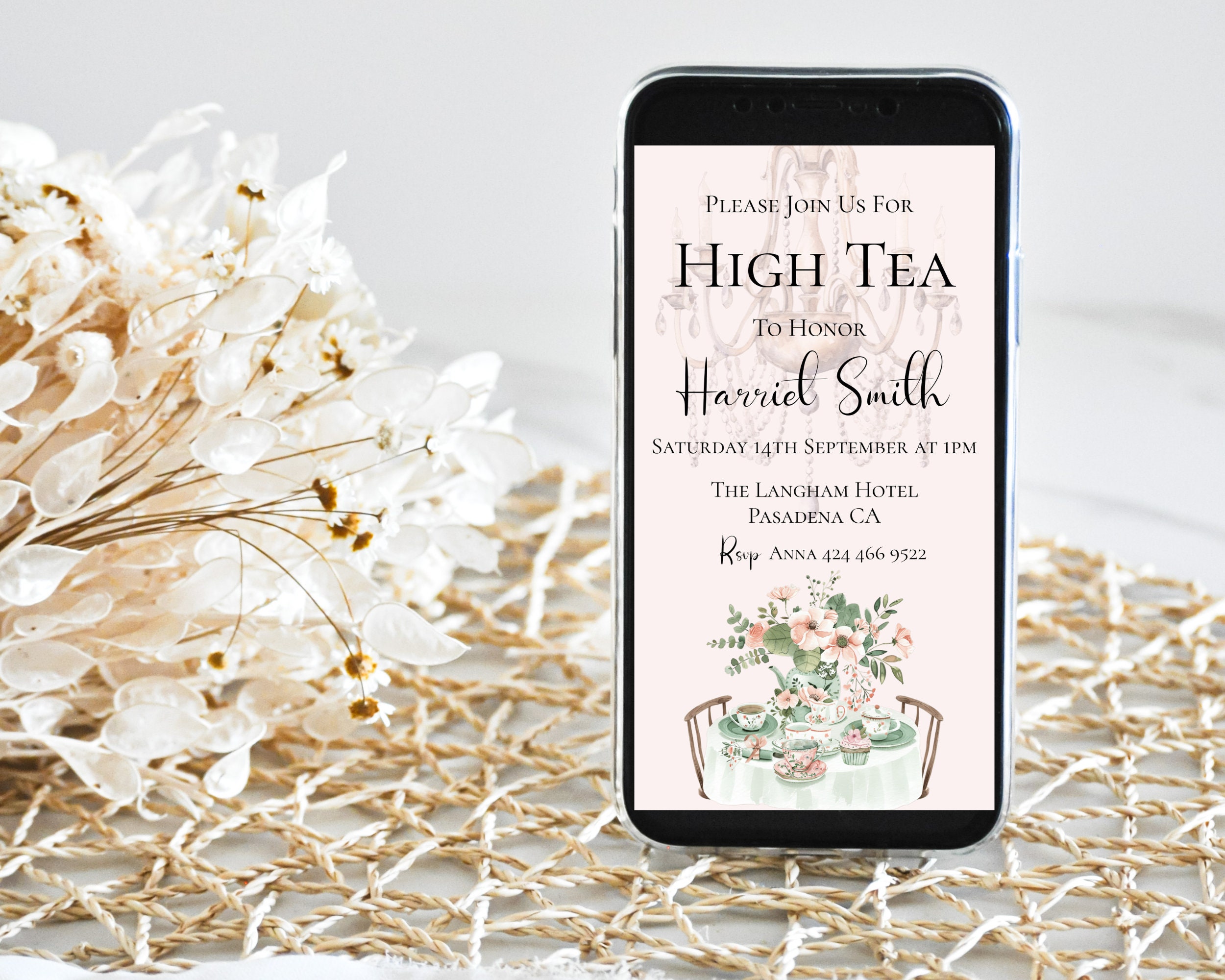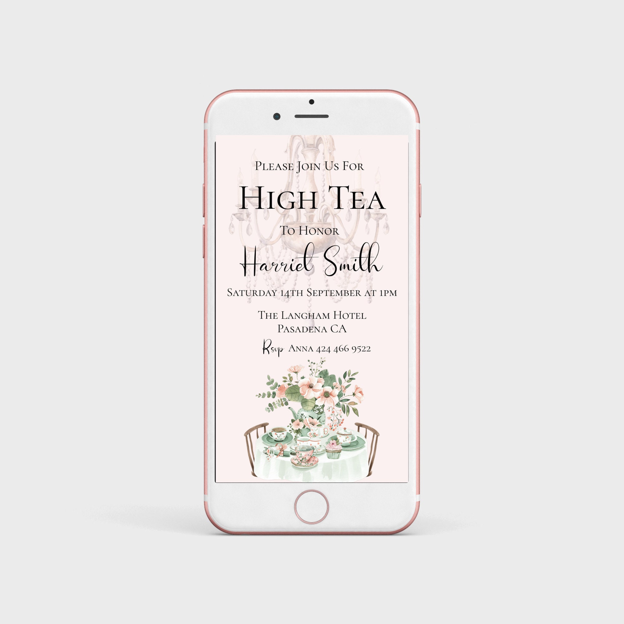 Bridal Shower High Tea Evite Template. An Instant download digital file for you to edit in your web browser with Templett straight after your purchase. Once personalized you are ready to sent.