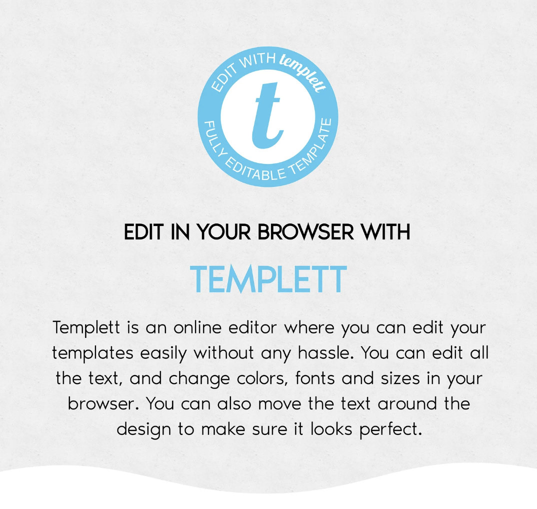 Once making your purchase, you will receive an email from Templett within a few minutes, click on the link that takes you directly to Templett where you can access your purchased files. Please note you will have to create an account if you do not already have one, then you can edit away, you can return and re edit anytime until you are happy. Be sure to save as you go. Once you are satisfied download and print yourself or professionally.