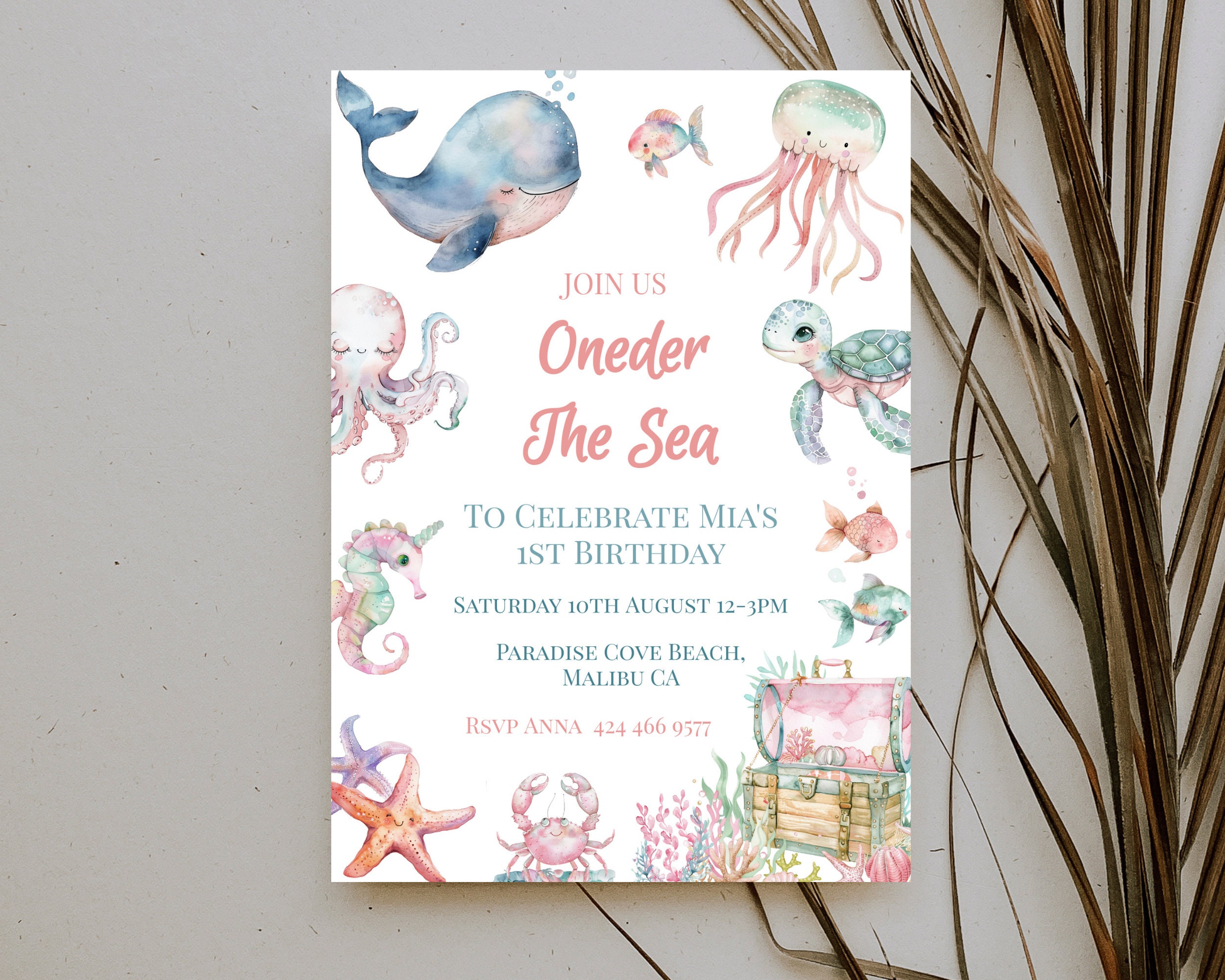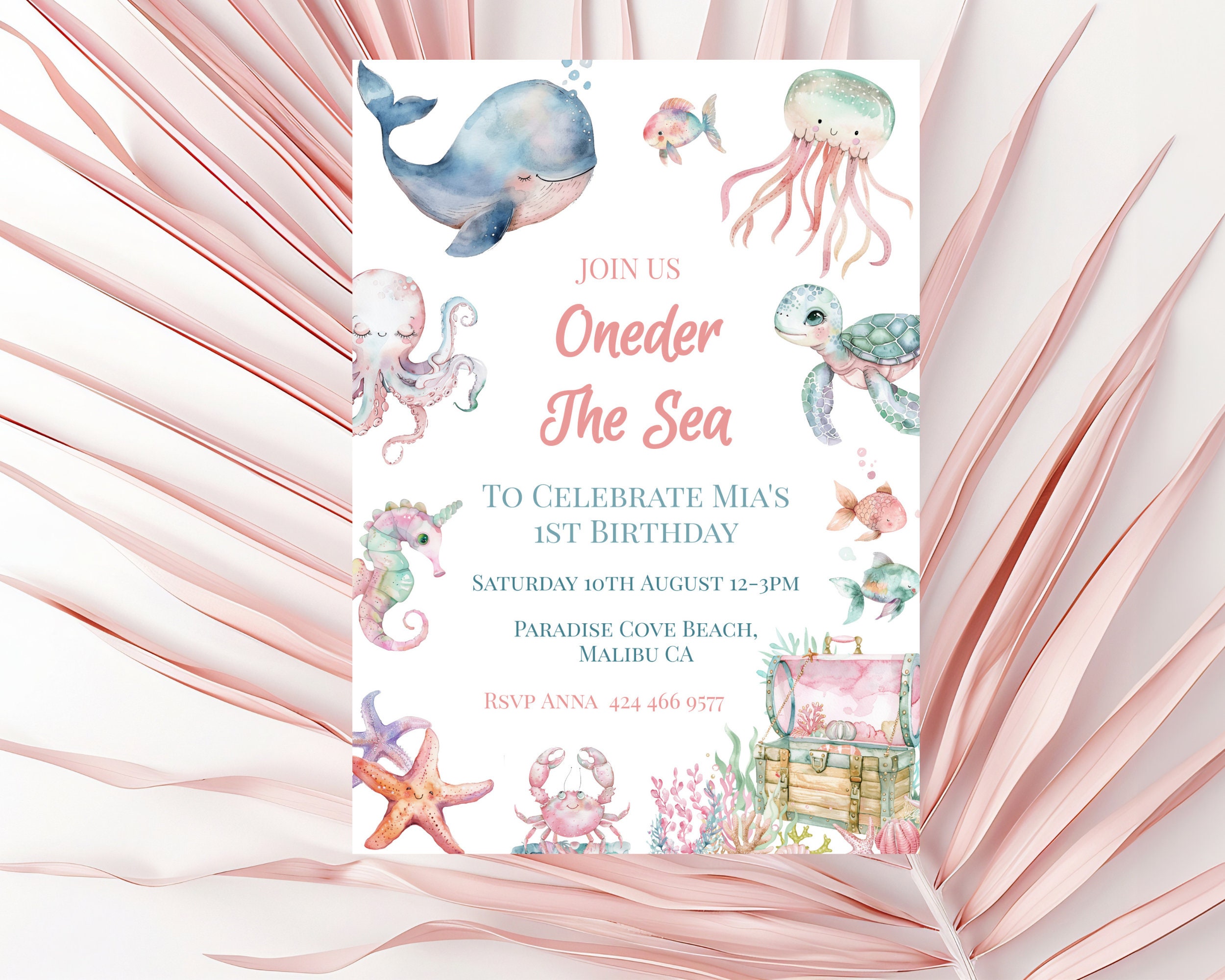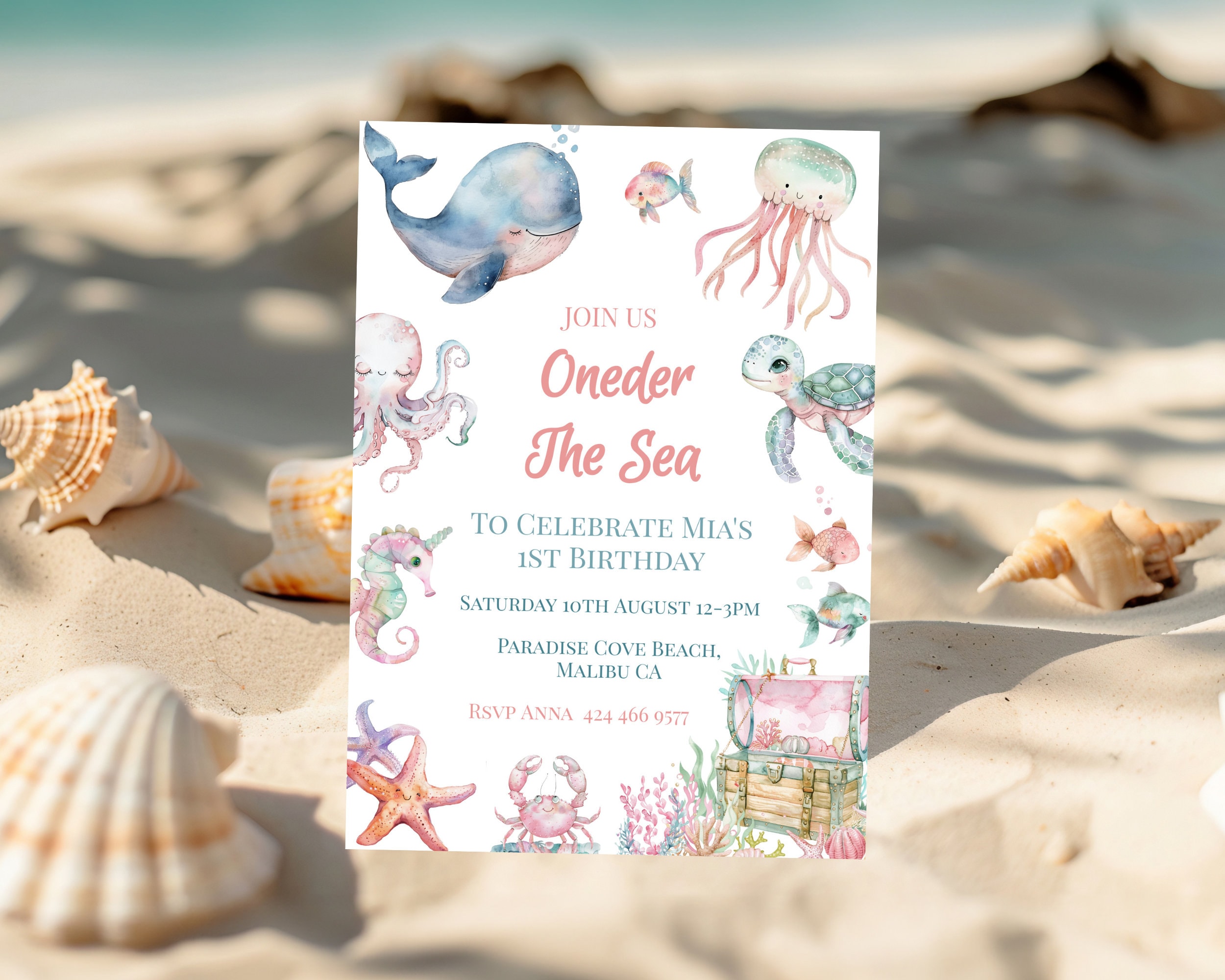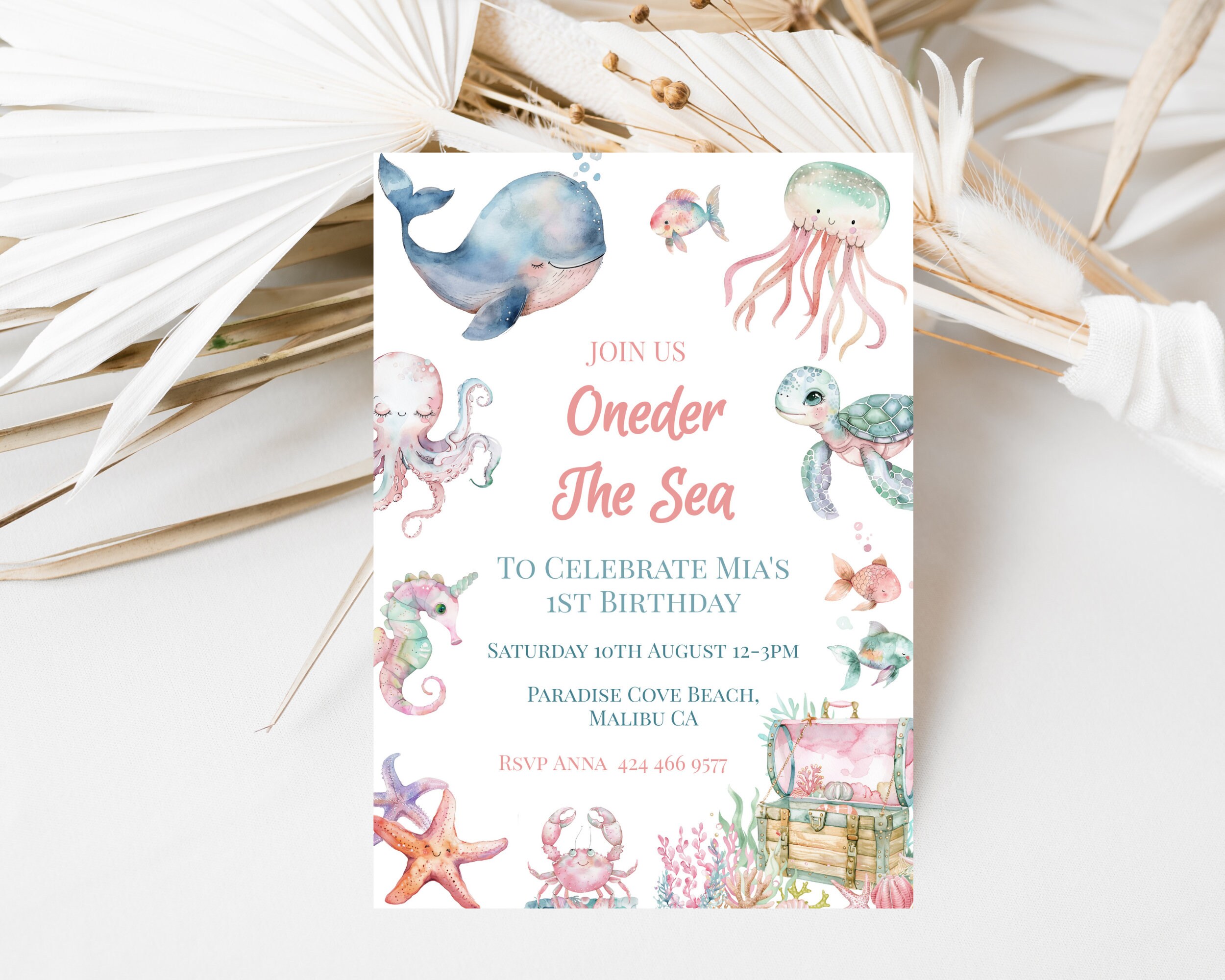 Oneder The Sea 1st Birthday Party Invitation. An Instant download digital file for you to edit in your web browser with Templett straight after your purchase. Once personalized you are ready to print.