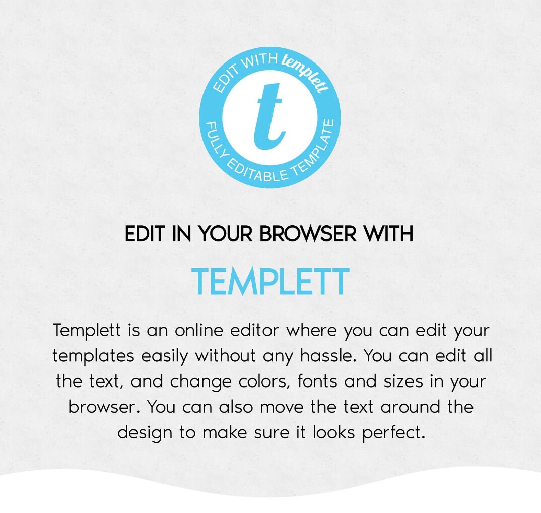 Once making your purchase, you will receive an email from Templett within a few minutes, click on the link that takes you directly to Templett where you can access your purchased files. Please note you will have to create an account if you do not already have one, then you can edit away, you can return and re edit anytime until you are happy. Be sure to save as you go. Once you are satisfied download and print yourself or professionally.
