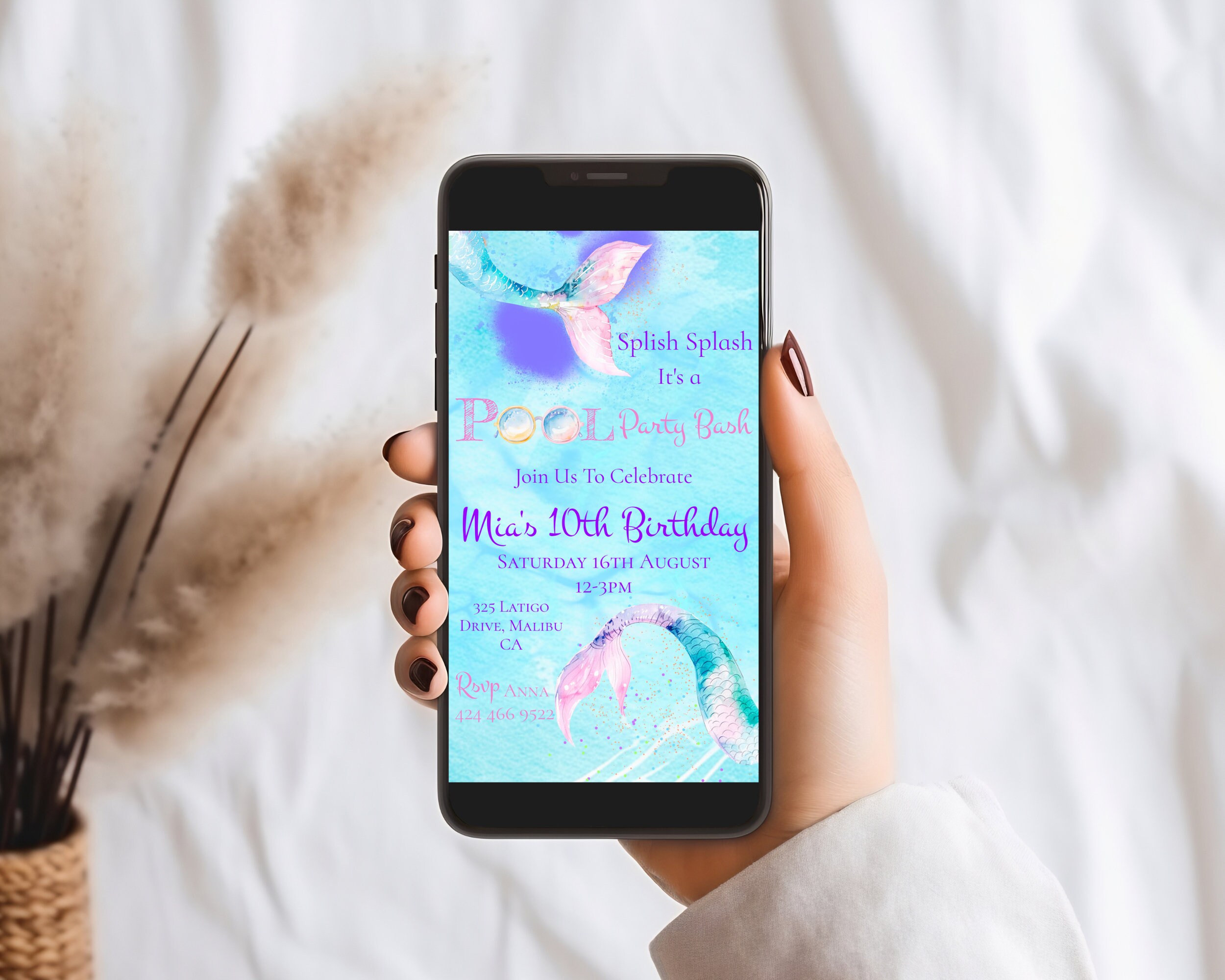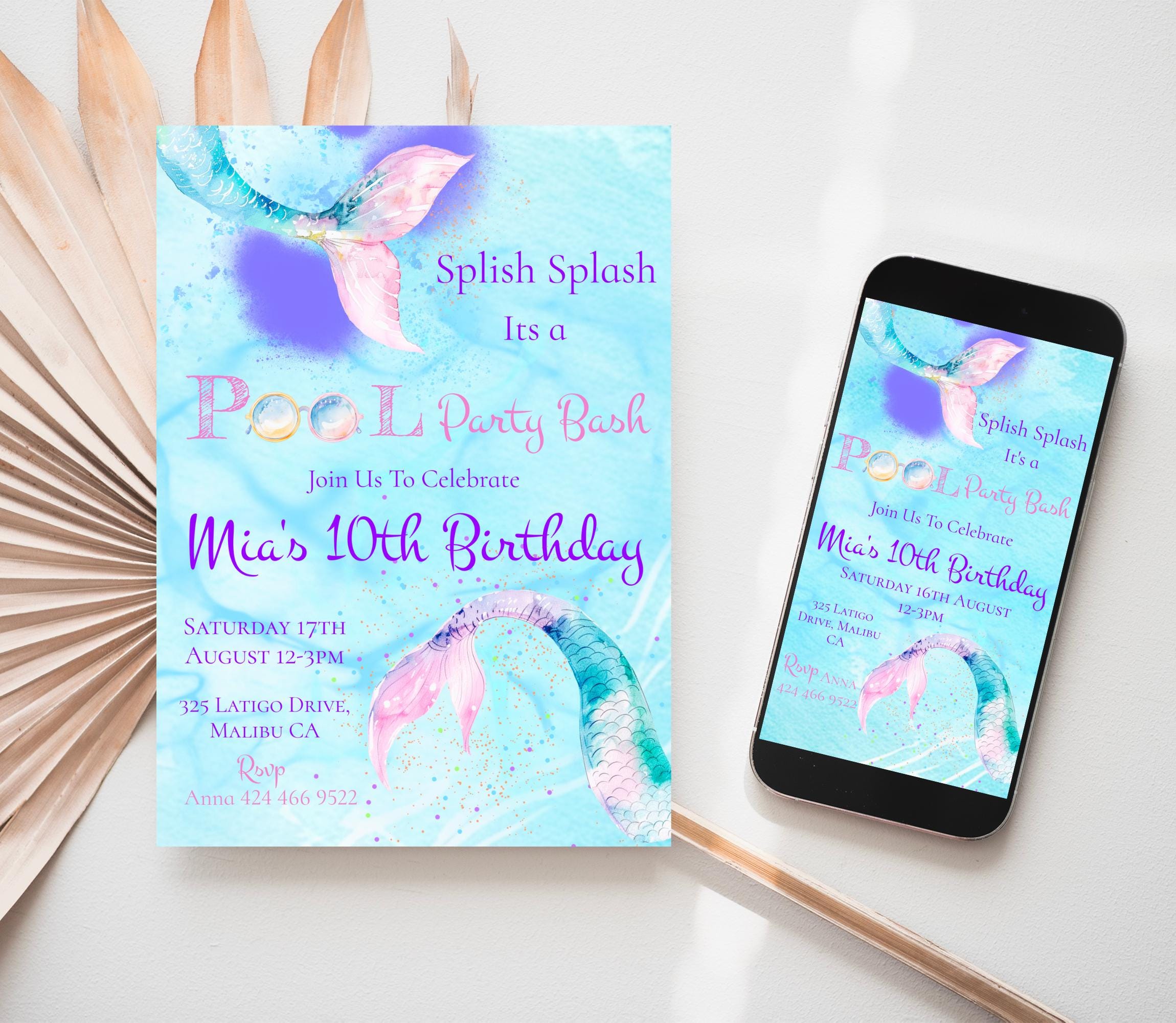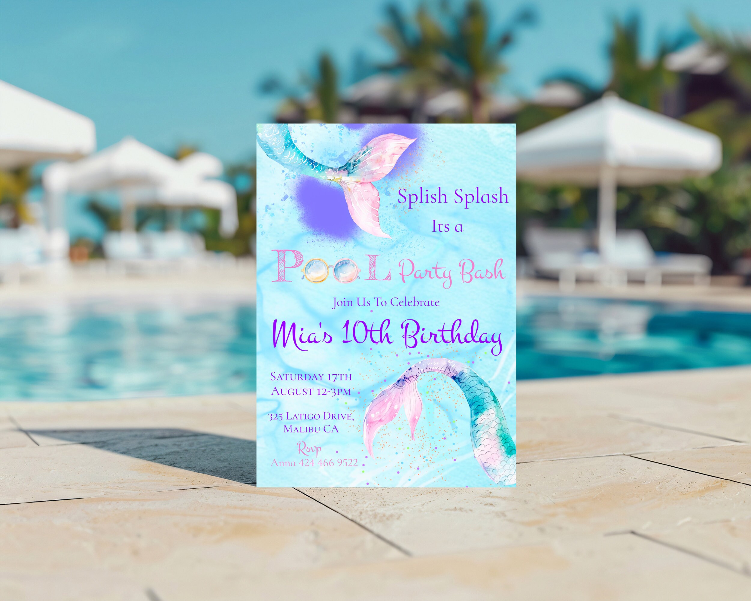 Mermaid Pool Birthday Pool Party Invitation. An Instant download digital file for you to edit in your web browser with Templett straight after your purchase. Once personalized you are ready to print.