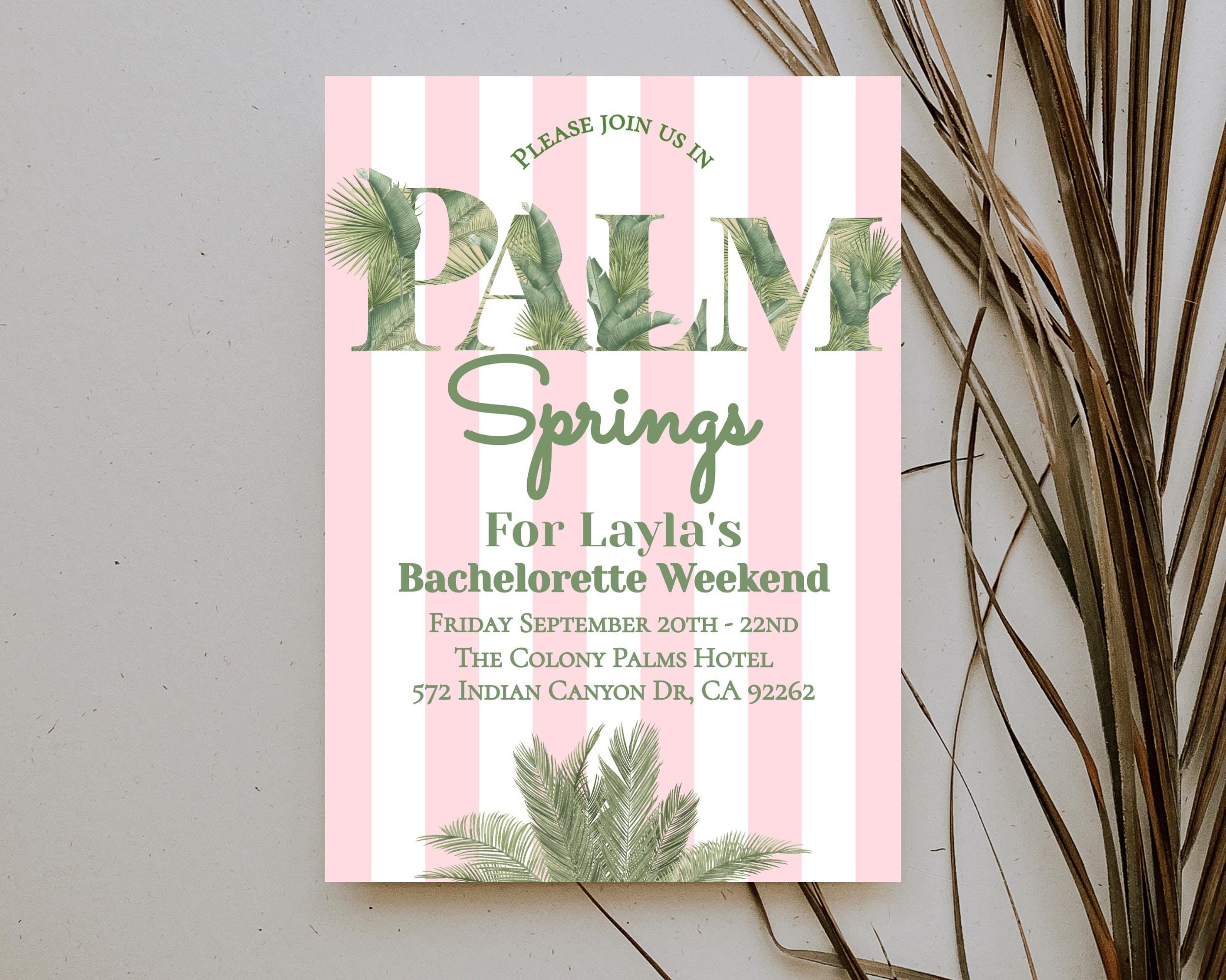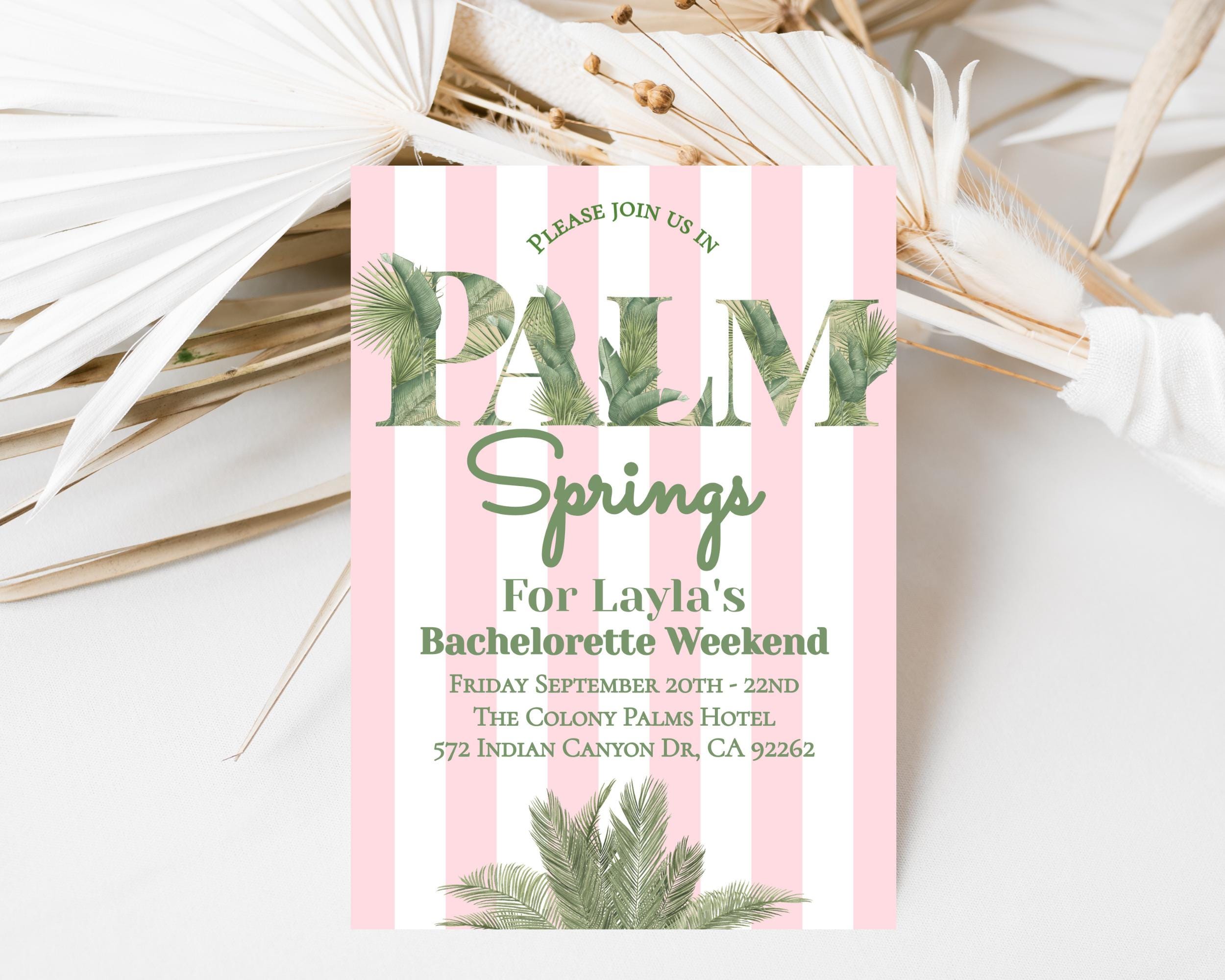 Palm springs Bachelorette Party Invitation. An Instant download digital file for you to edit in your web browser with Templett straight after your purchase. Once personalized you are ready to print.