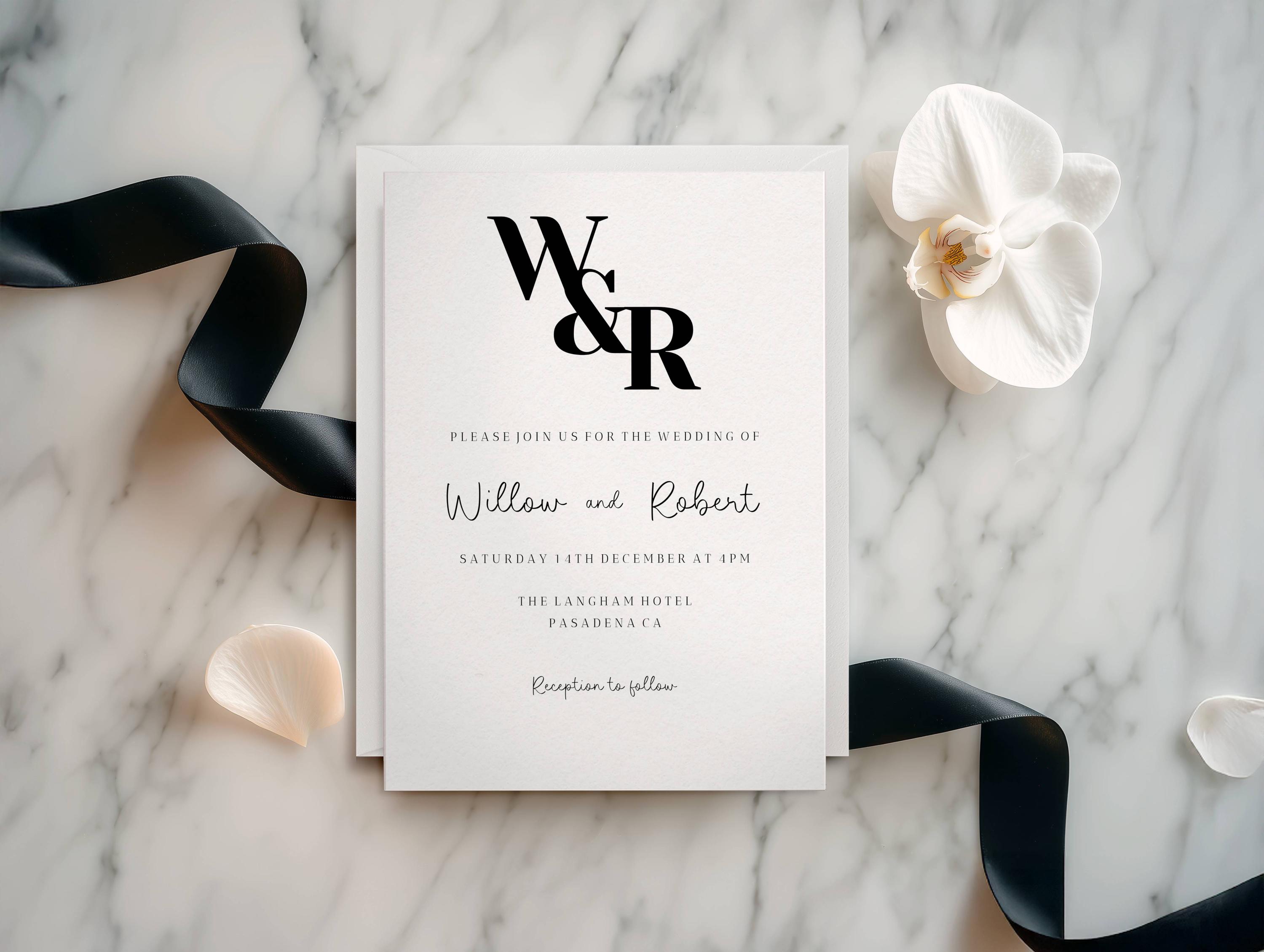 Modern Black Wedding Invitation Template Set. An Instant download digital file for you to edit in your web browser with Templett straight after your purchase. Once personalized you are ready to print.