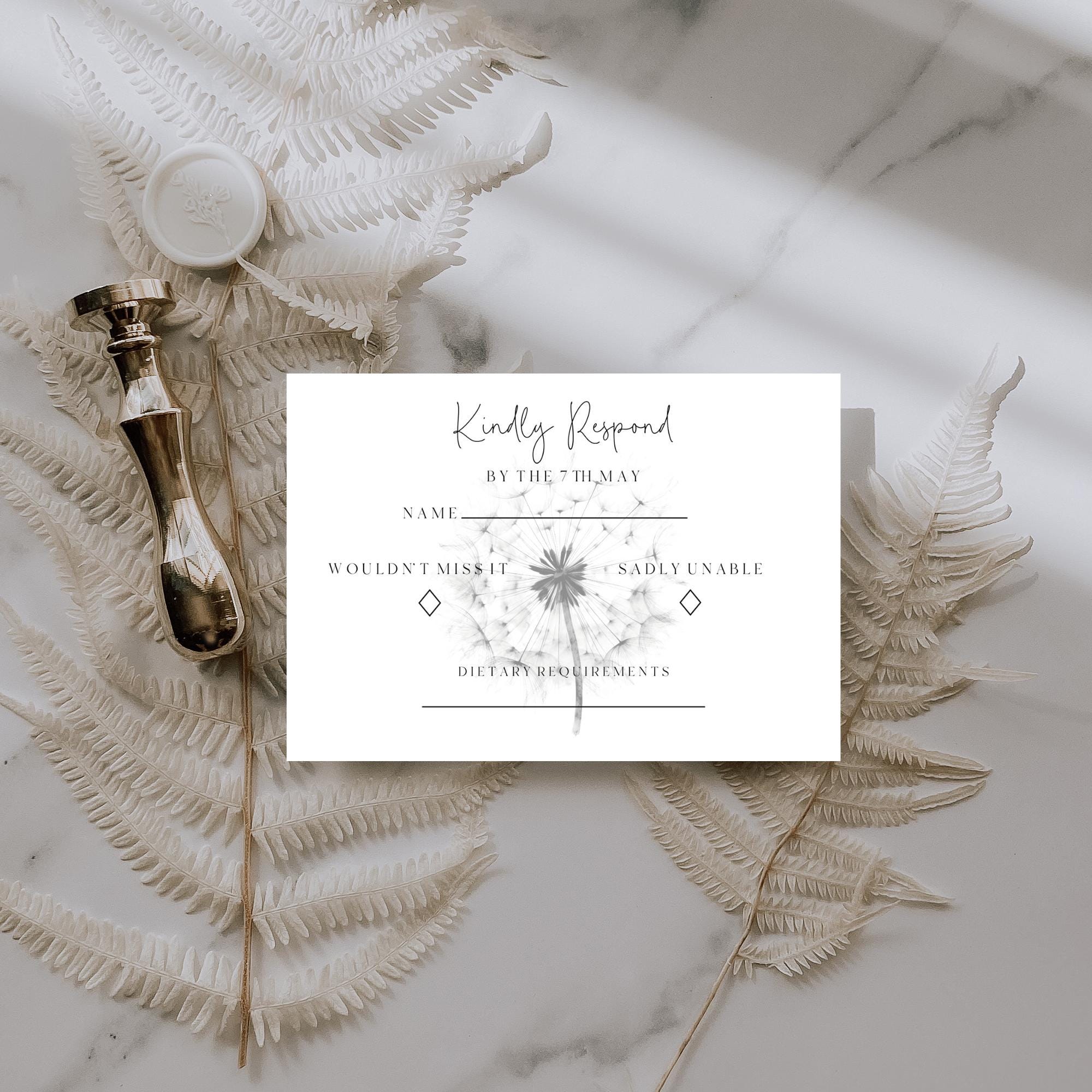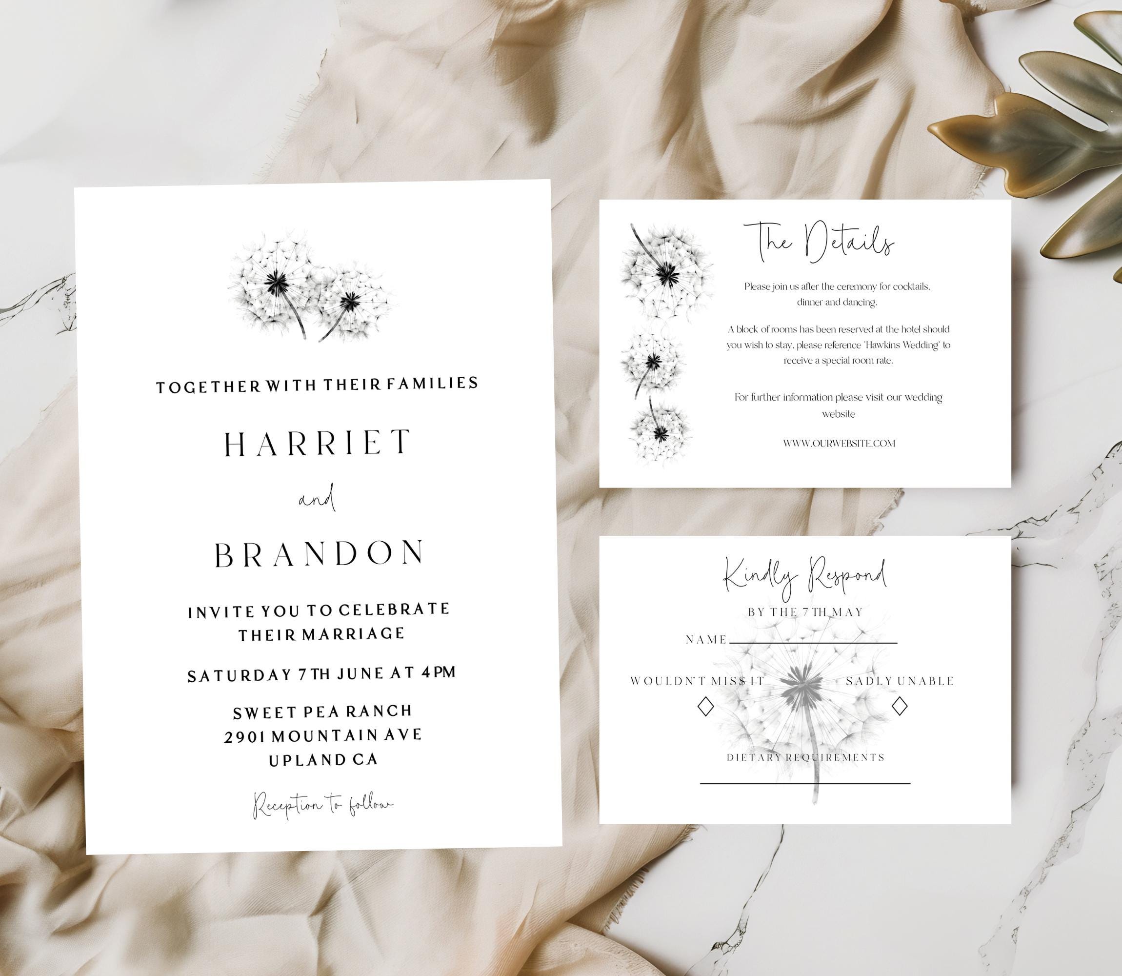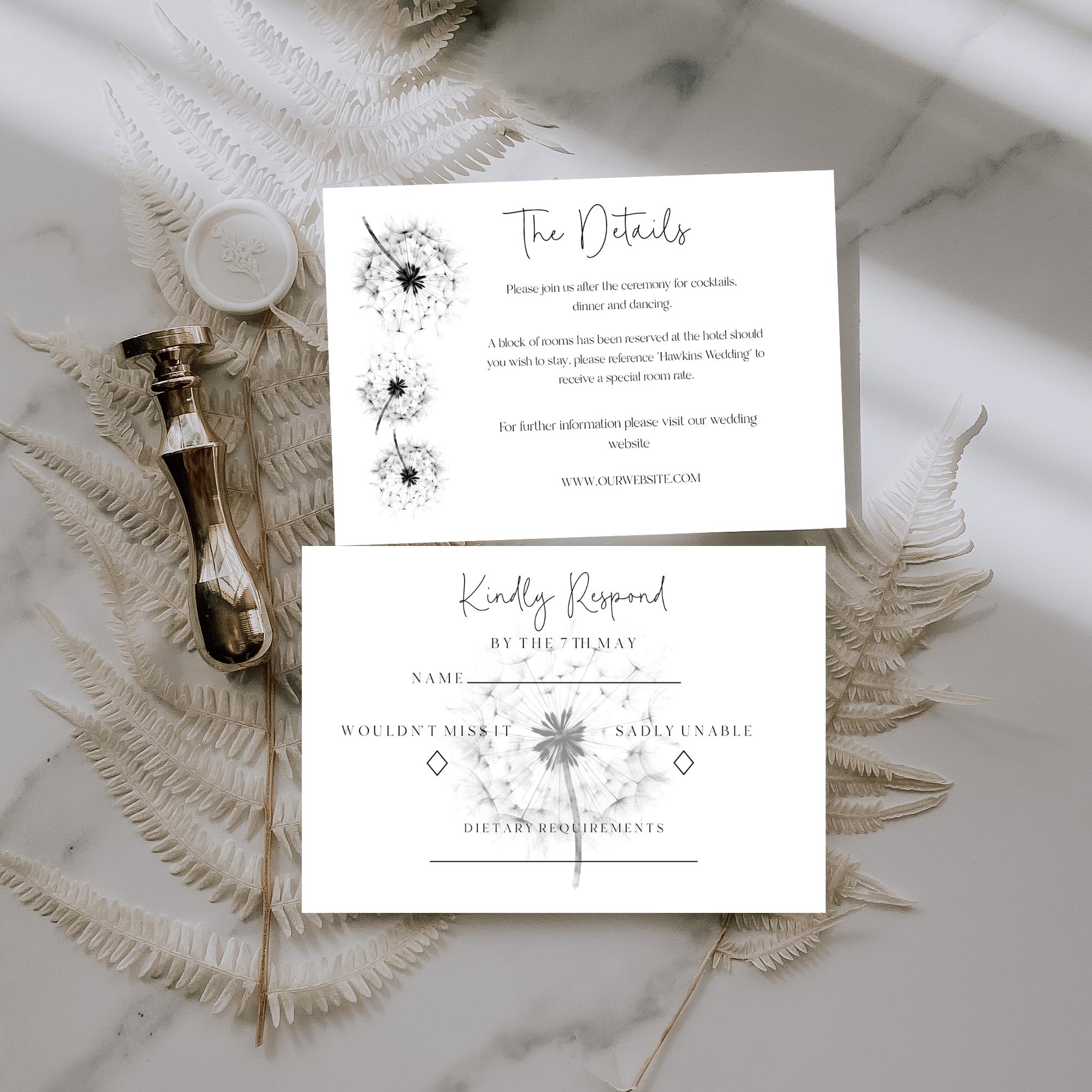 Modern Black and White Dandelion Wedding Invitation Template Set. An Instant download digital file for you to edit in your web browser with Templett straight after your purchase. Once personalized you are ready to print.