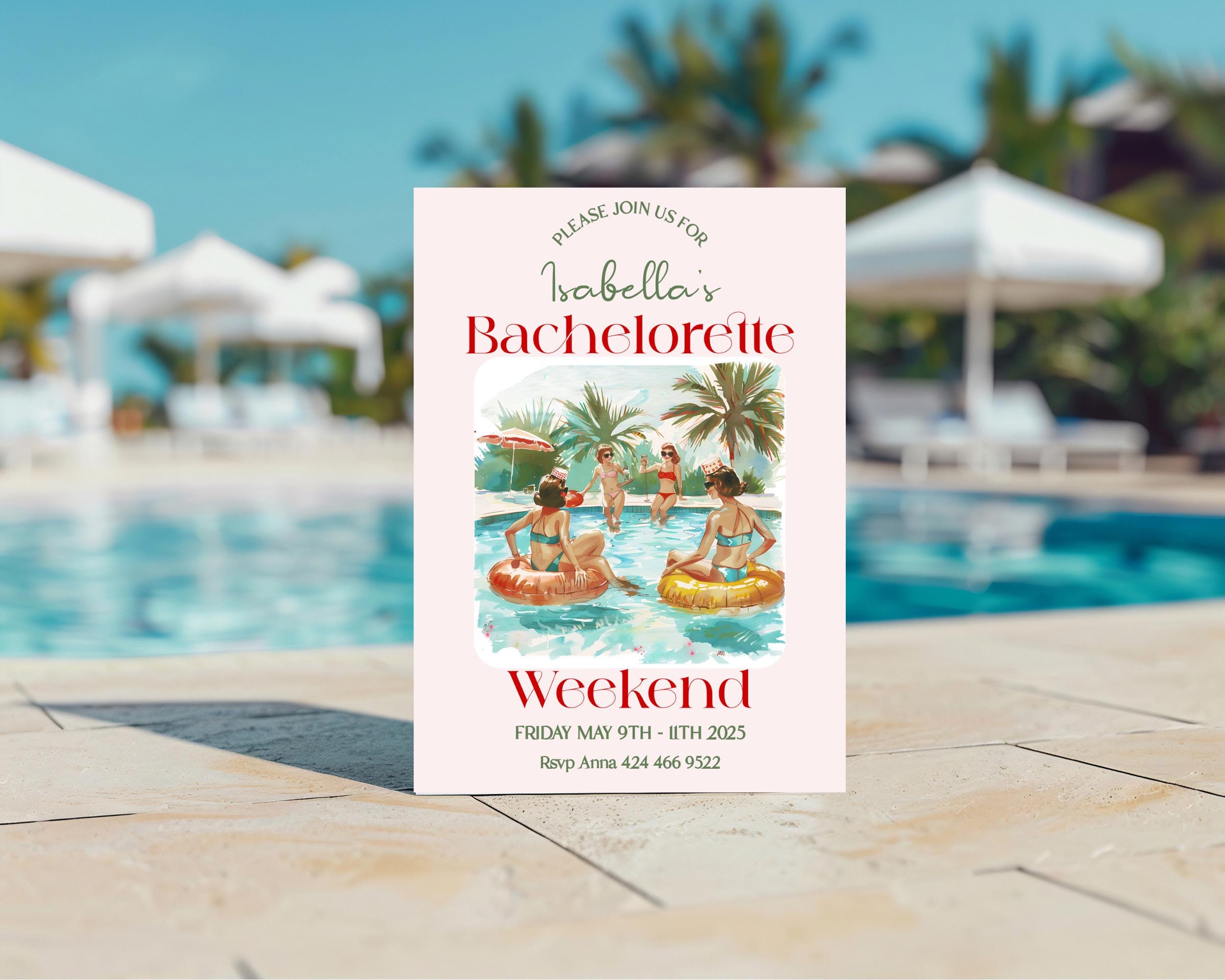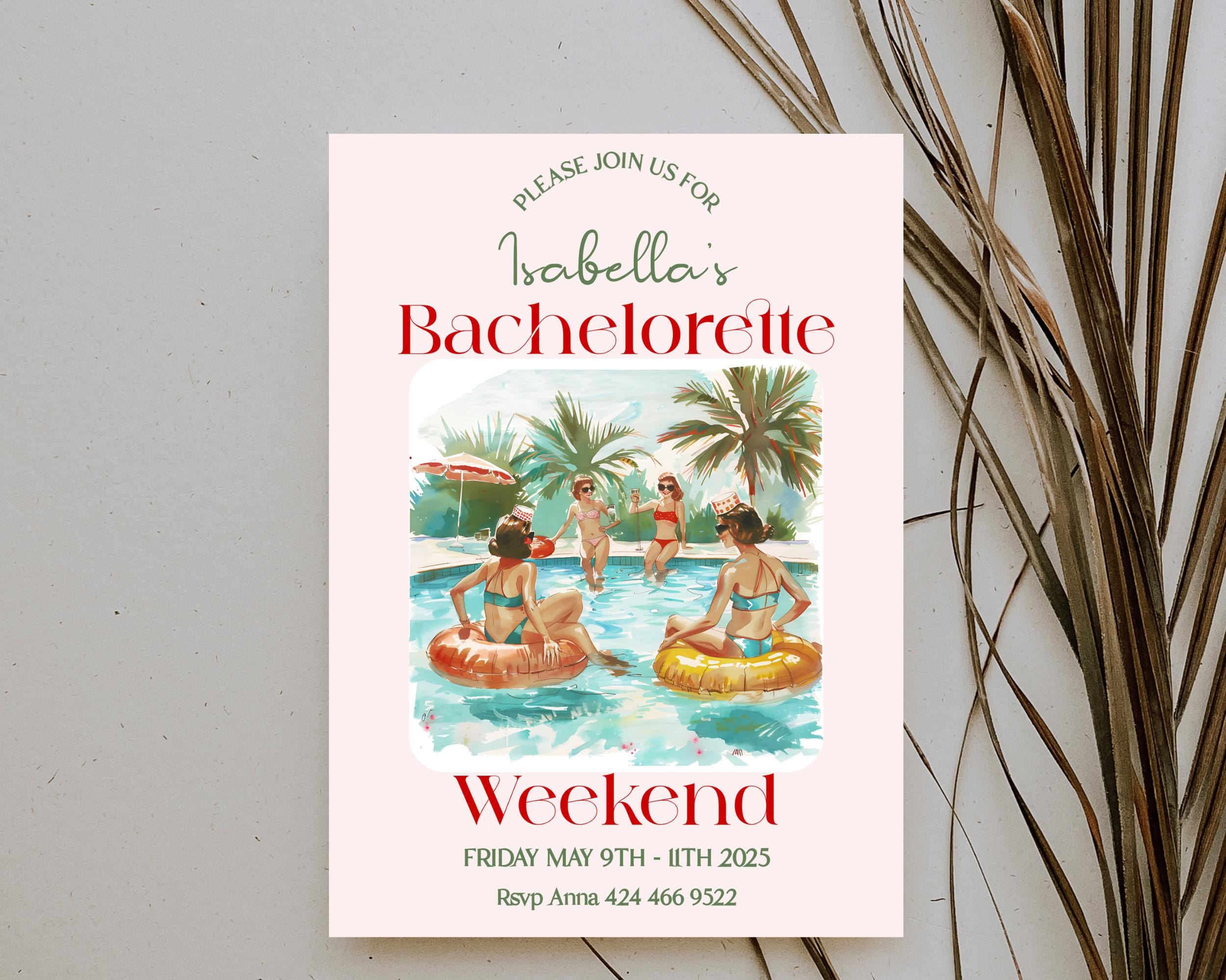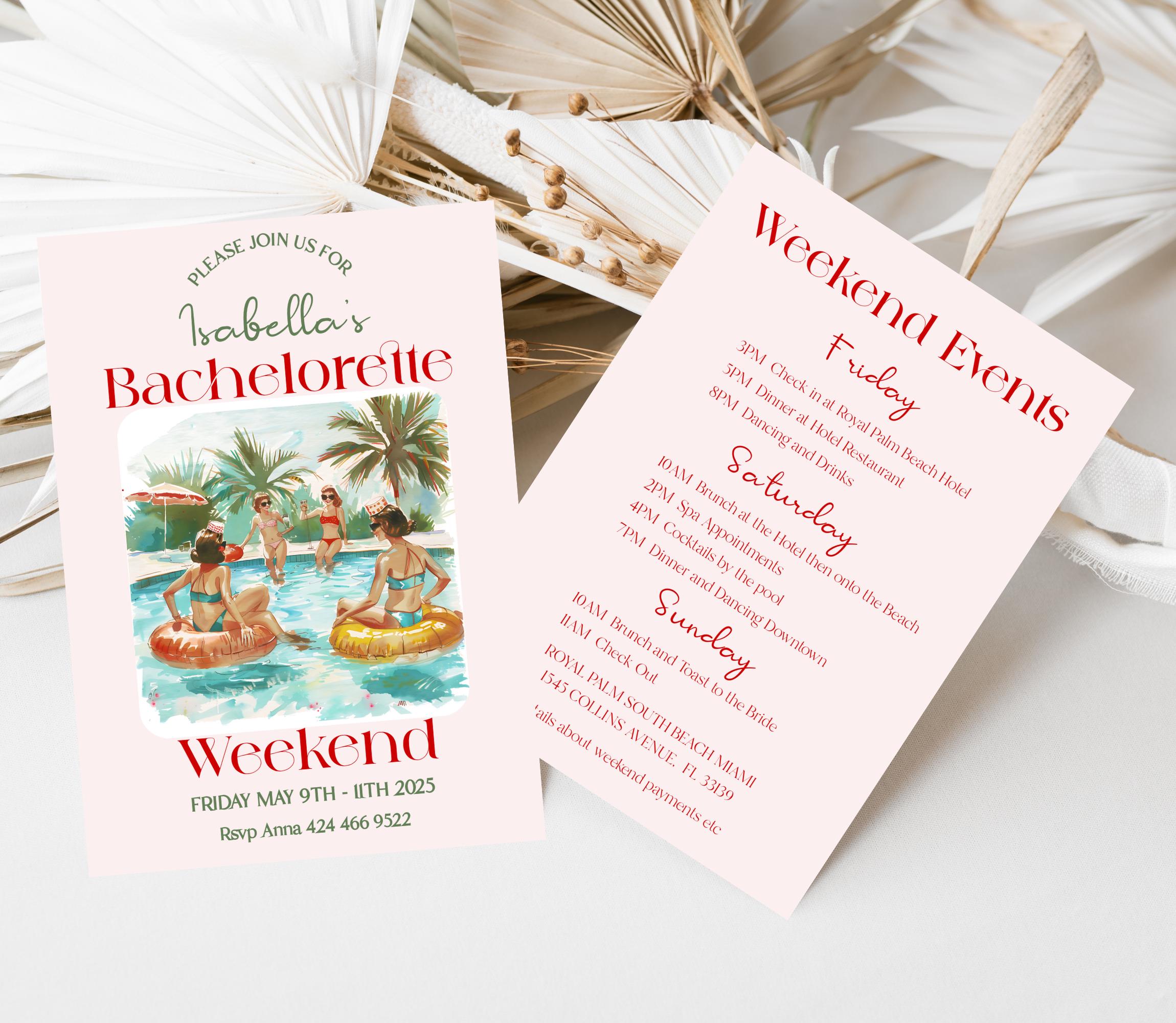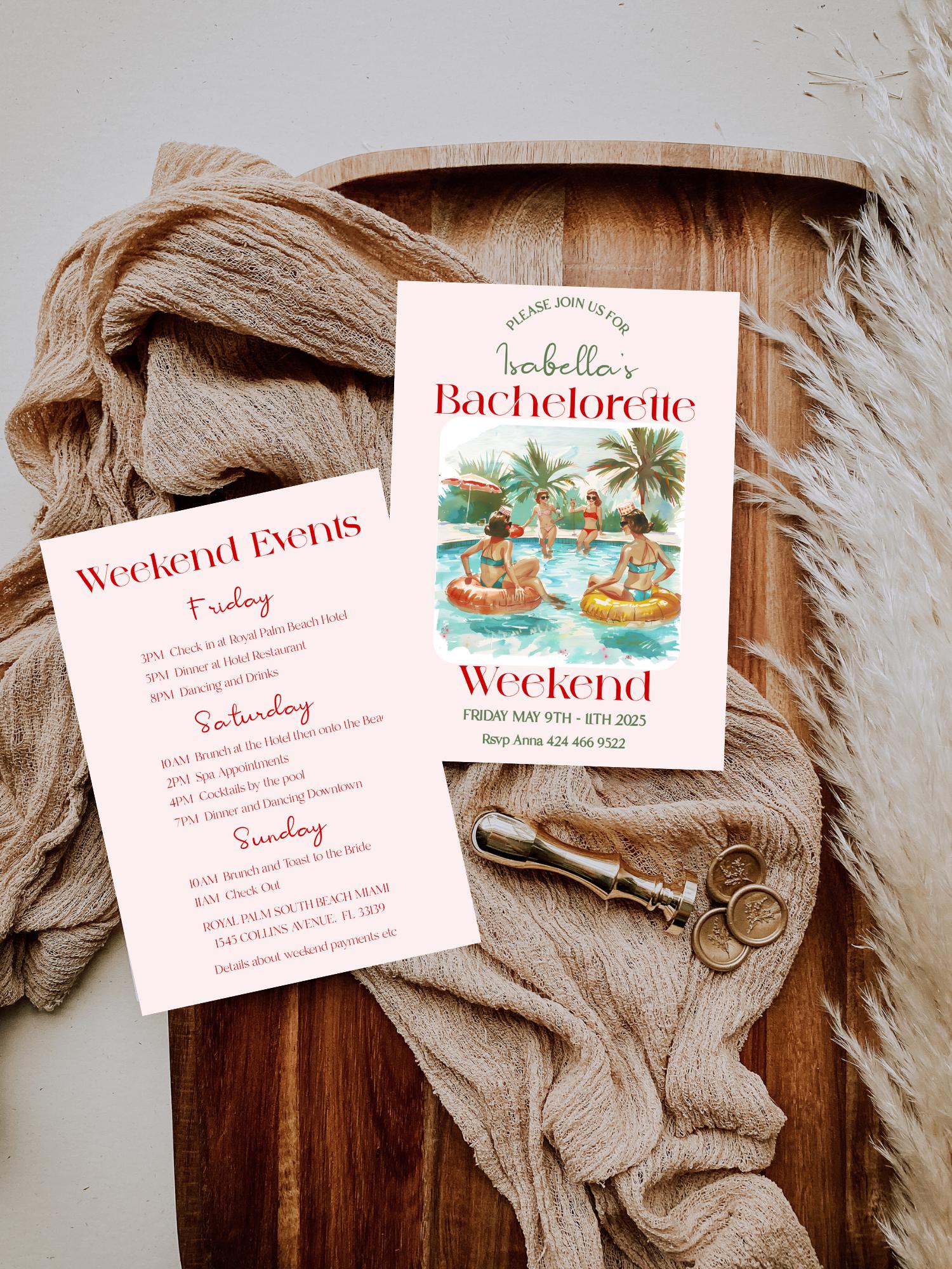 Retro Bachelorette Party Weekend Invitation Template. An Instant download digital file for you to edit in your web browser with Templett straight after your purchase. Once personalized you are ready to print.