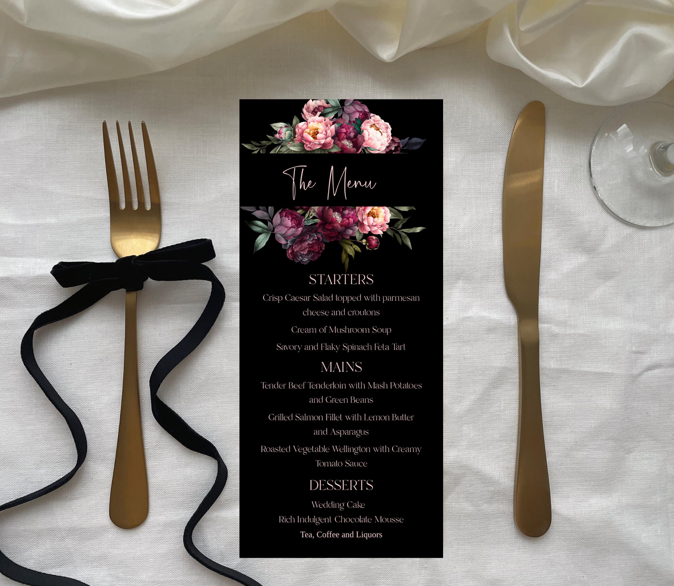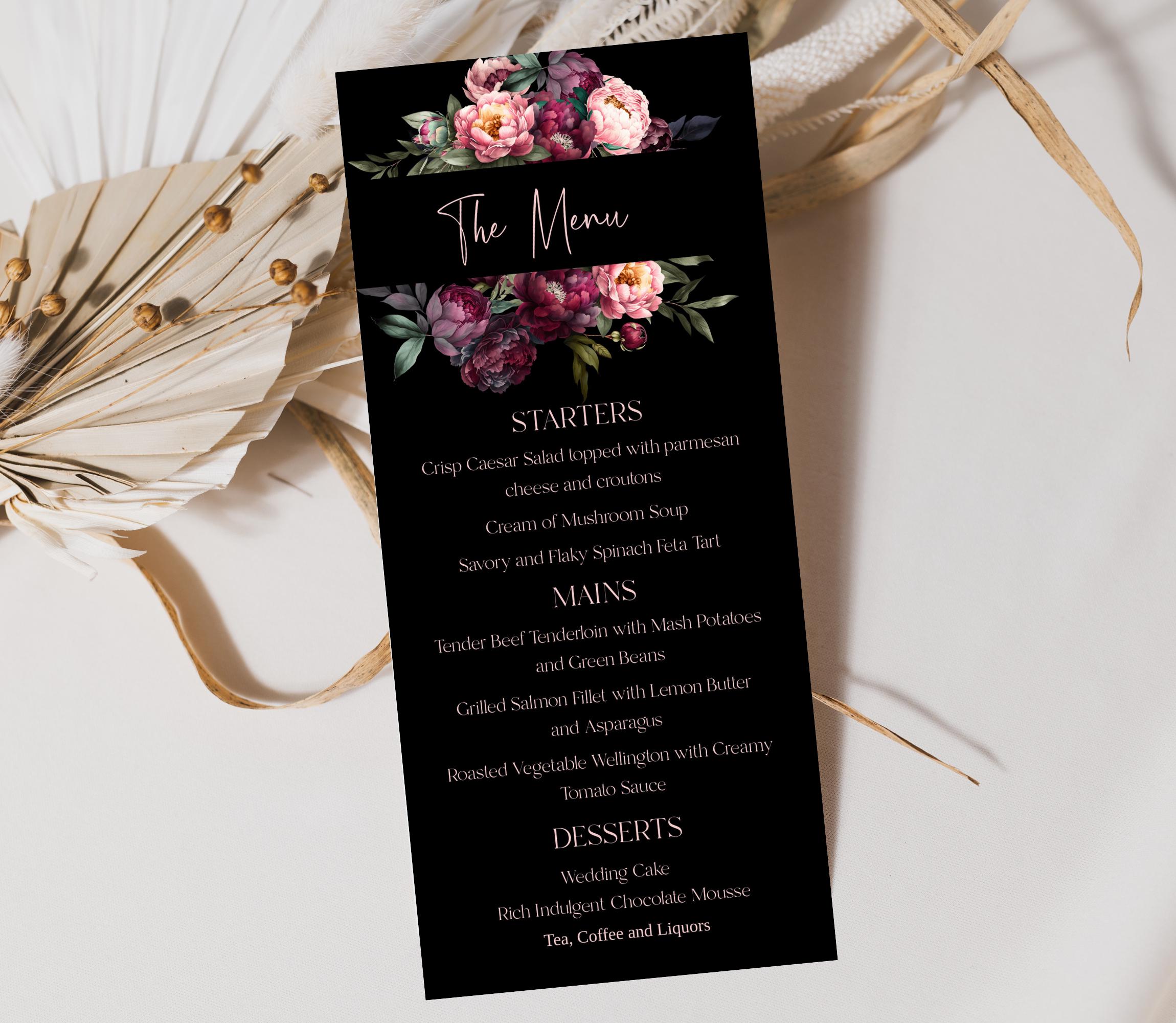 Elegant Black and Blush Floral Wedding Menu Template. An Instant download digital file for you to edit in your web browser with Templett straight after your purchase. Once personalized you are ready to print.