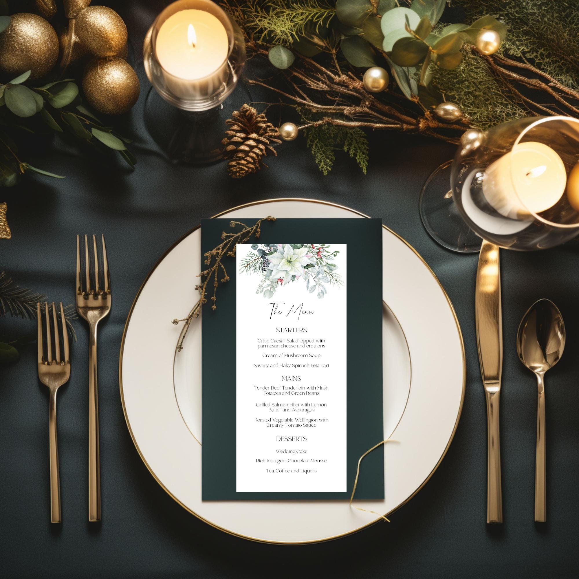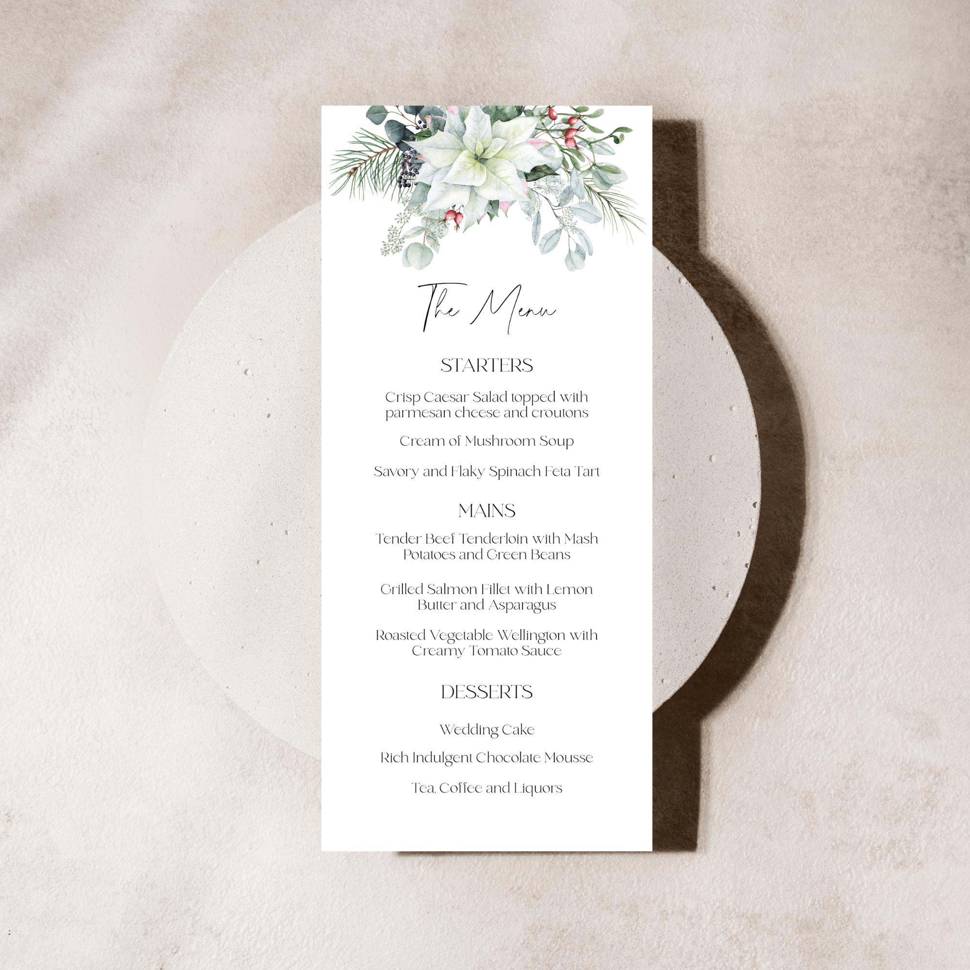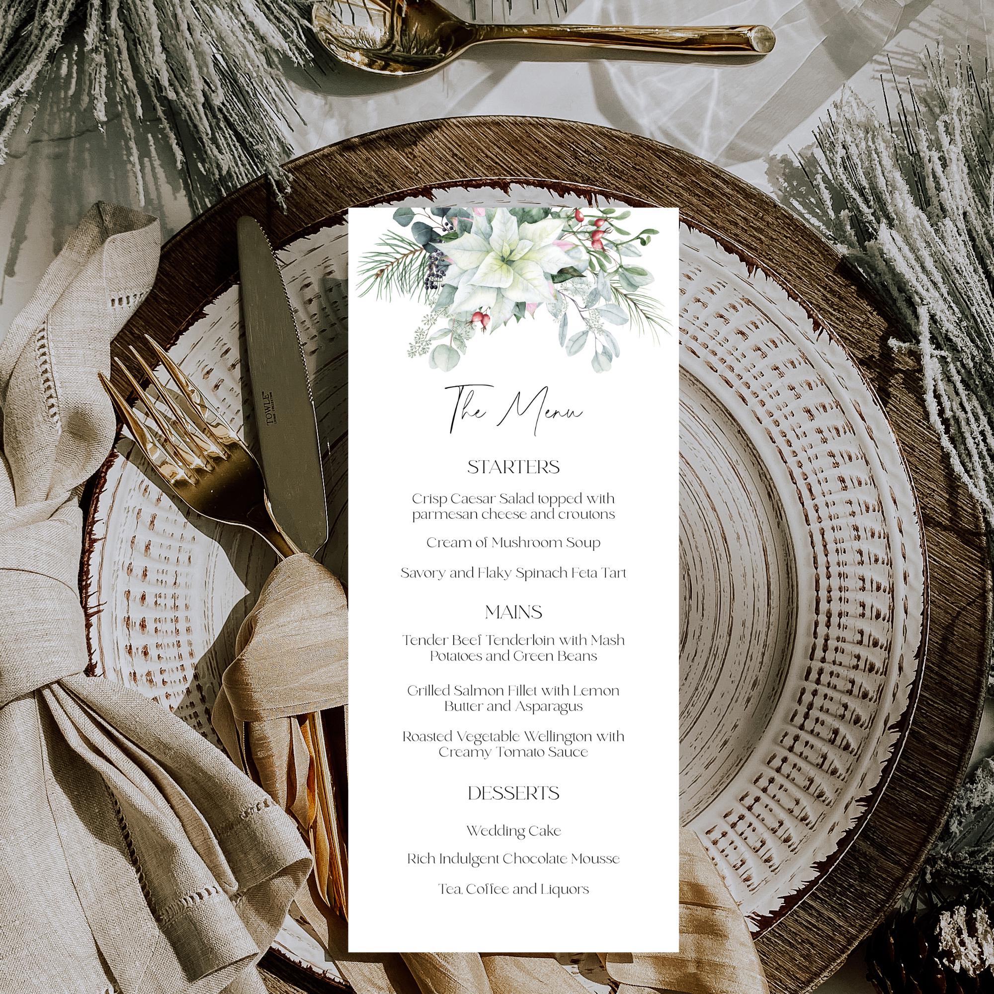Winter Florals xmas Wedding Menu Template. An Instant download digital file for you to edit in your web browser with Templett straight after your purchase. Once personalized you are ready to print.