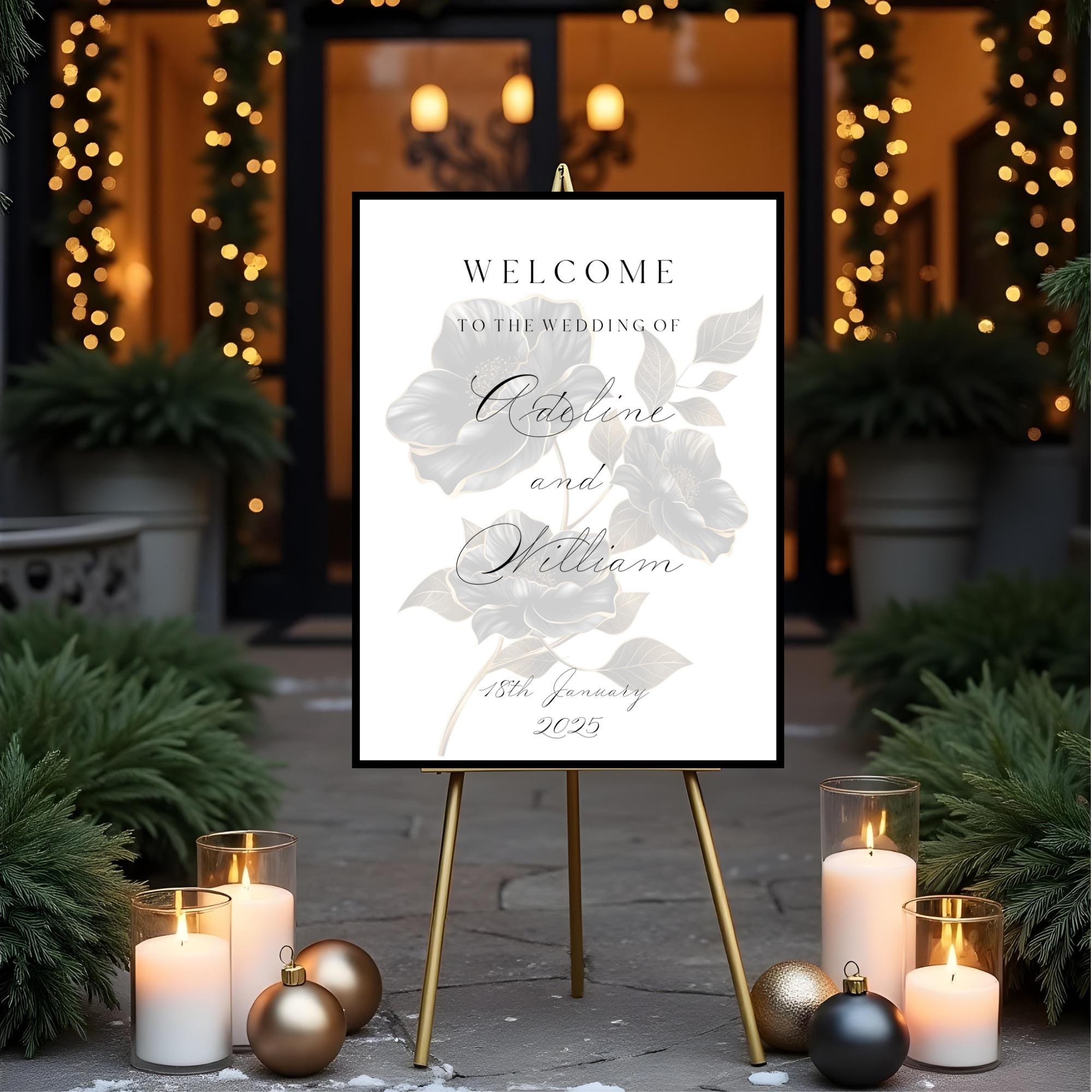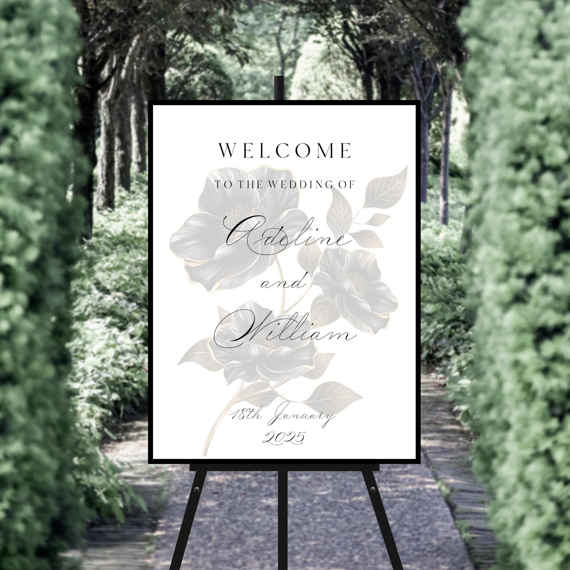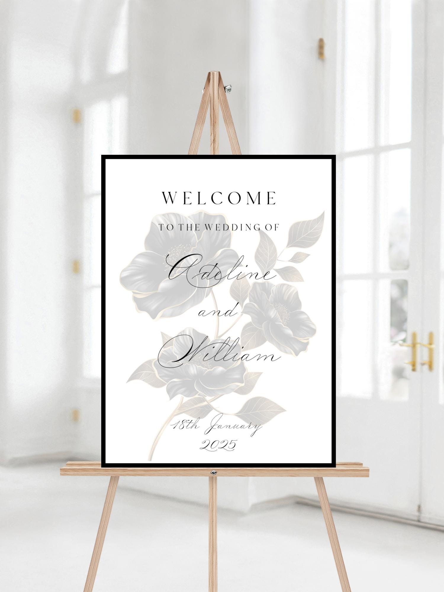 Black and white Wedding Welcome Sign Template. An Instant download digital file for you to edit in your web browser with Templett straight after your purchase. Once personalized you are ready to print.
