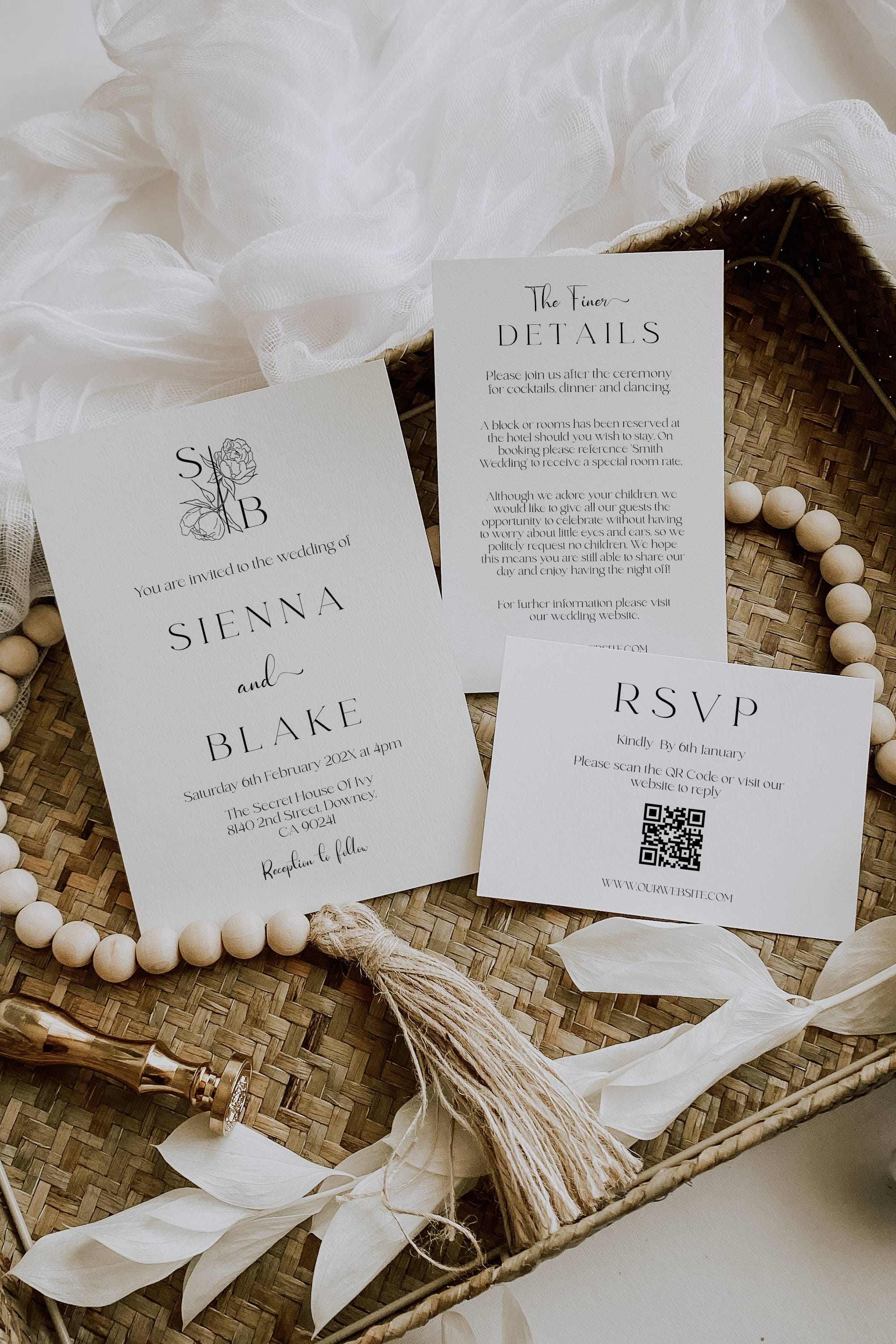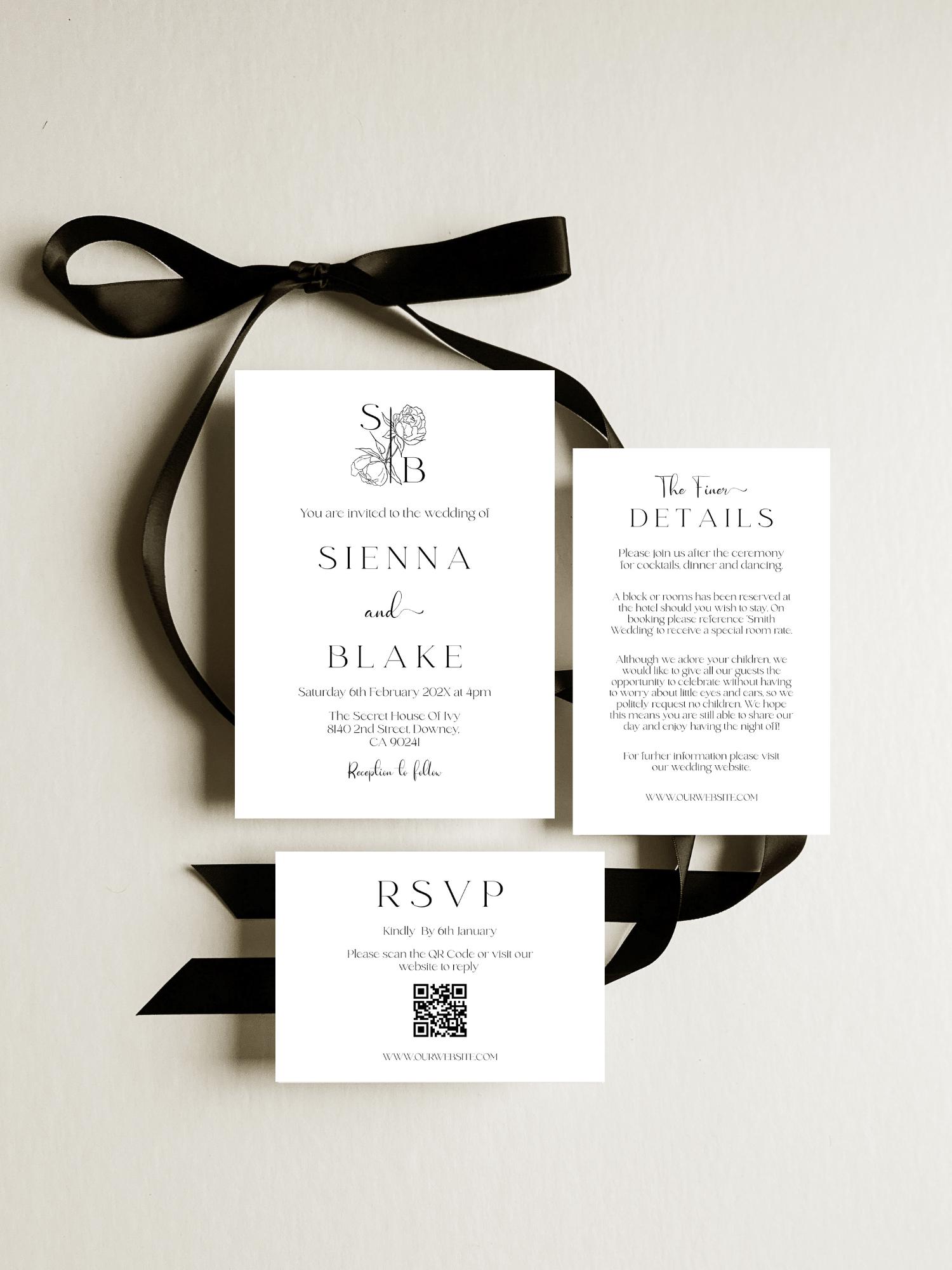 Elegant Black and white Wedding Invitation Set Template. An Instant download digital file for you to edit in your web browser with Templett straight after your purchase. Once personalized you are ready to print.