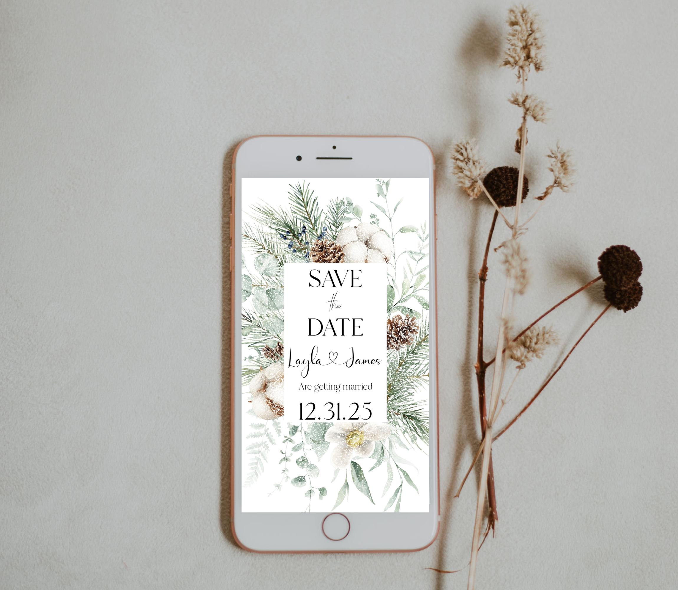 Winter Foliage Save The Date Evite Template. An Instant download digital file for you to edit in your web browser with Templett straight after your purchase. Once personalized you are ready to print.
