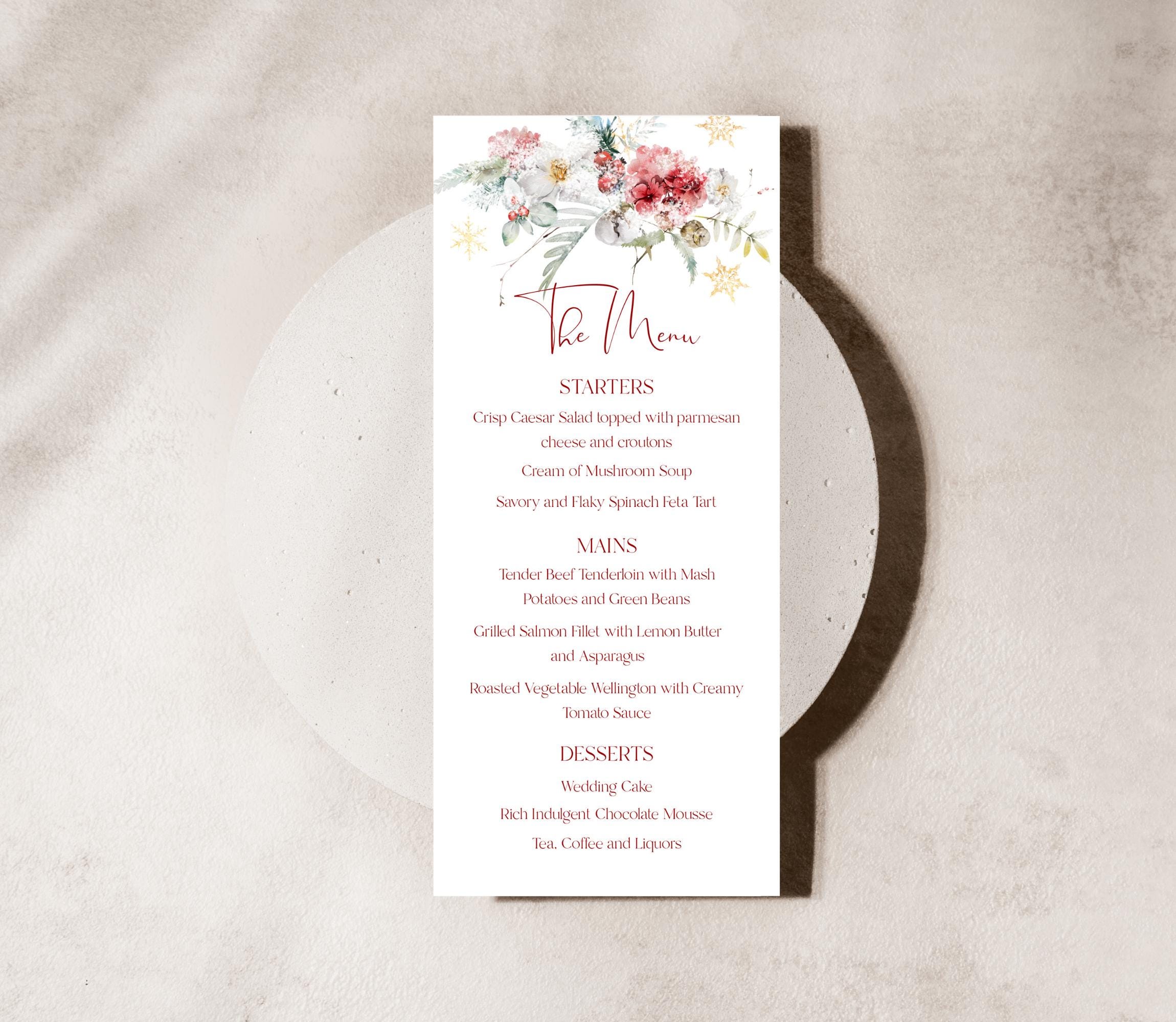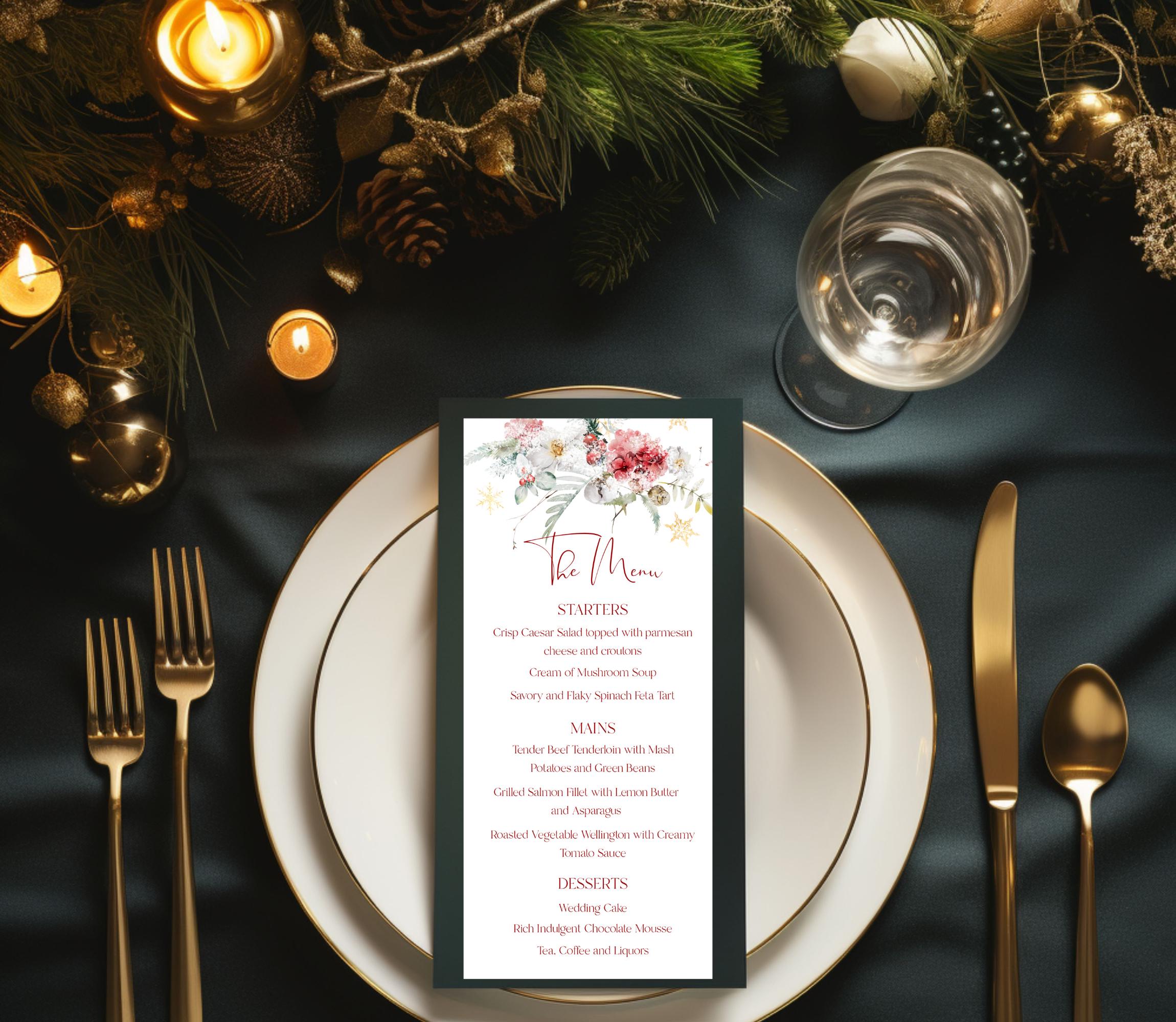 Elegant Xmas Foliage Menu Template. An Instant download digital file for you to edit in your web browser with Templett straight after your purchase. Once personalized you are ready to print.