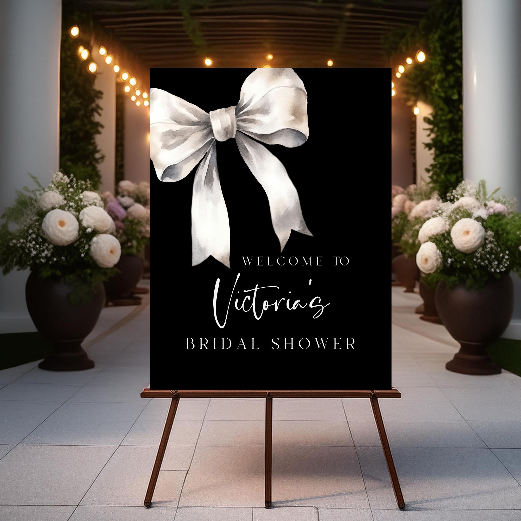 Modern Black Bow Bridal Shower Welcome Sign Template. An Instant download digital file for you to edit in your web browser with Templett straight after your purchase. Once personalized you are ready to print.