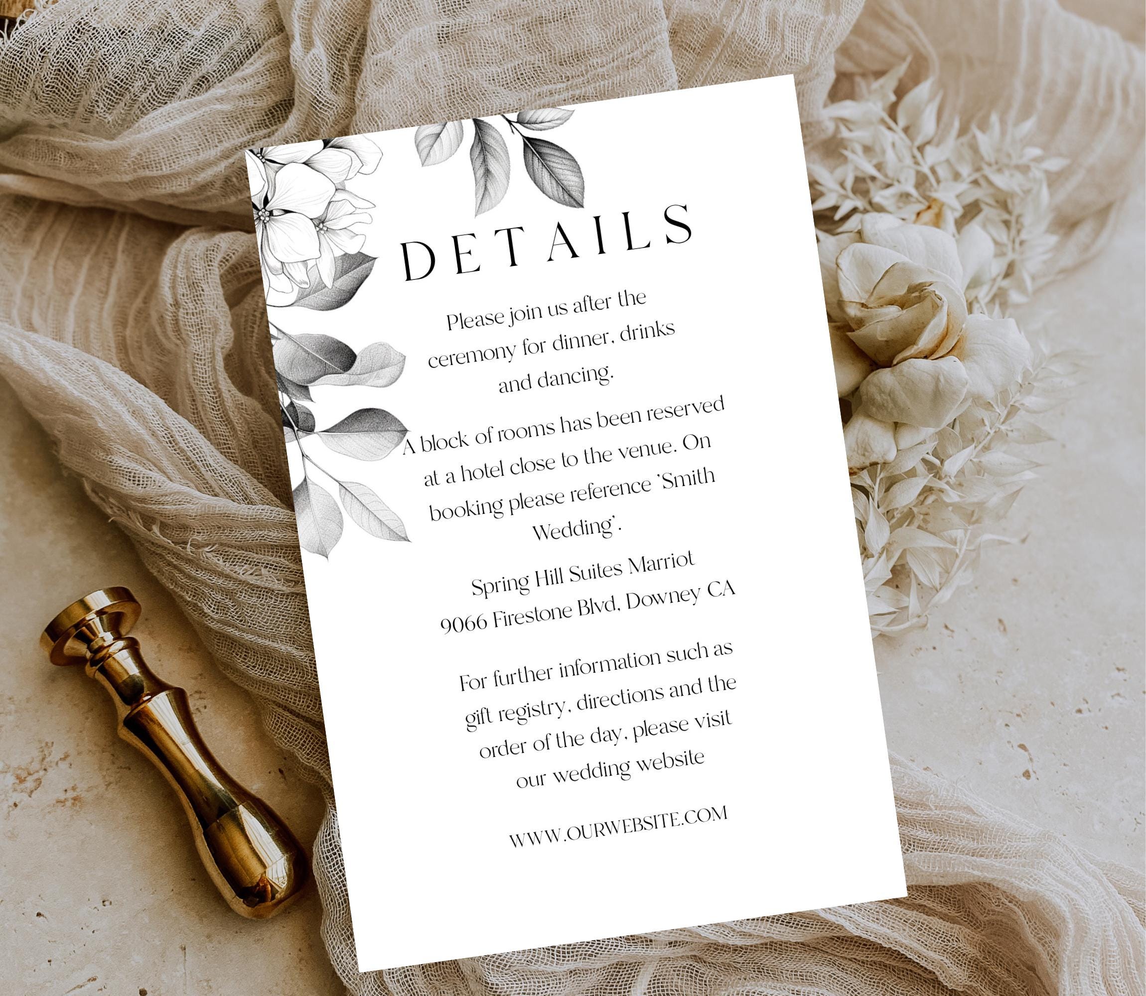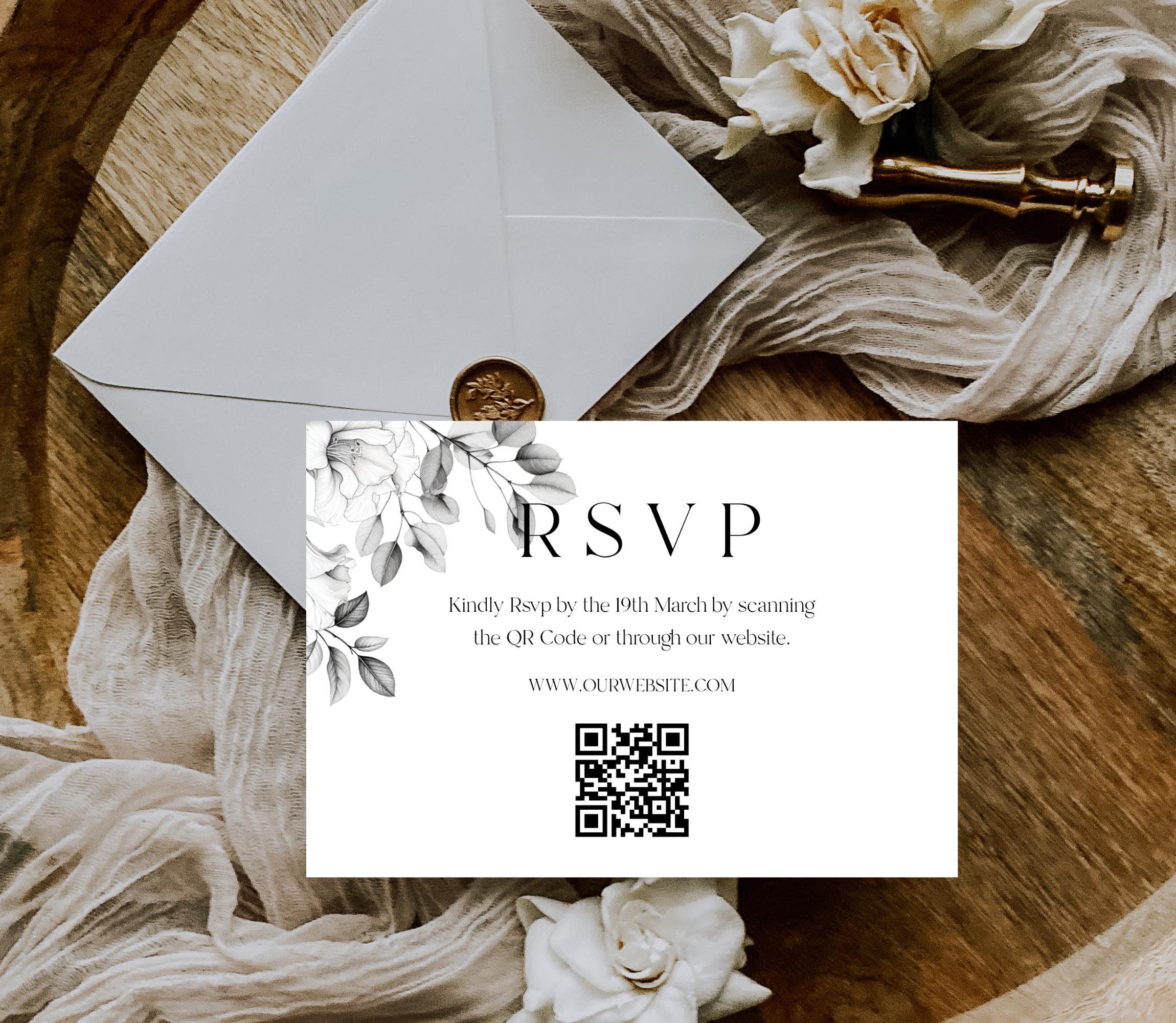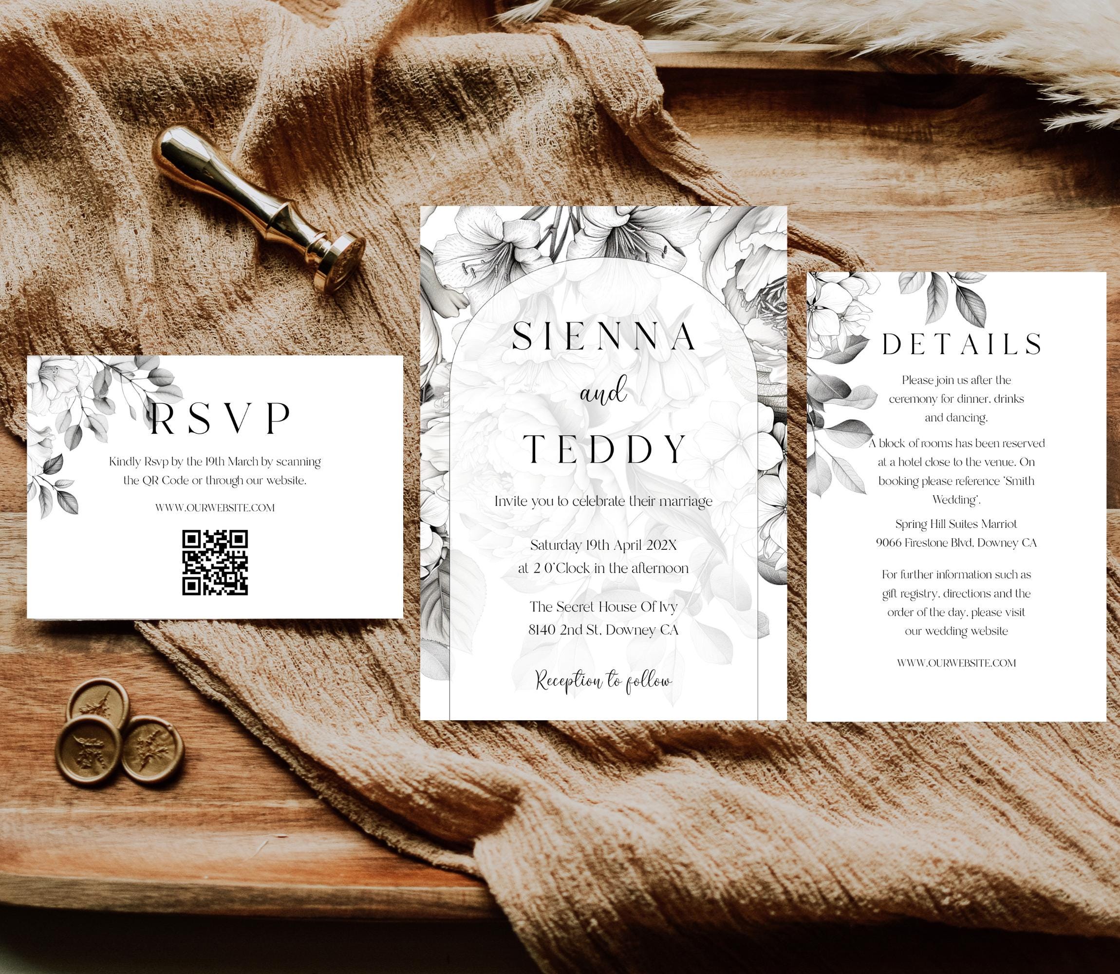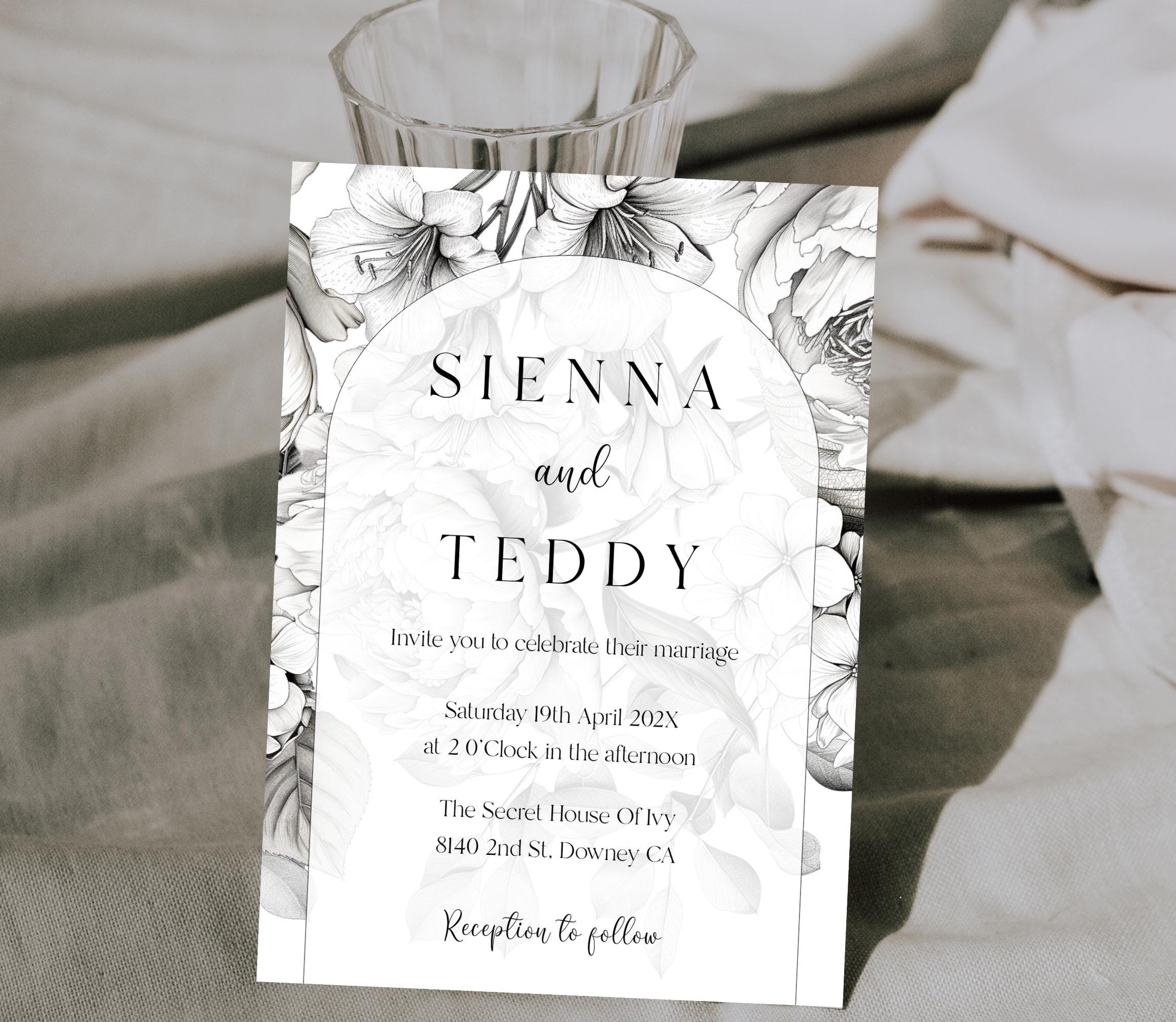 Elegant Black and white Floral Wedding Invitation Template. An Instant download digital file for you to edit in your web browser with Templett straight after your purchase. Once personalized you are ready to print.