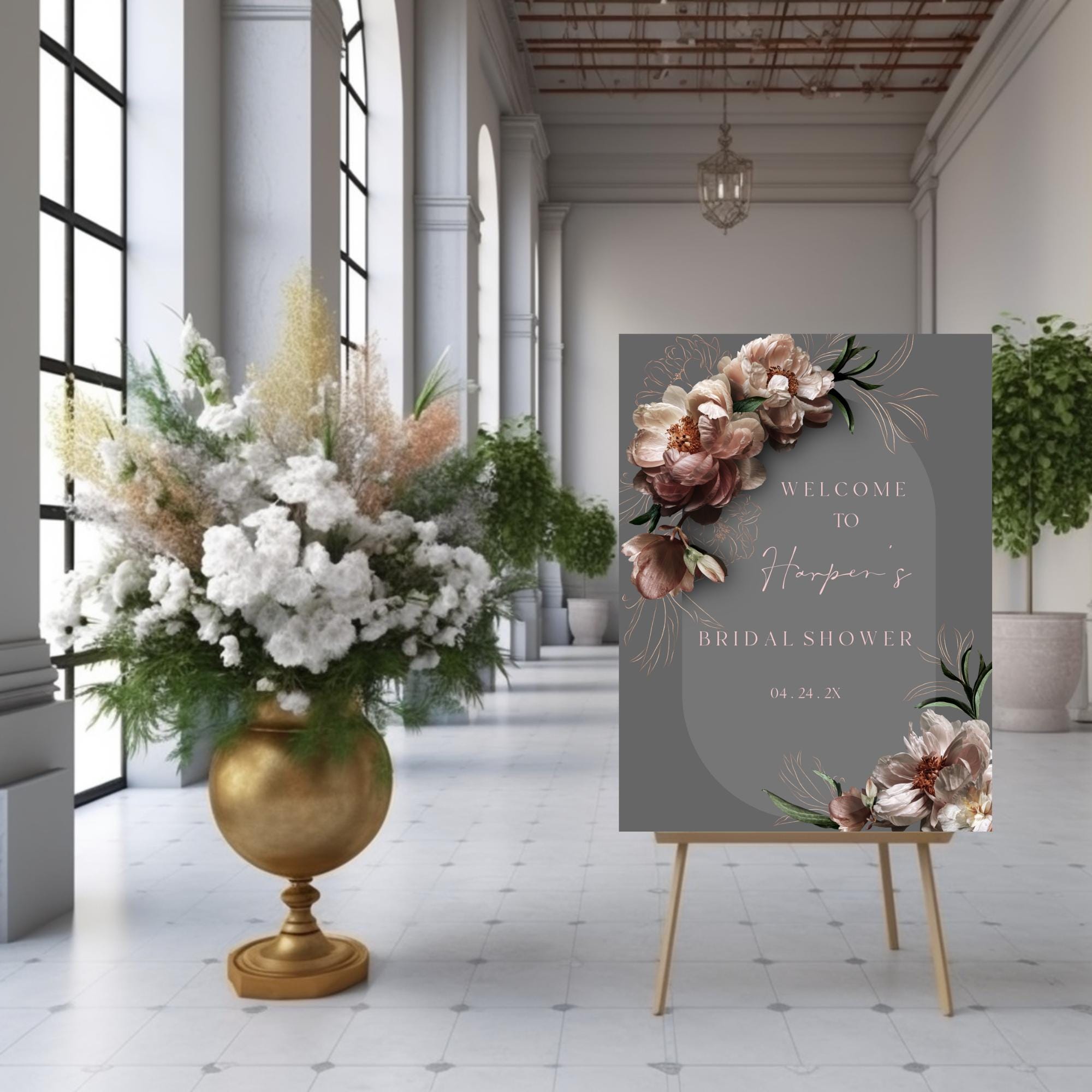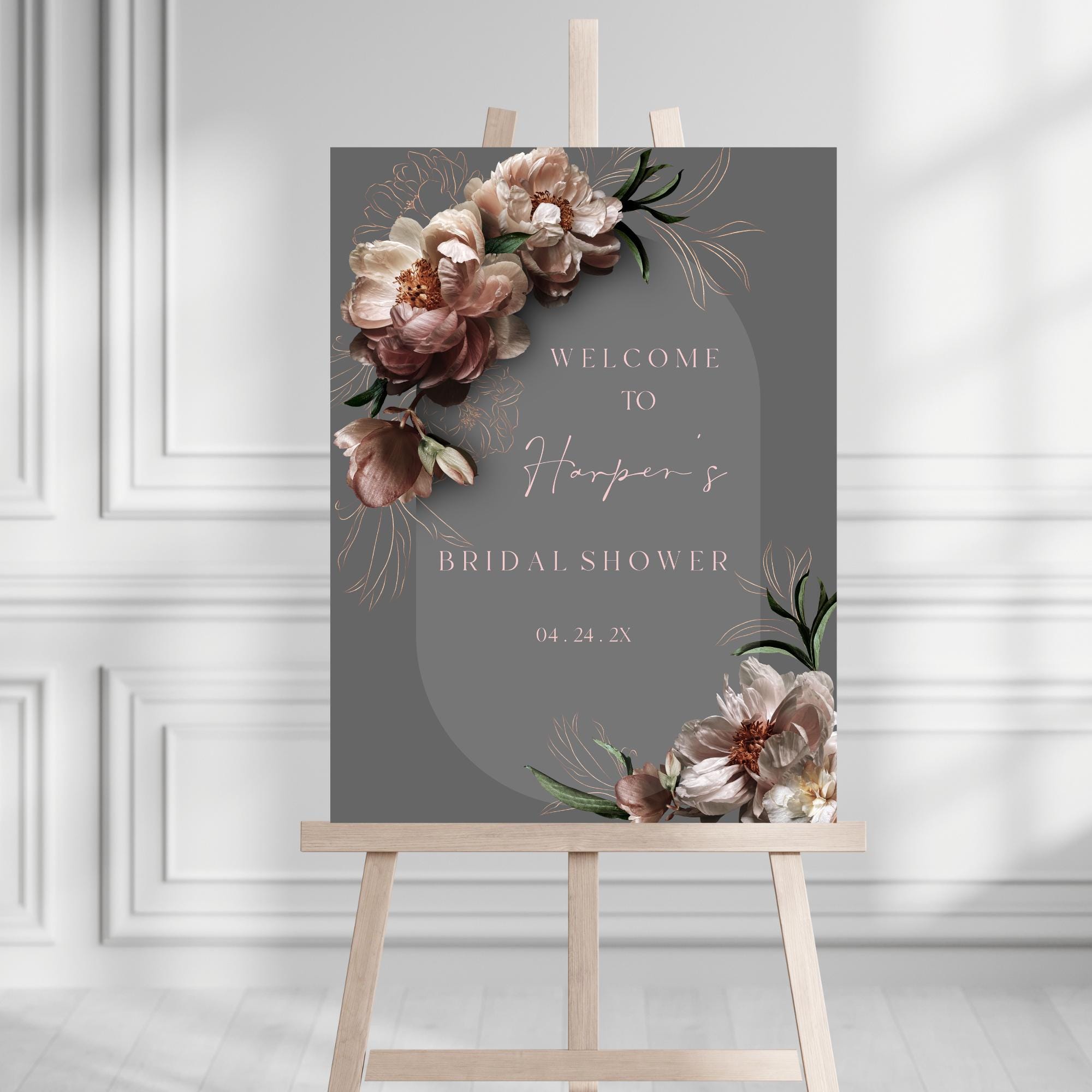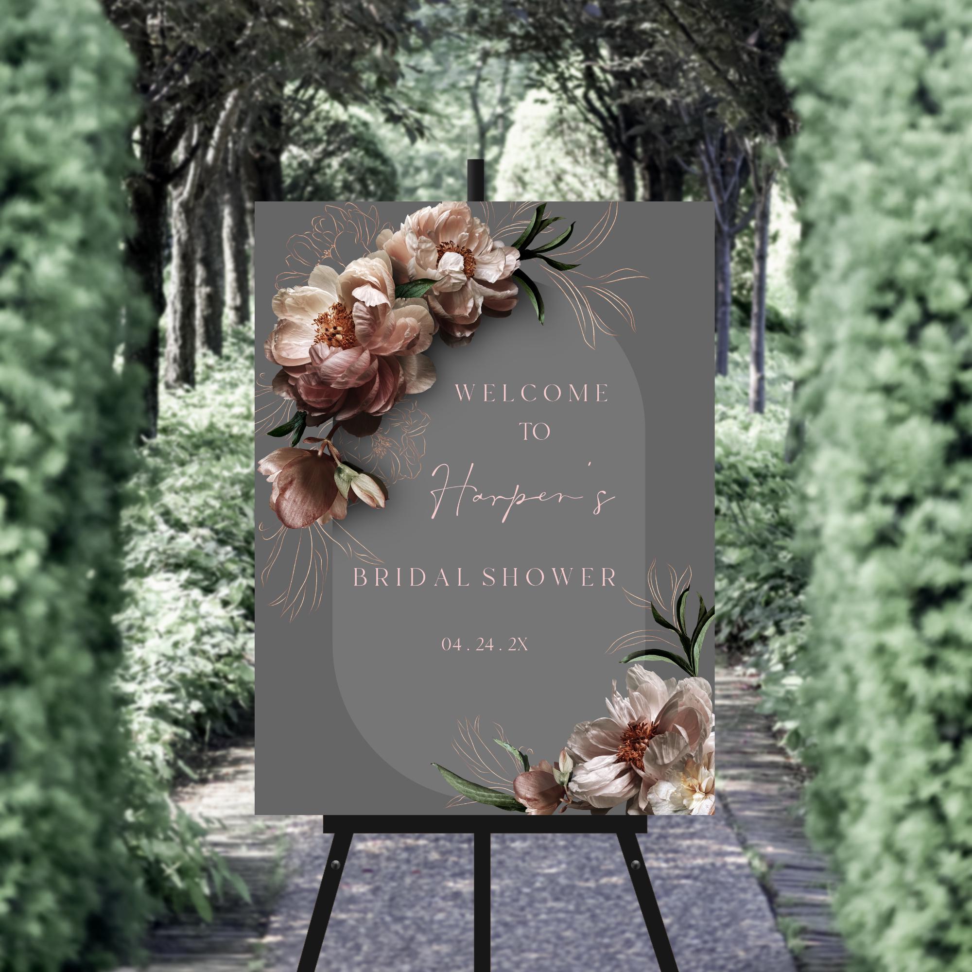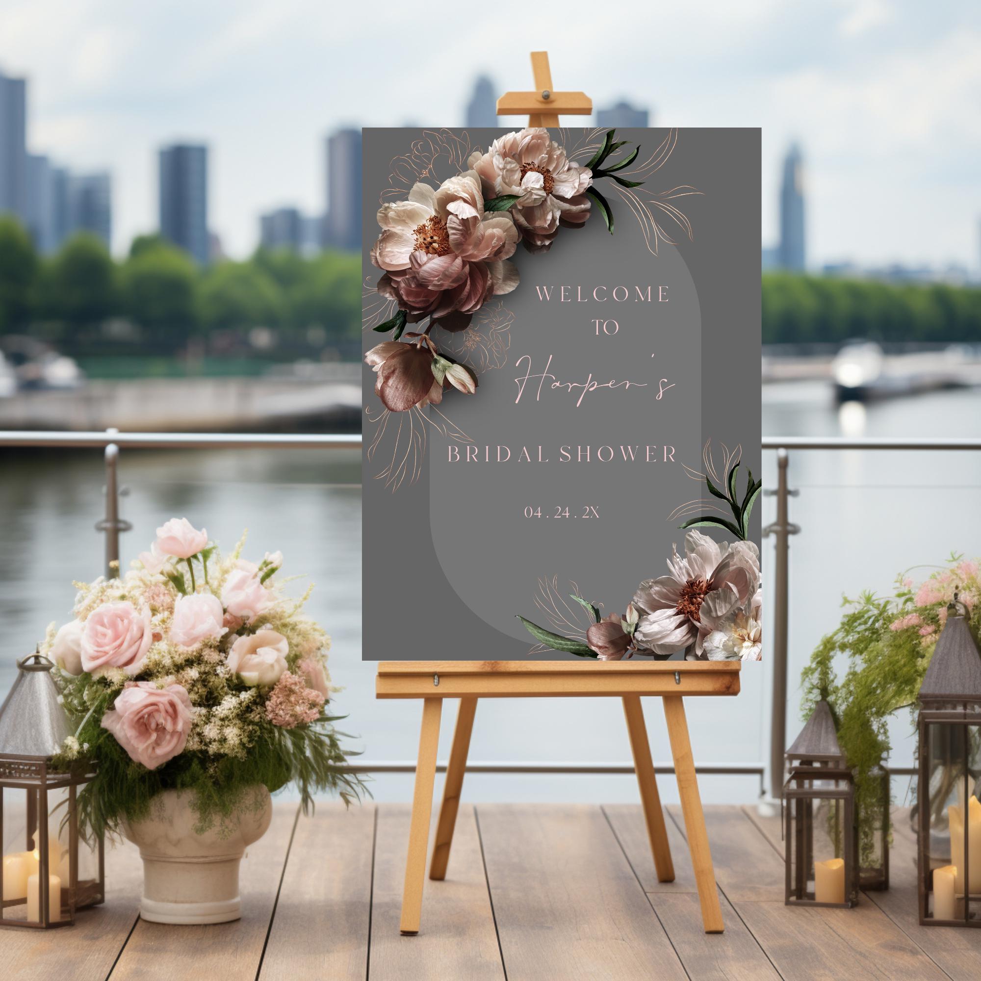 Elegant Gray and Blush Floral Bridal Shower sign Template. An Instant download digital file for you to edit in your web browser with Templett straight after your purchase. Once personalized you are ready to print.