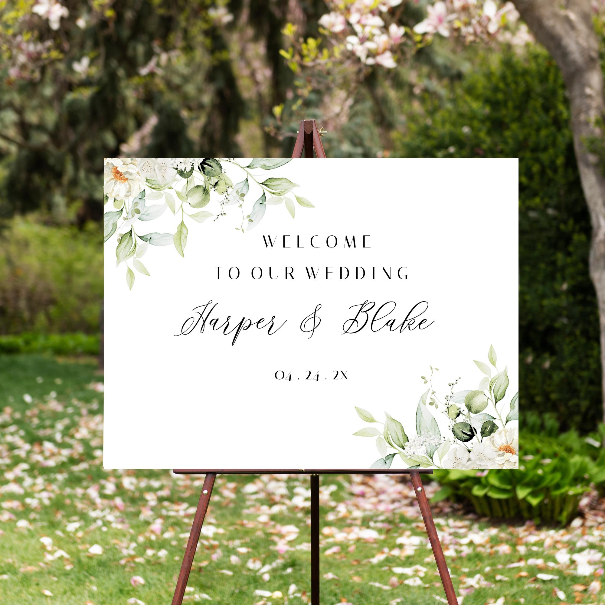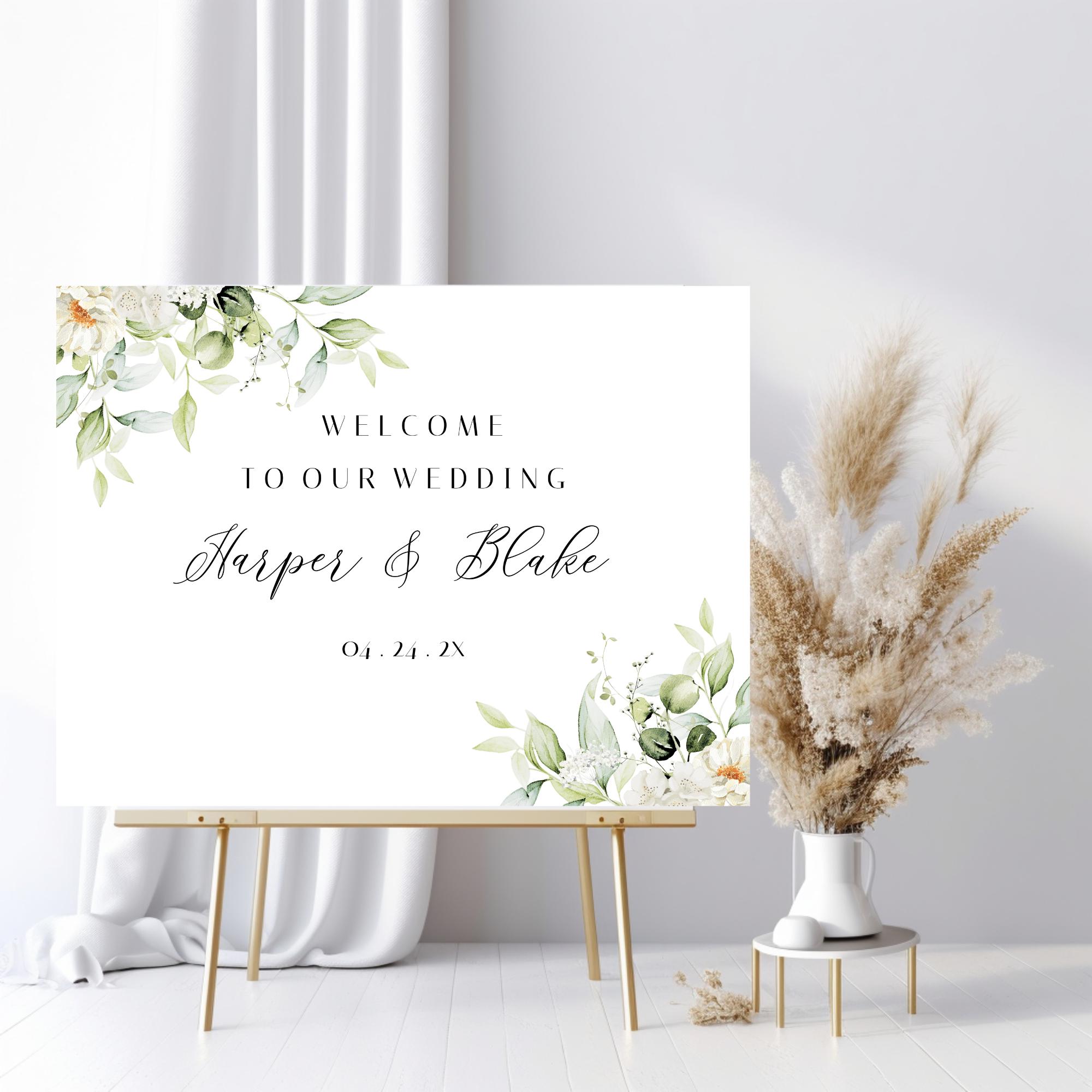 White Floral Greenery Wedding Welcome Sign Template. An Instant download digital file for you to edit in your web browser with Templett straight after your purchase. Once personalized you are ready to print.