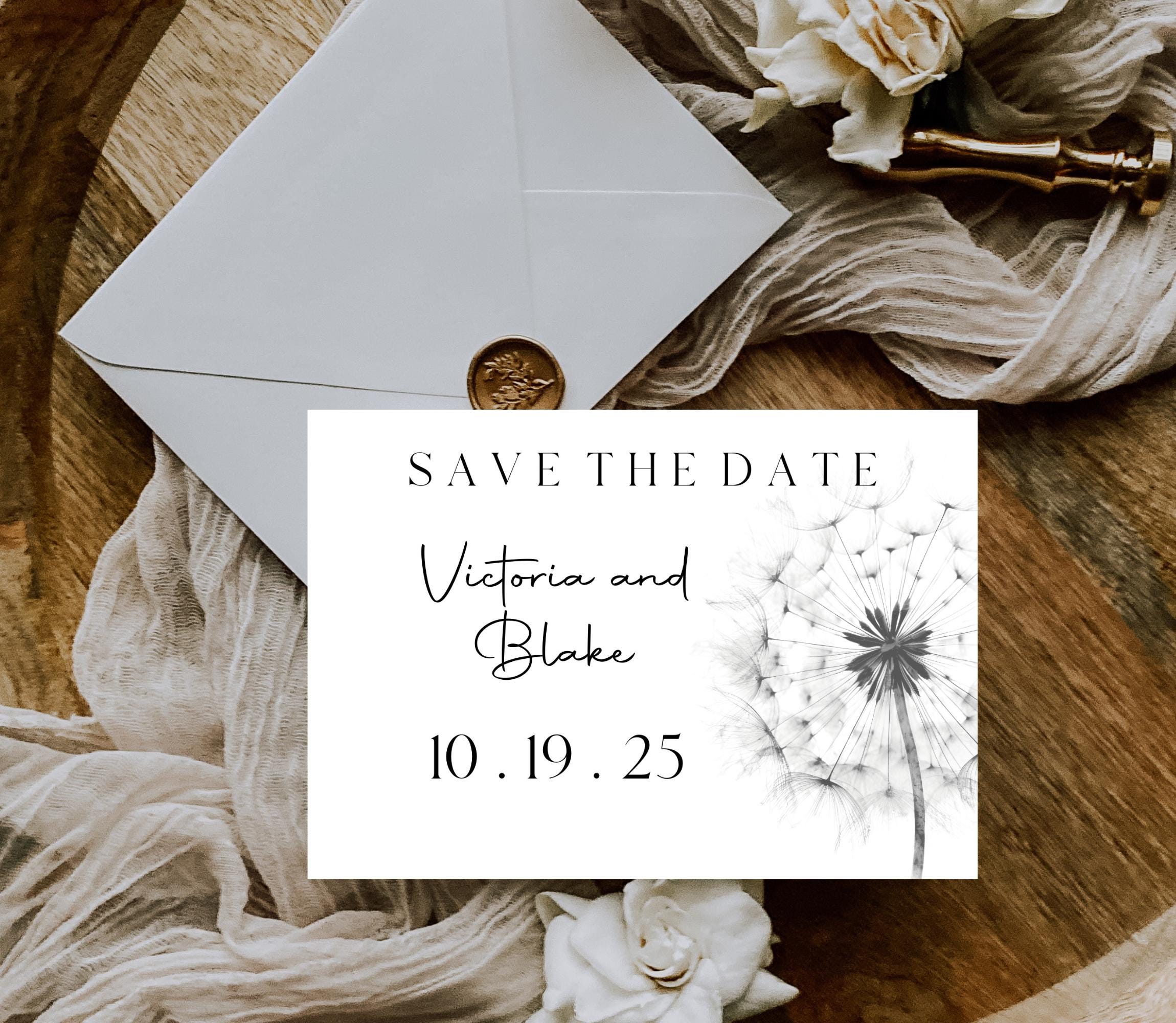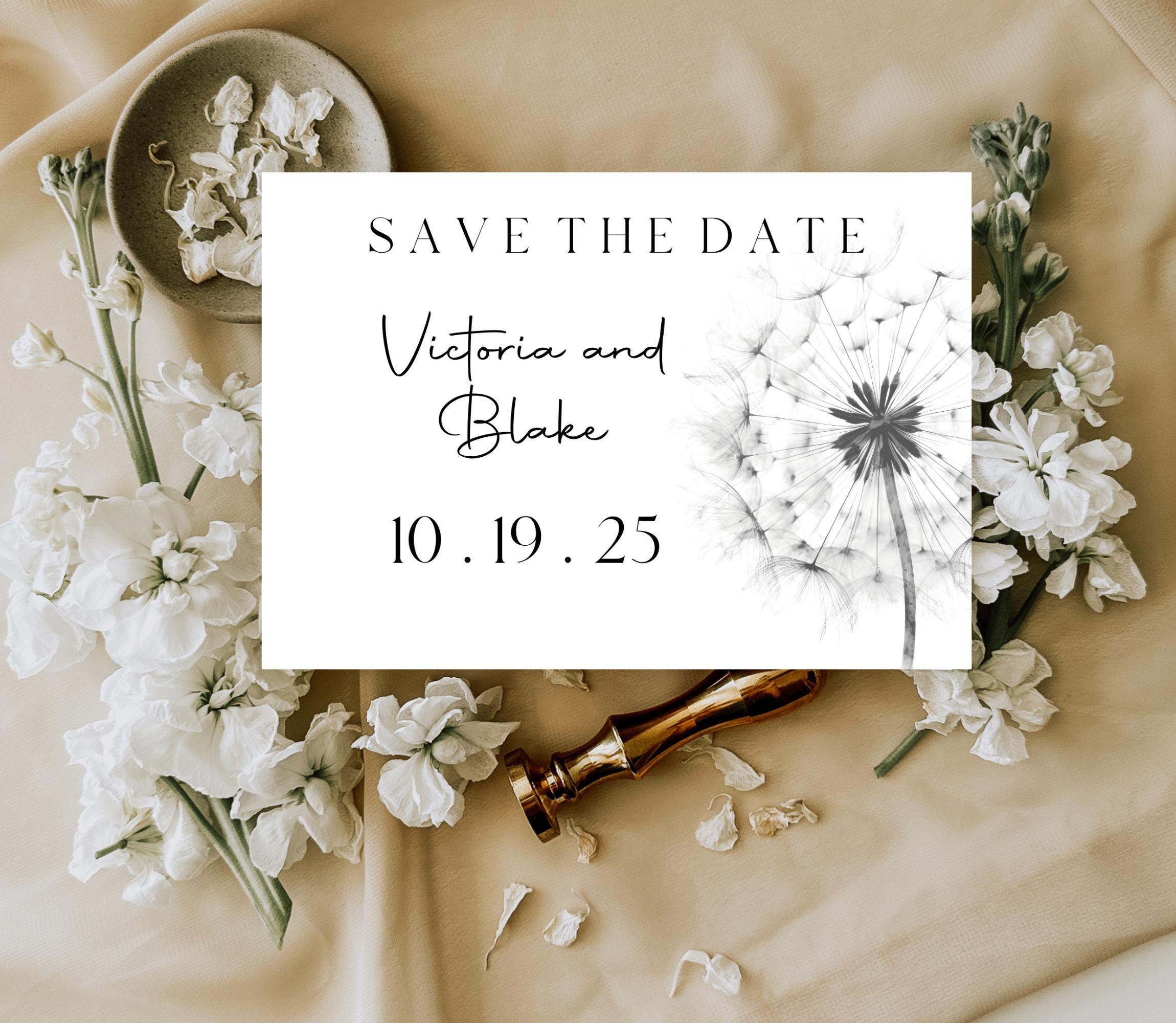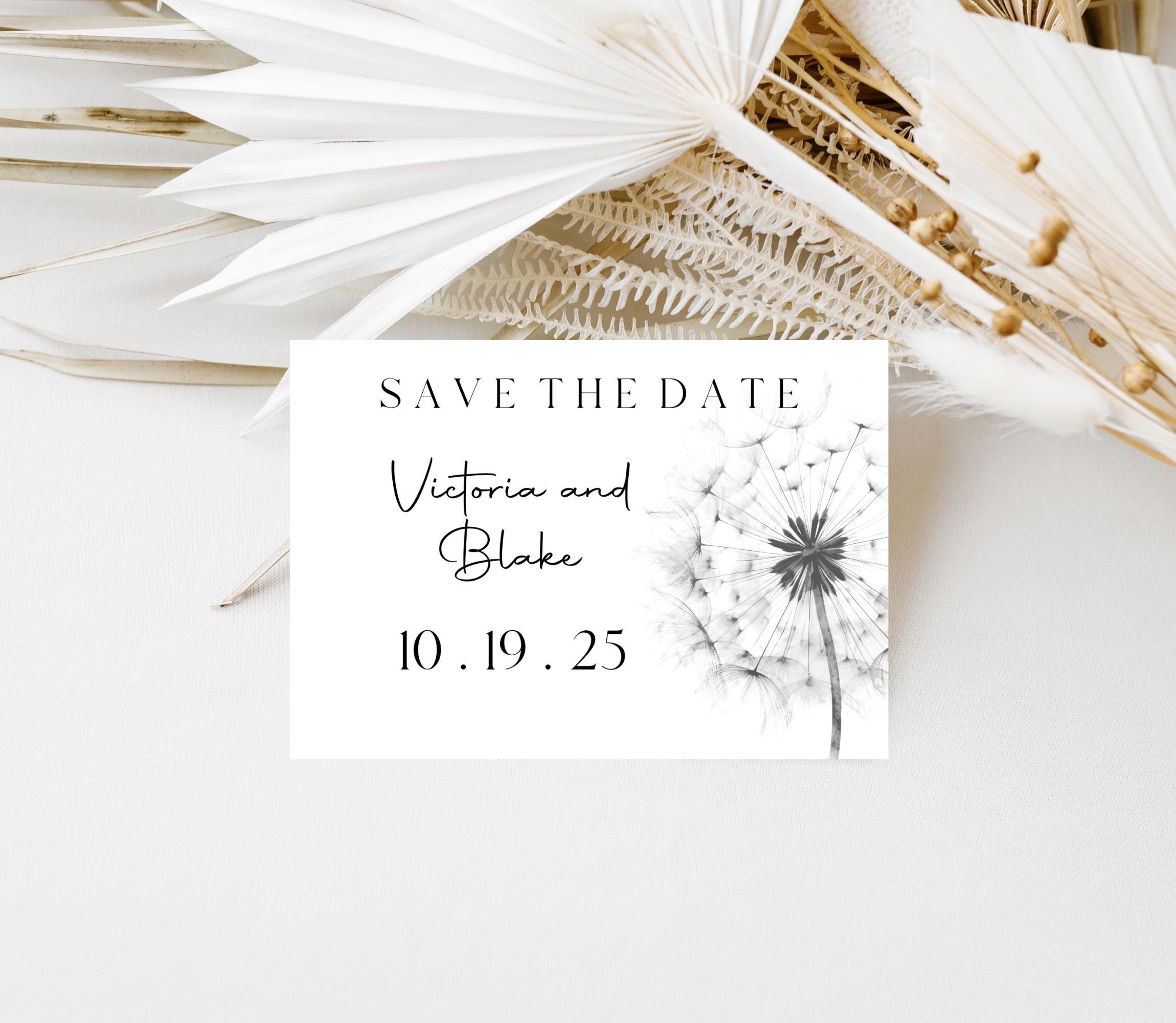 Black and White Dandelion Save The Date Invitation Template. An Instant download digital file for you to edit in your web browser with Templett straight after your purchase. Once personalized you are ready to print.