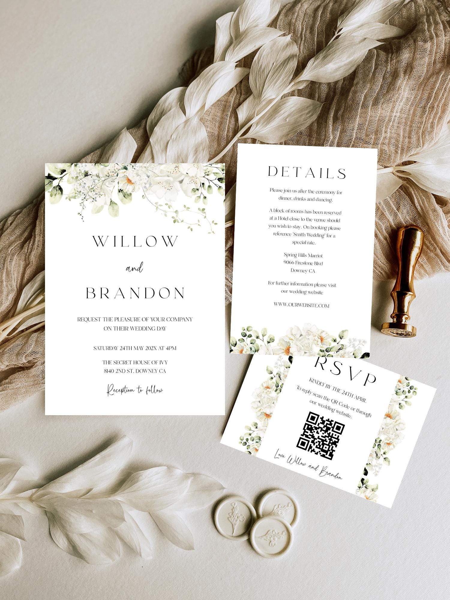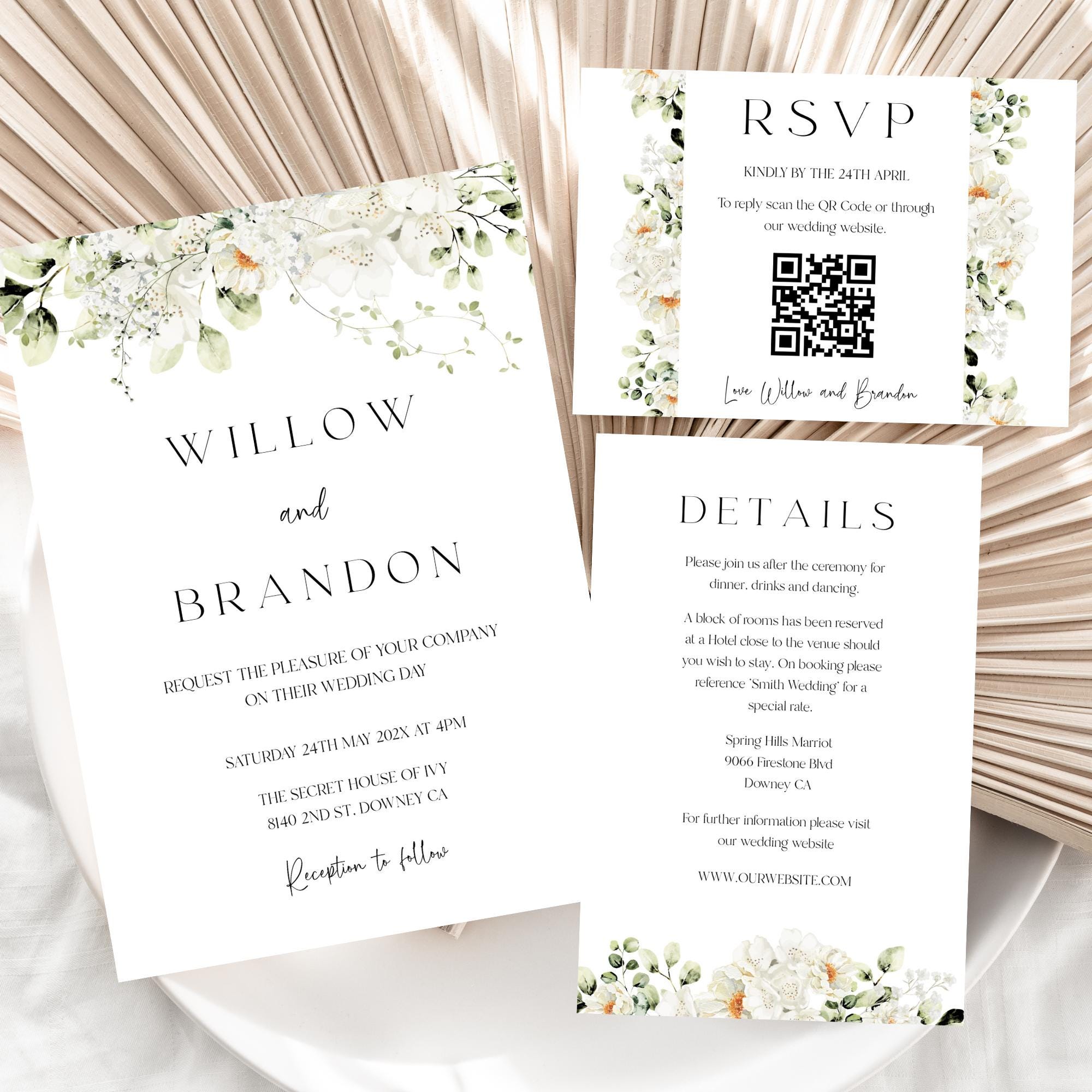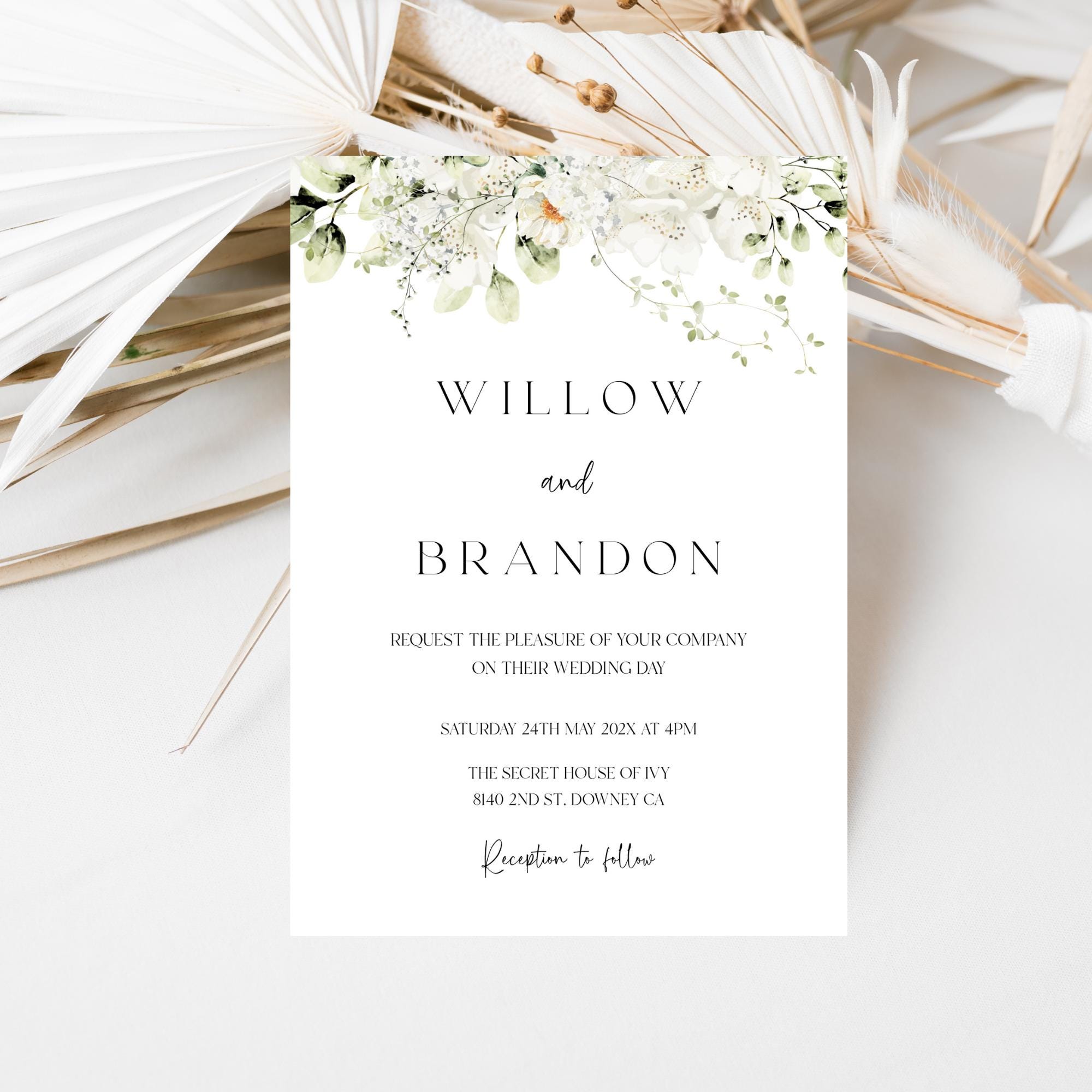 White Floral Spring Wedding Invitation Template. An Instant download digital file for you to edit in your web browser with Templett straight after your purchase. Once personalized you are ready to print.