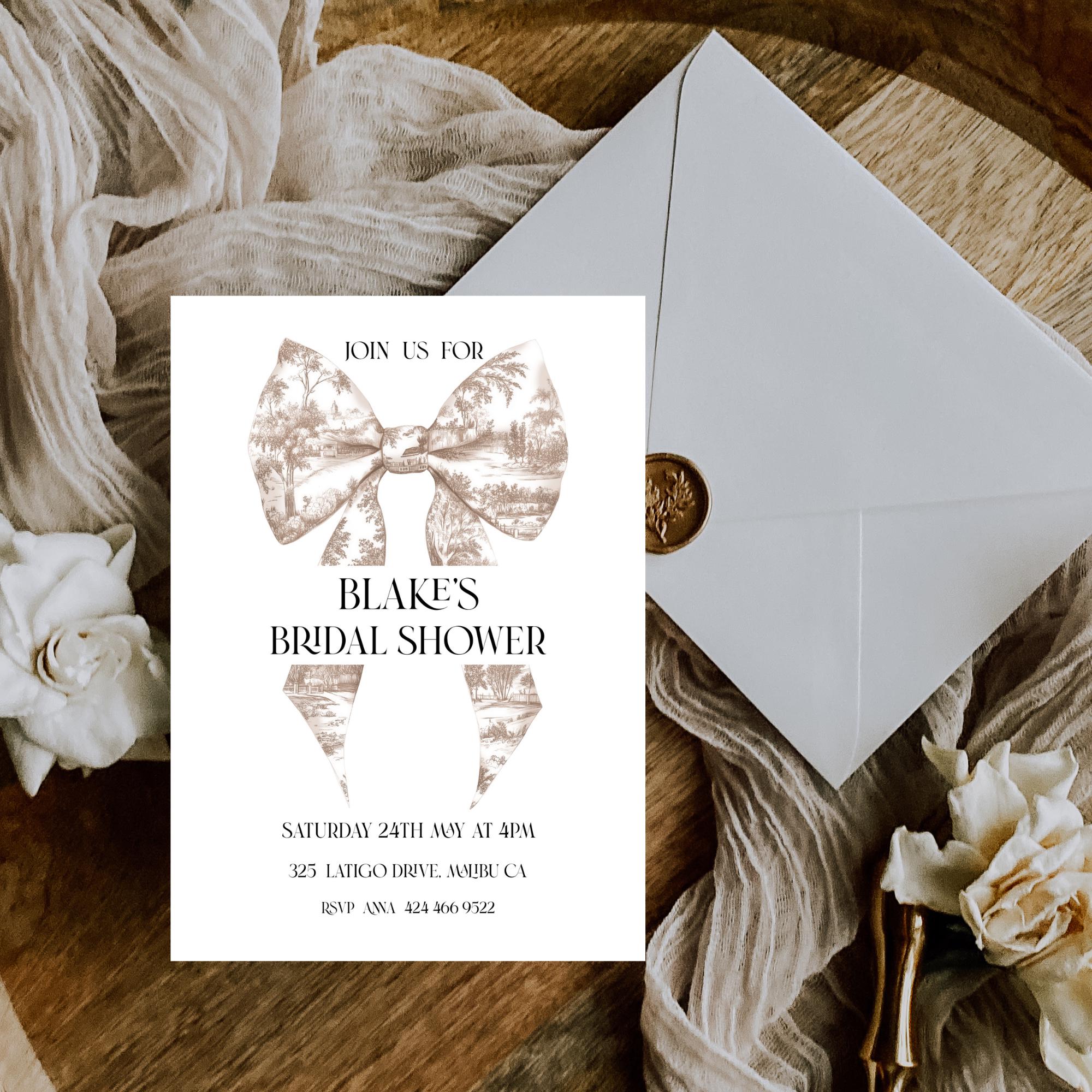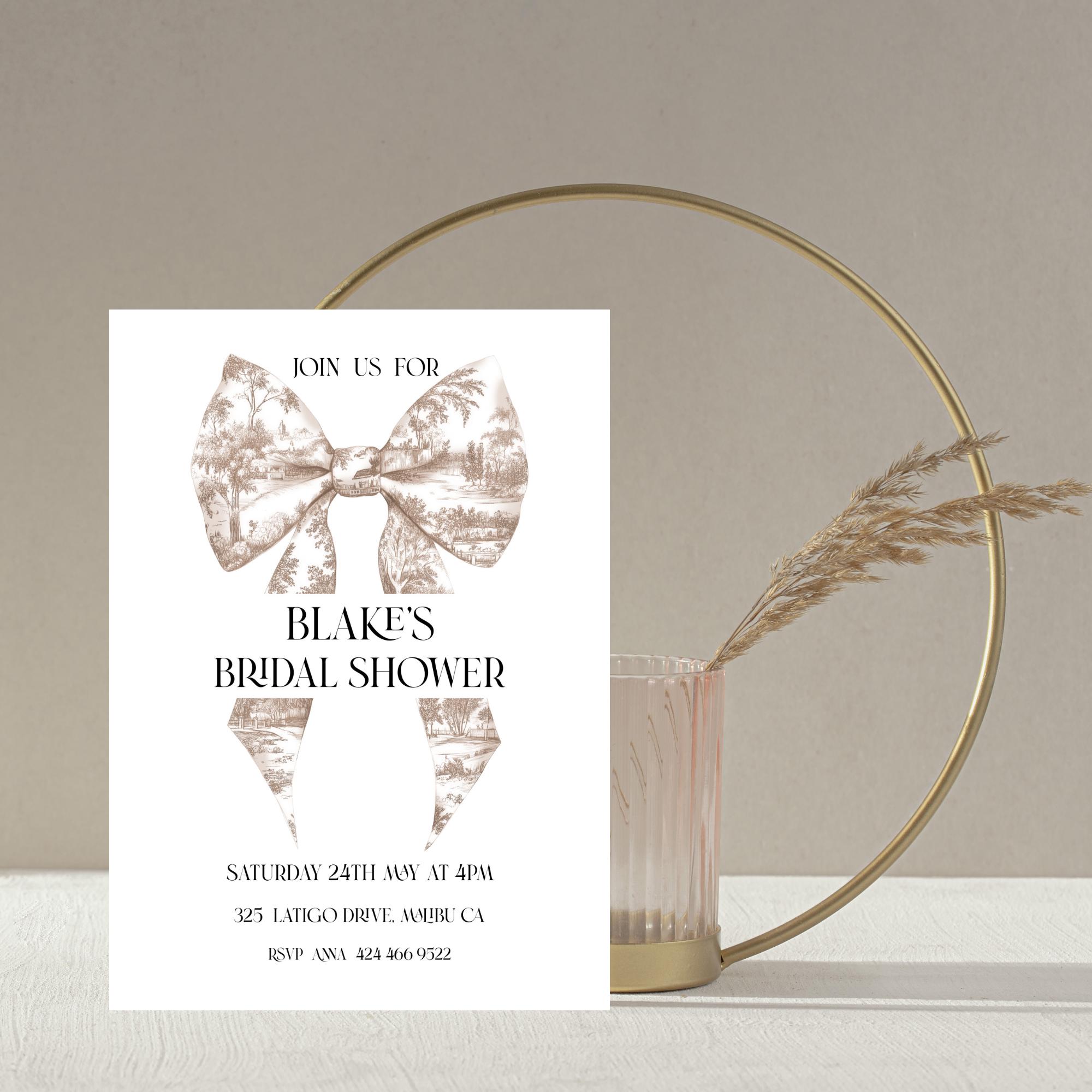 Neutral Toile Bow Bridal Shower Invitation Template. An Instant download digital file for you to edit in your web browser with Templett straight after your purchase. Once personalized you are ready to print.