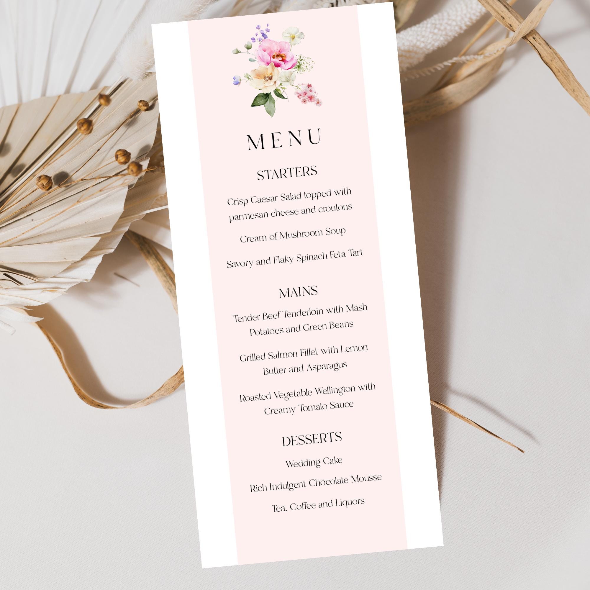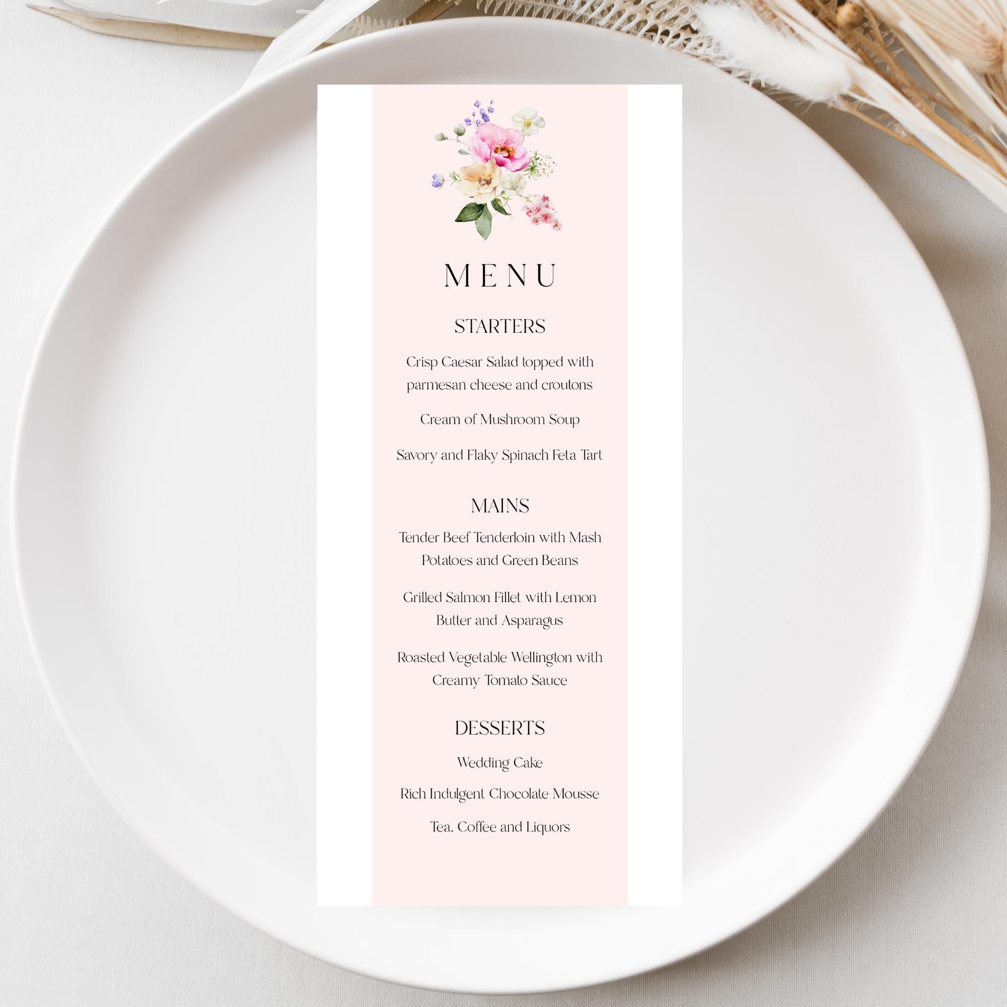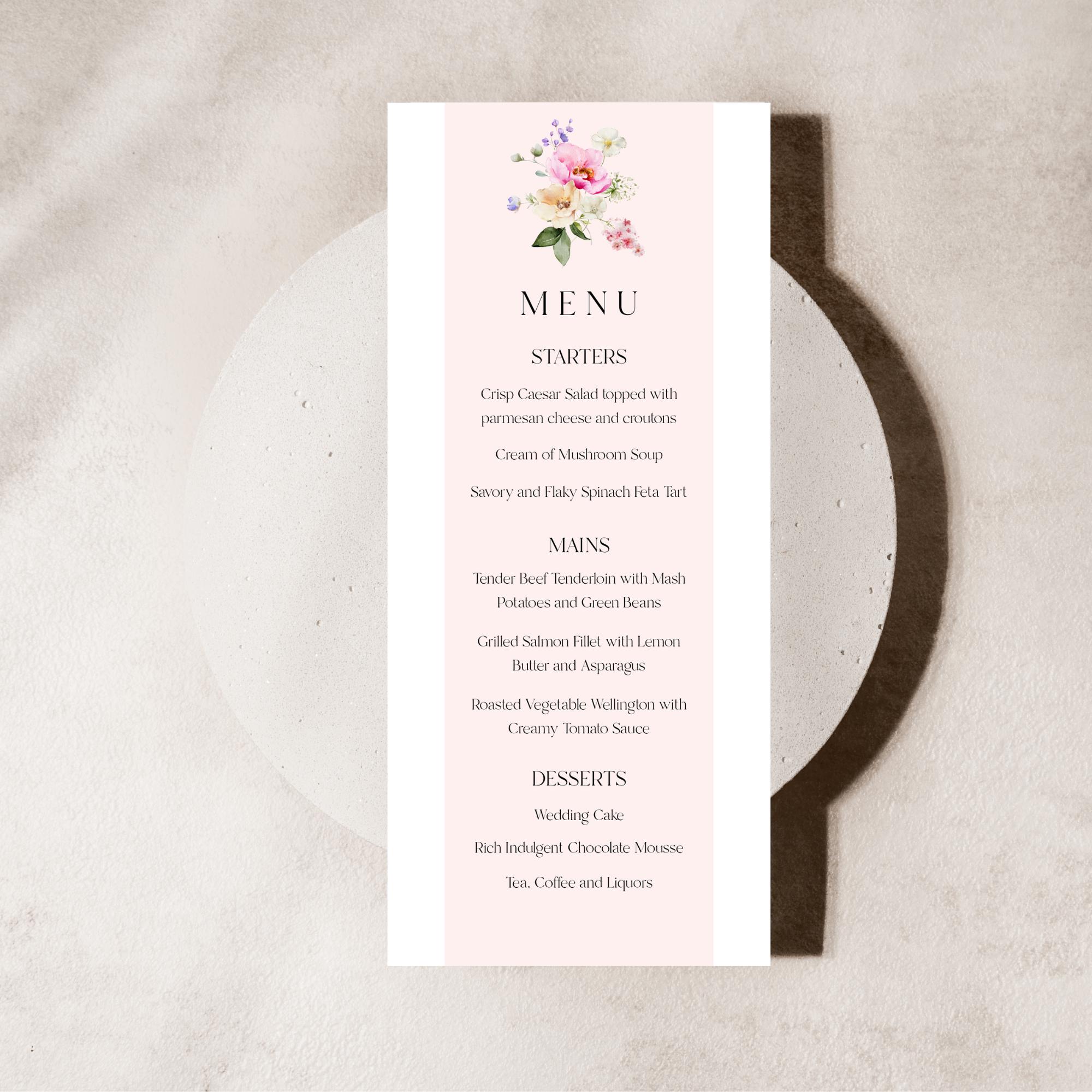 Bright Blooms Wedding Menu Template. An Instant download digital file for you to edit in your web browser with Templett straight after your purchase. Once personalized you are ready to print.