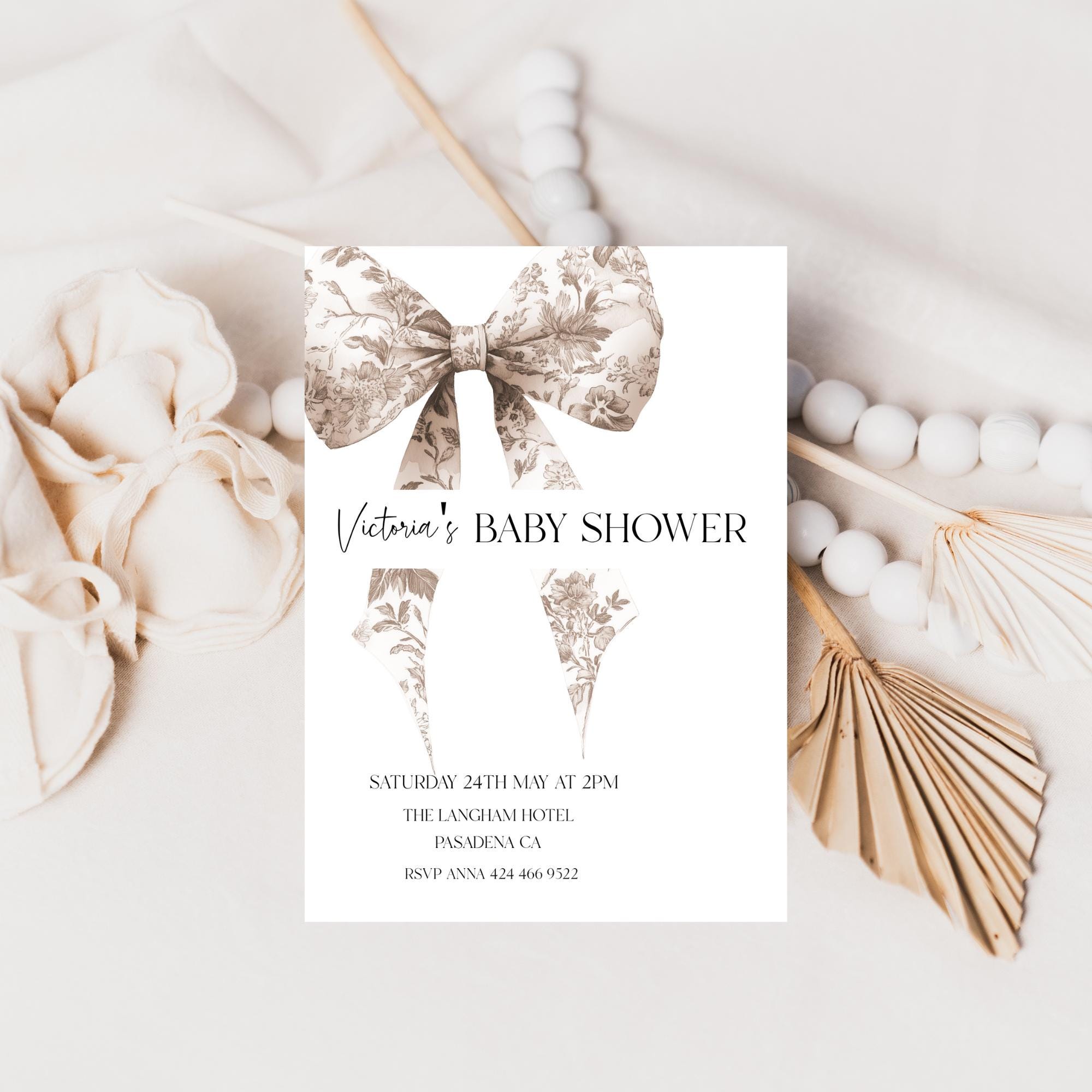 Neutral Toile Bow Baby Shower Invitation Template. An Instant download digital file for you to edit in your web browser with Templett straight after your purchase. Once personalized you are ready to print.