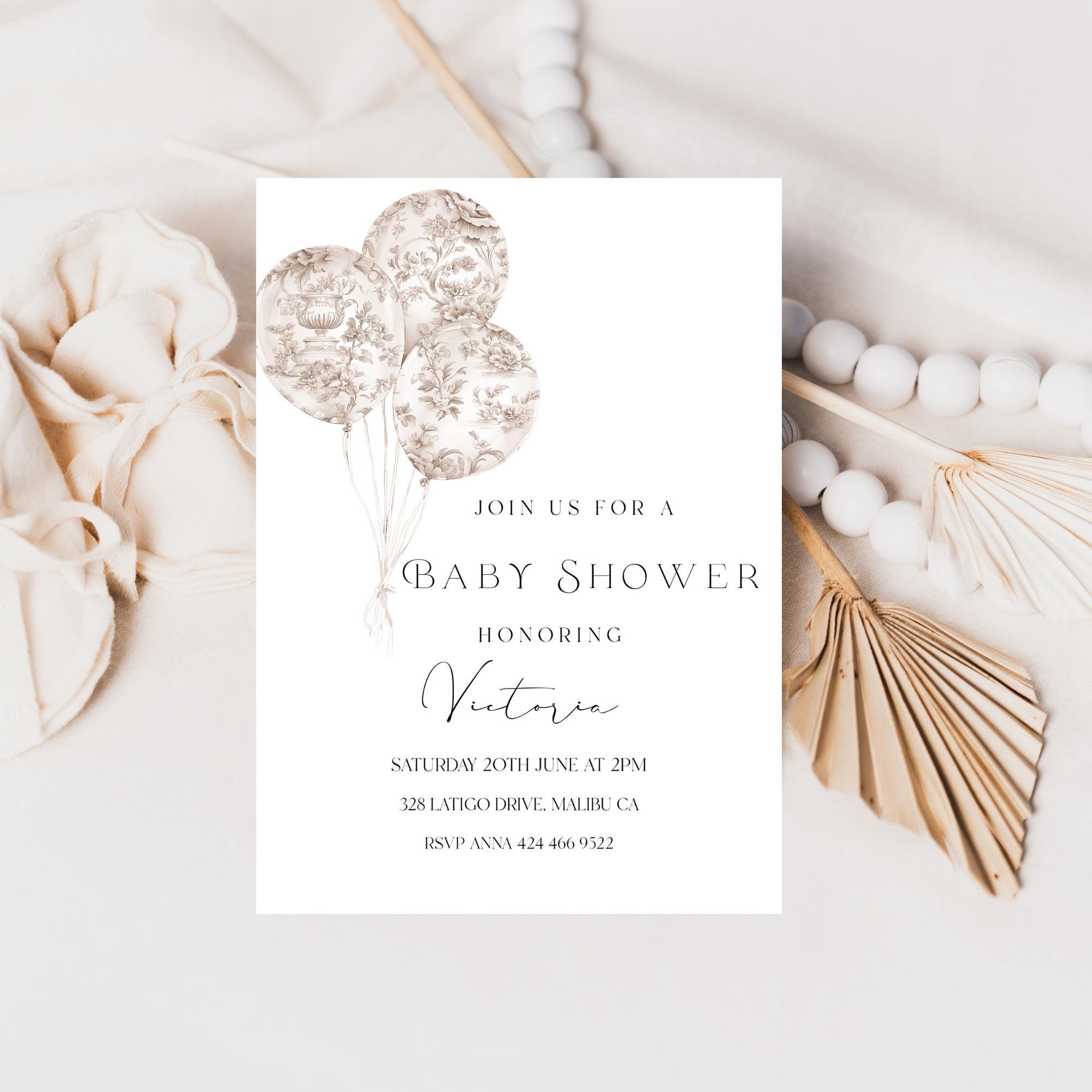 Neutral Toile Balloon Baby Shower Invitation Template. An Instant download digital file for you to edit in your web browser with Templett straight after your purchase. Once personalized you are ready to print.