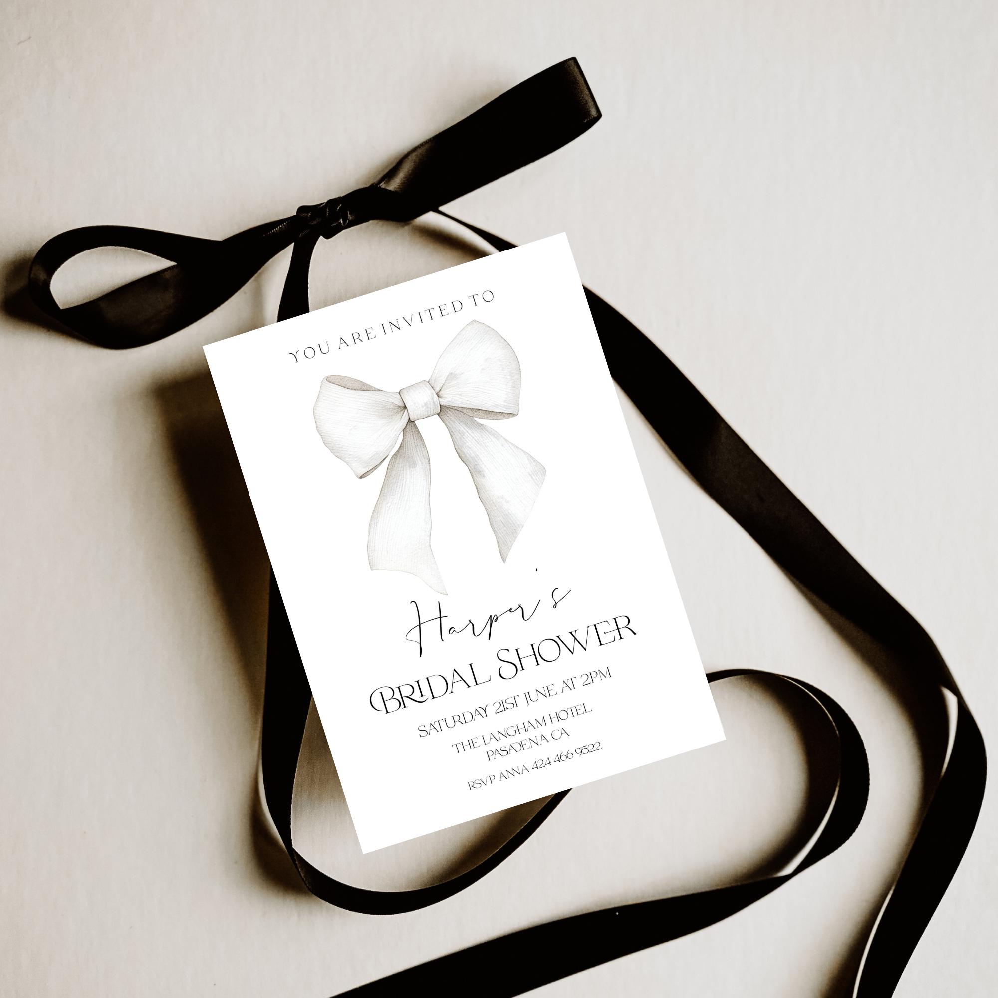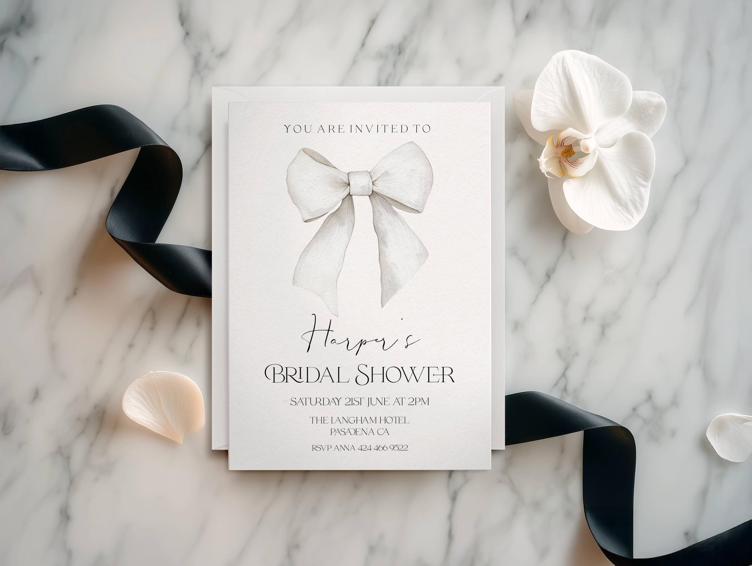 White Bow Bridal Shower Invitation Template. An Instant download digital file for you to edit in your web browser with Templett straight after your purchase. Once personalized you are ready to print.