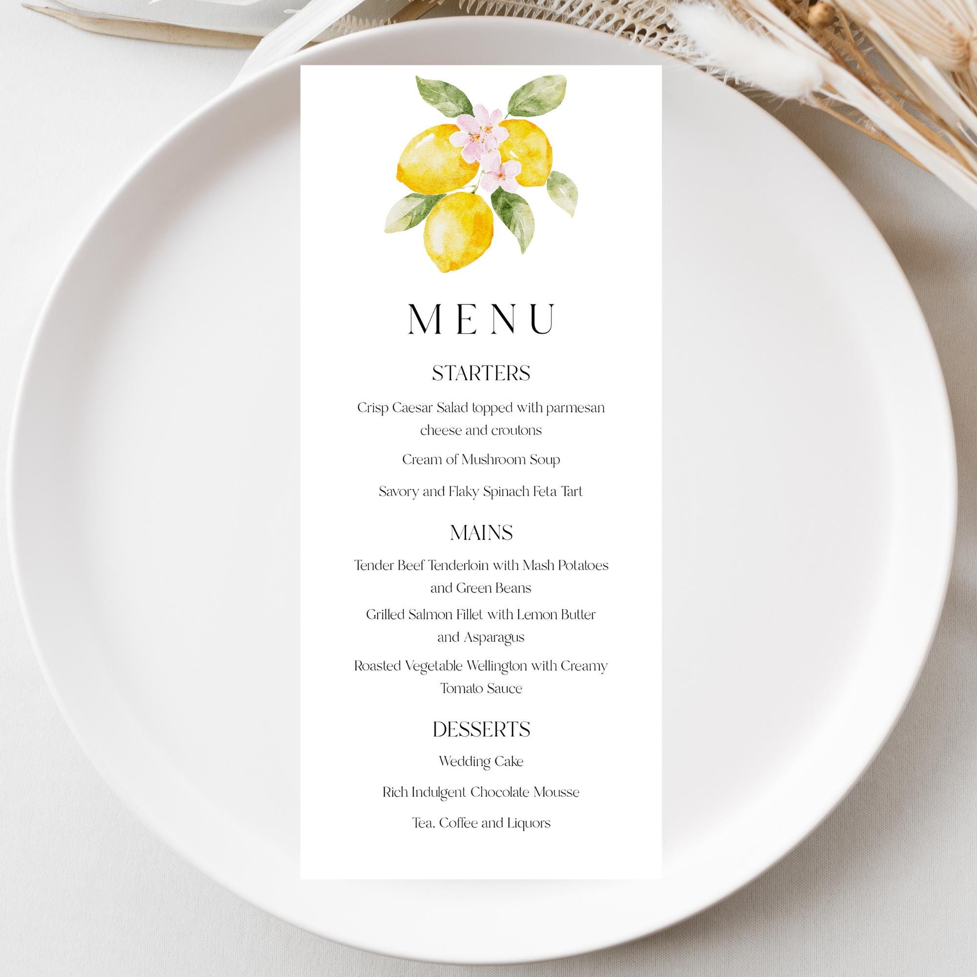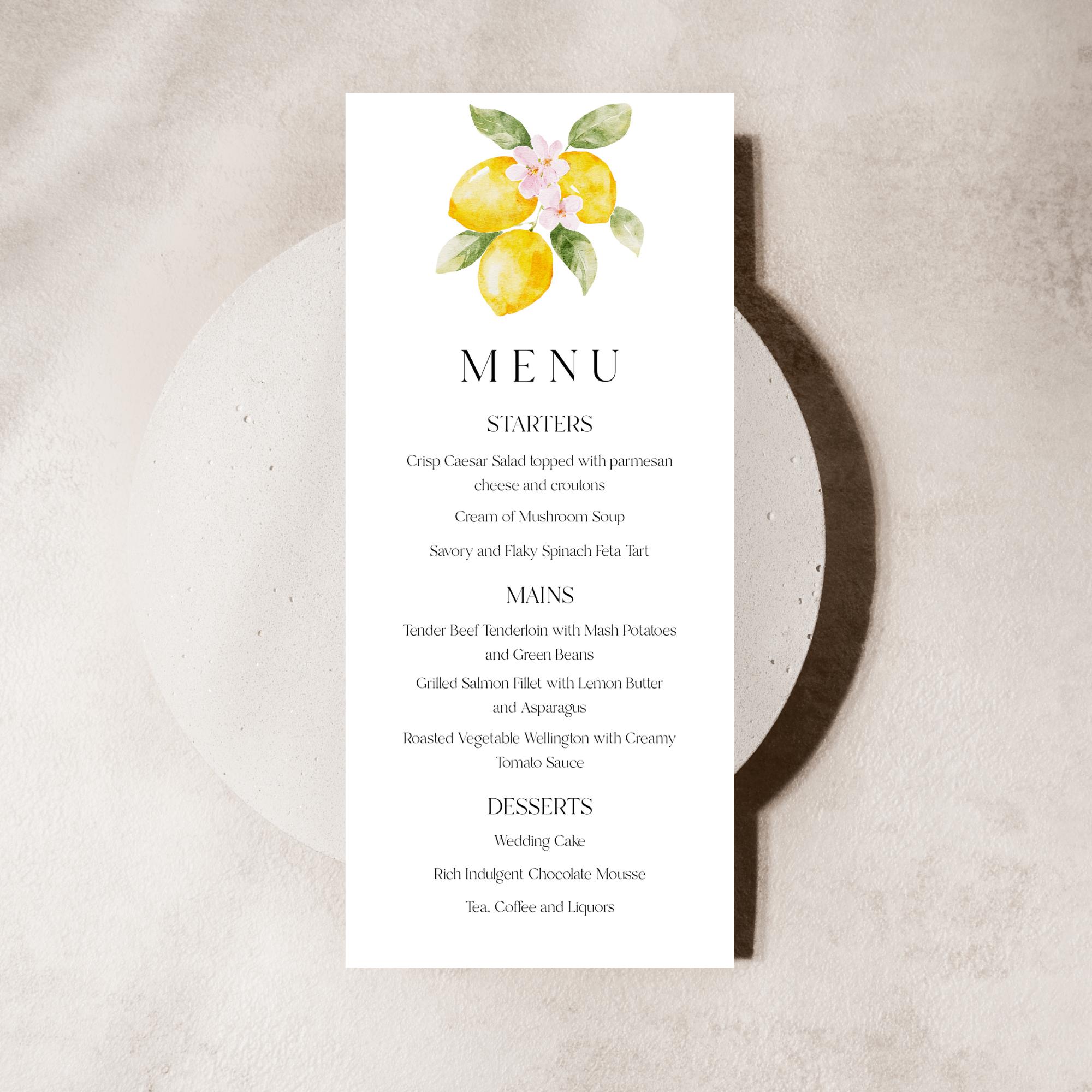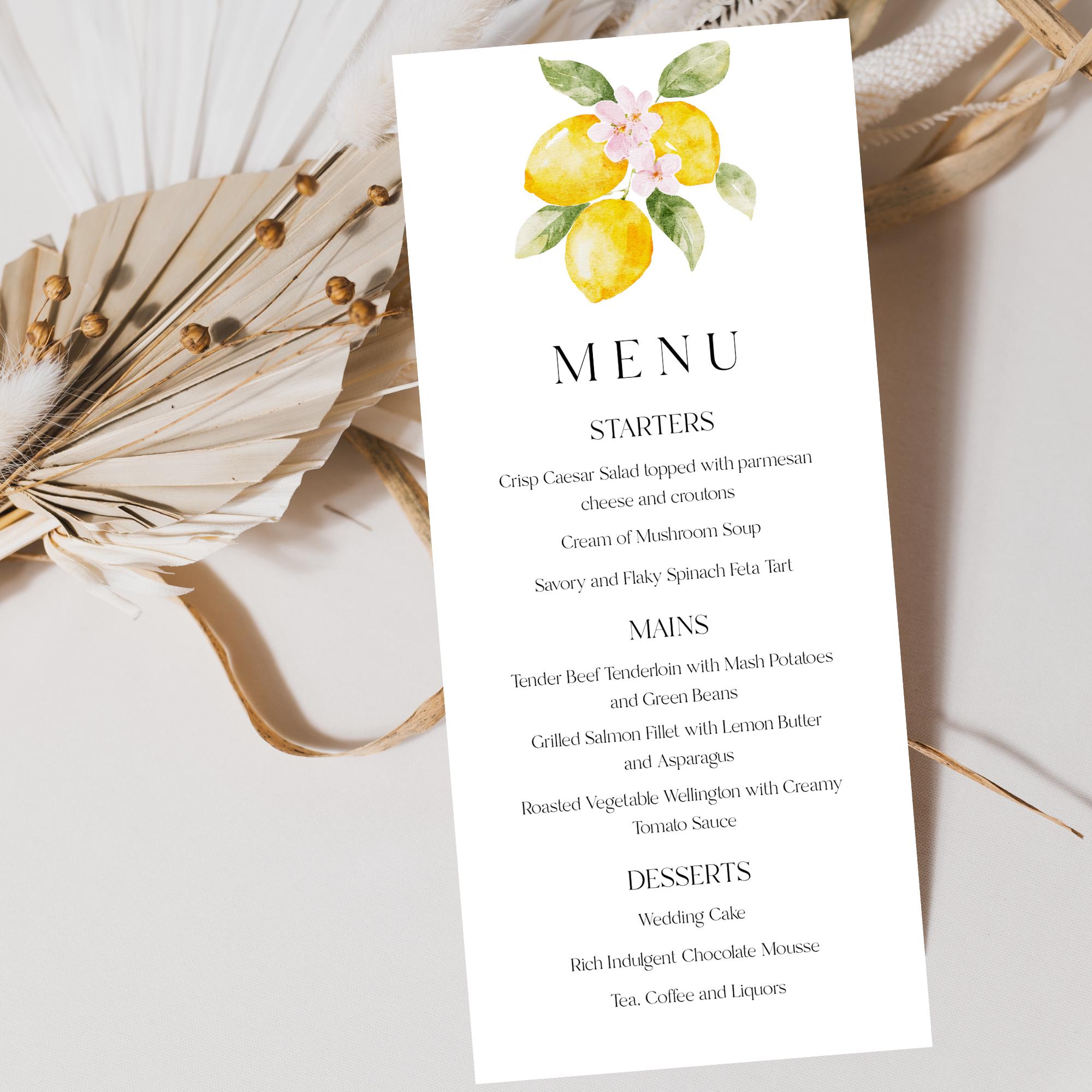 Lemons Wedding Menu Template. An Instant download digital file for you to edit in your web browser with Templett straight after your purchase. Once personalized you are ready to print.