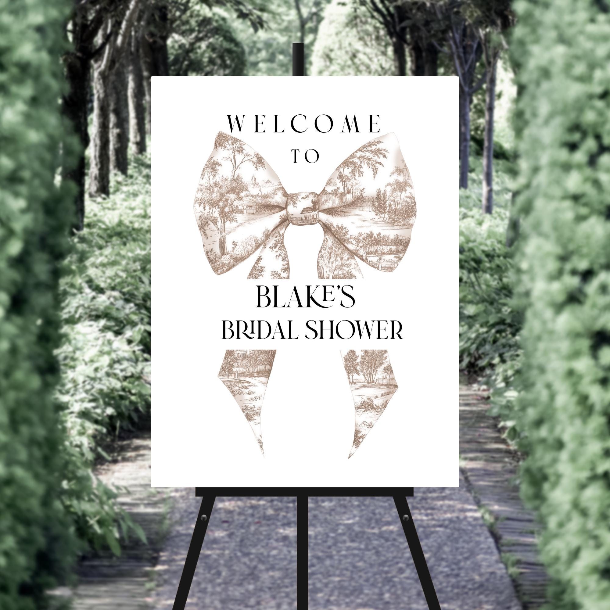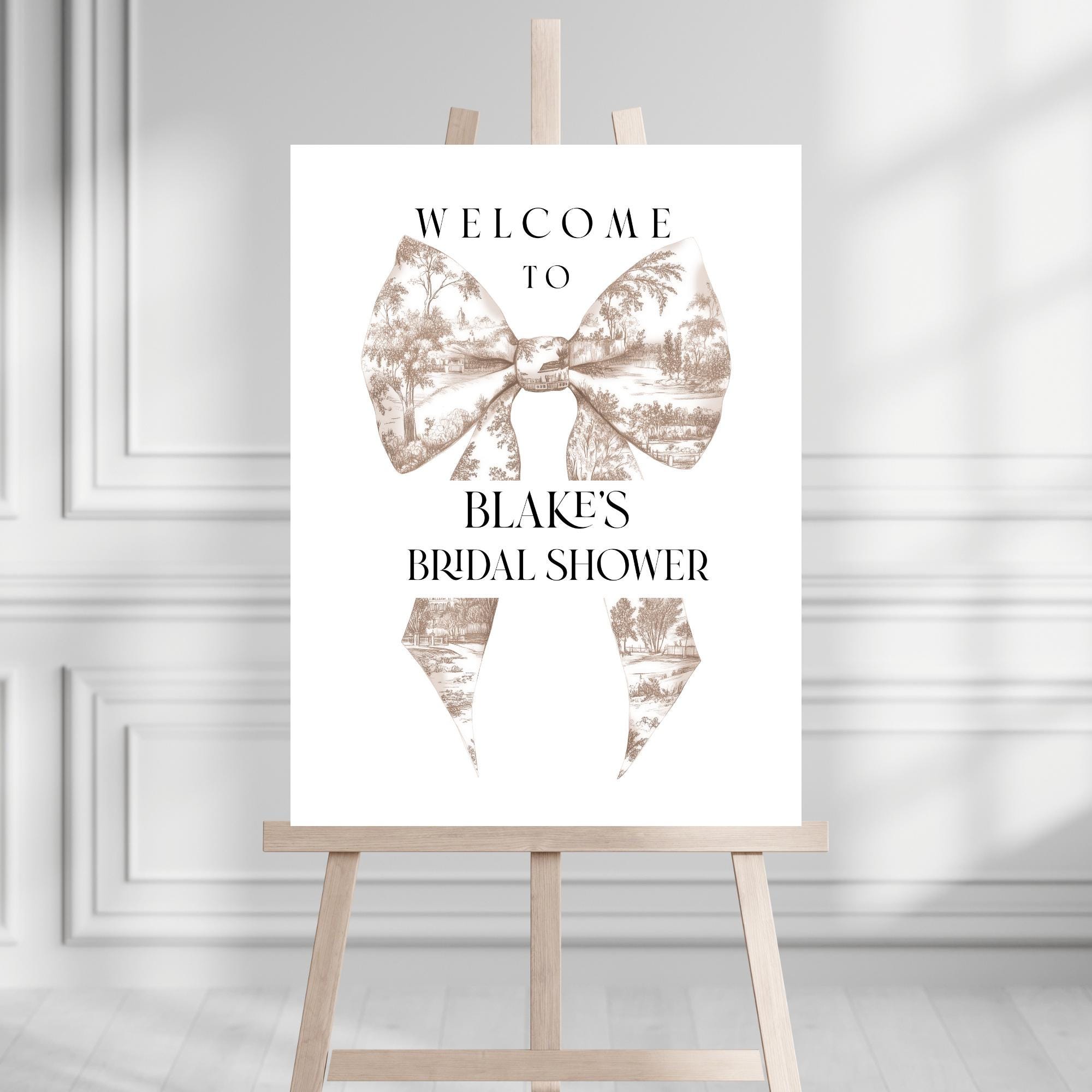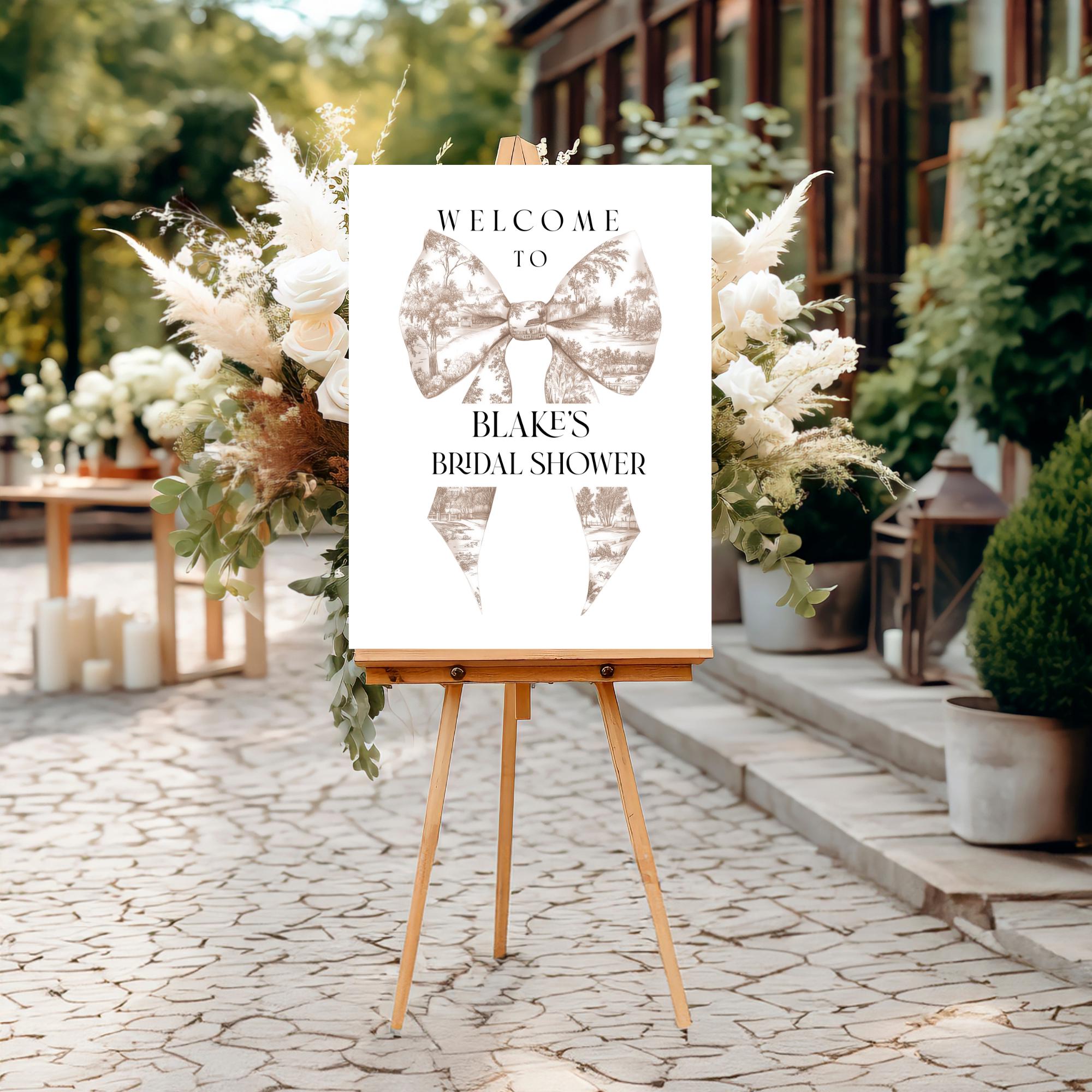 Neutral Toile Bow Bridal Shower Welcome Sign Template. An Instant download digital file for you to edit in your web browser with Templett straight after your purchase. Once personalized you are ready to print.