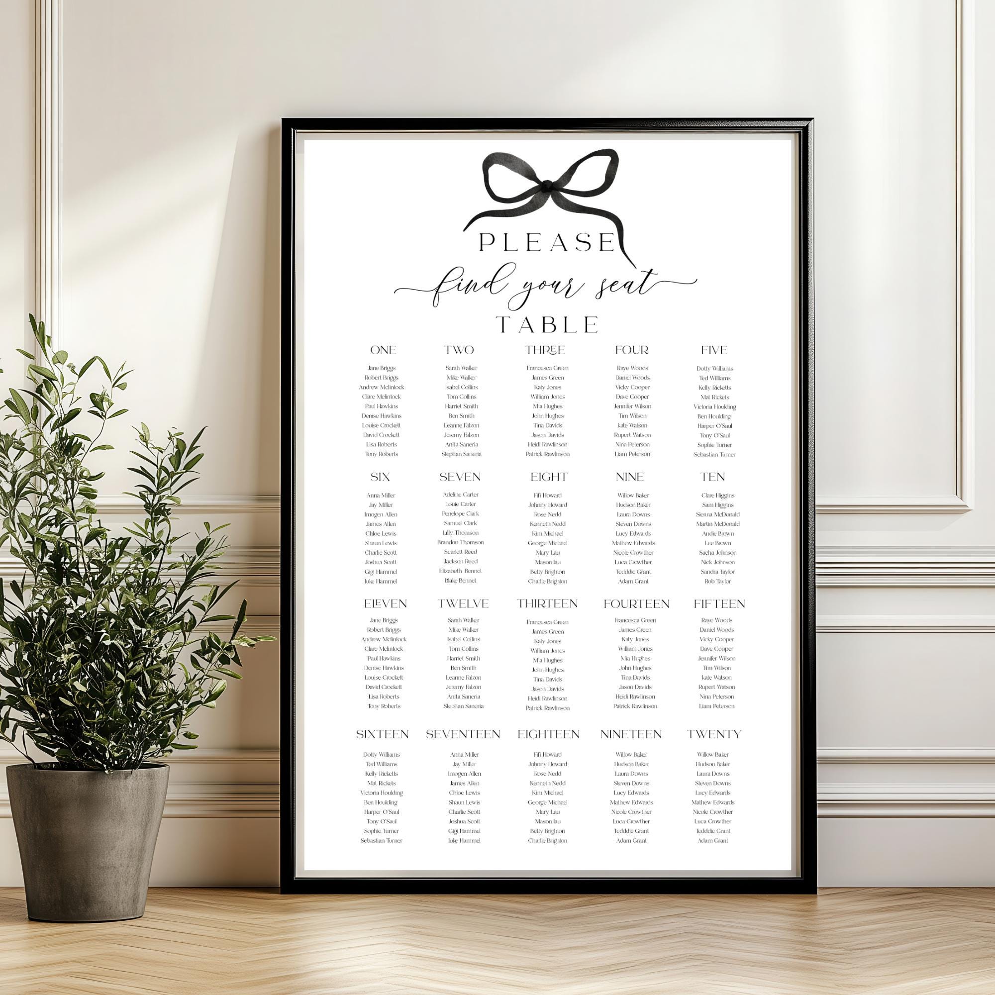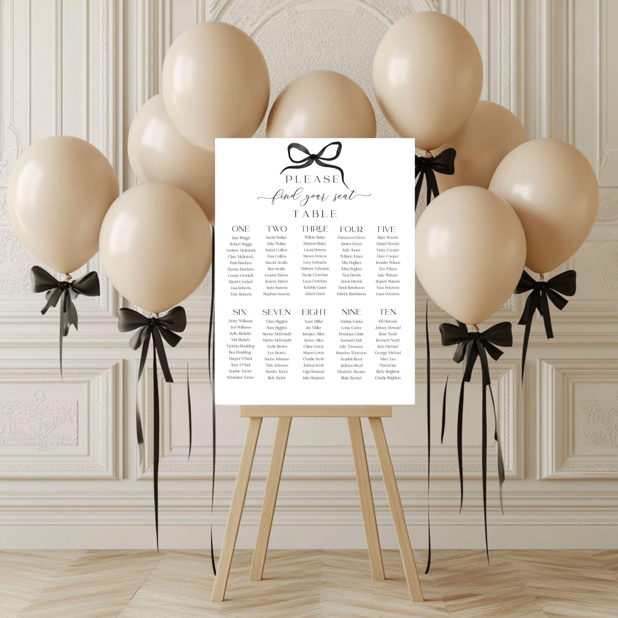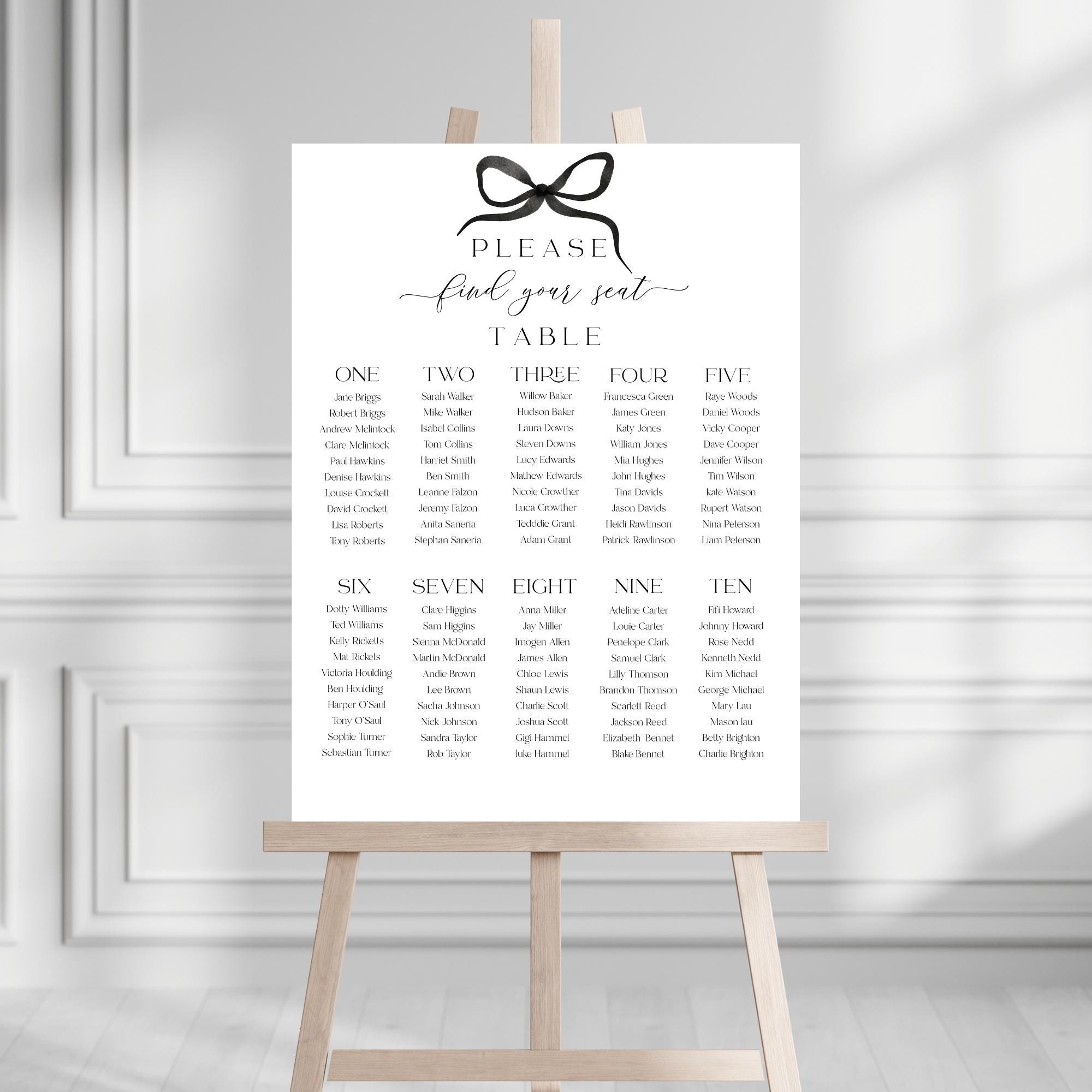 Modern Black Bow Wedding Seating Plan Sign Template. An Instant download digital file for you to edit in your web browser with Templett straight after your purchase. Once personalized you are ready to print.