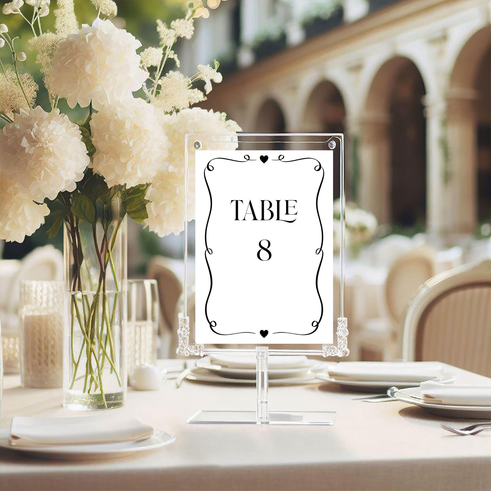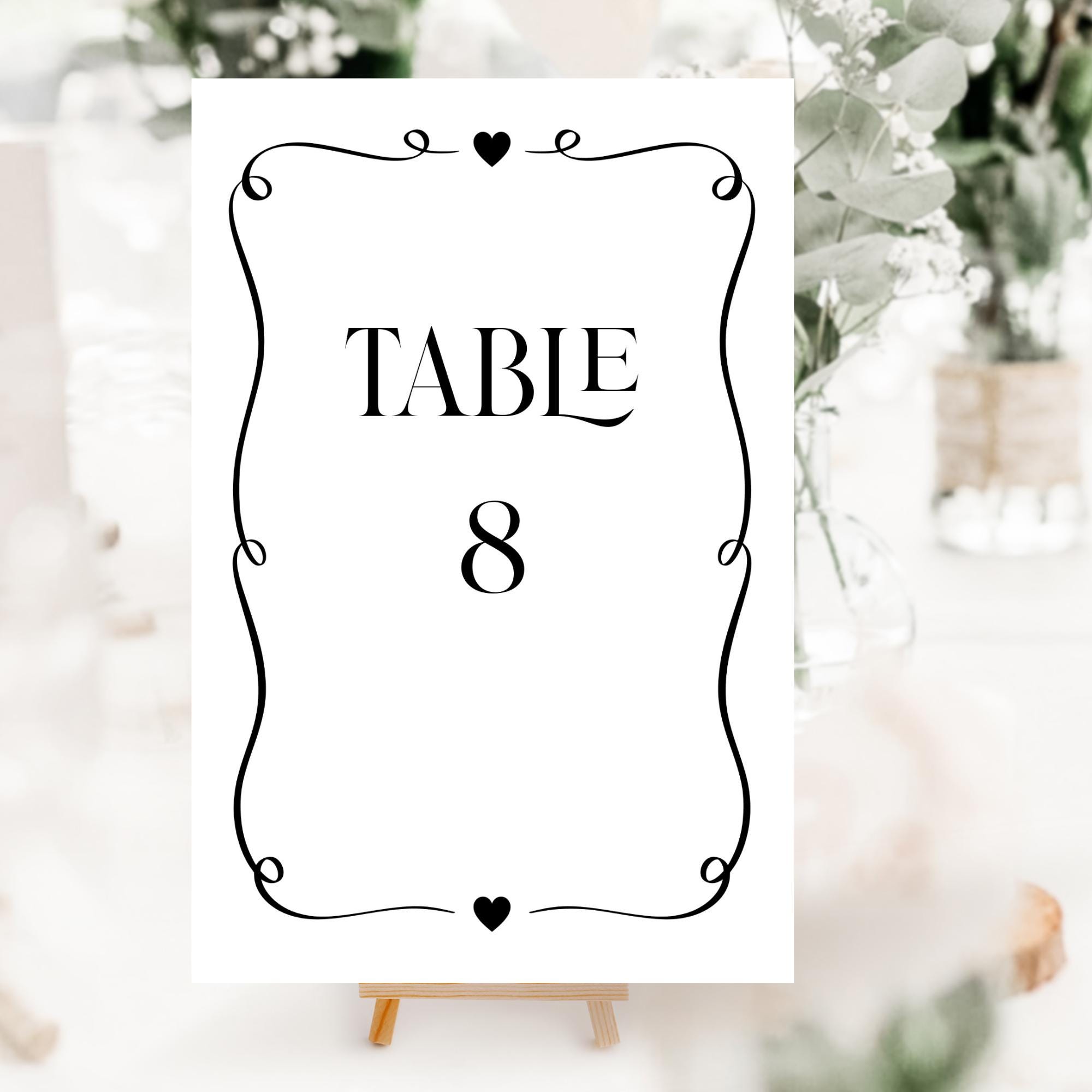 Modern Black and white Wedding Table Number Sign Template. An Instant download digital file for you to edit in your web browser with Templett straight after your purchase. Once personalized you are ready to print.