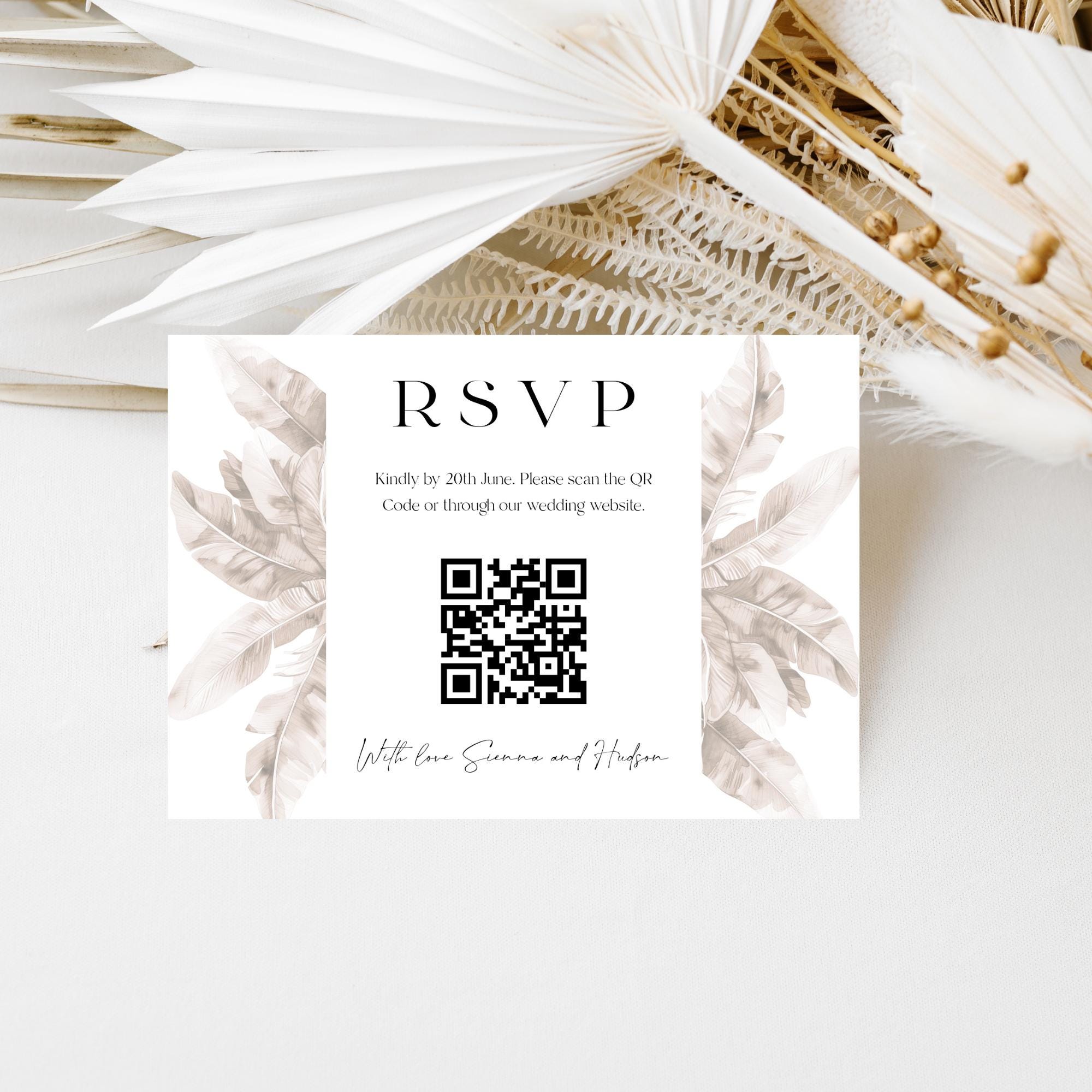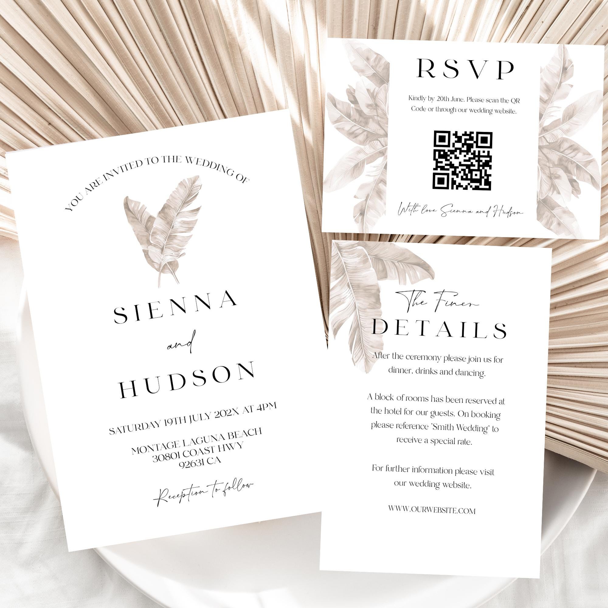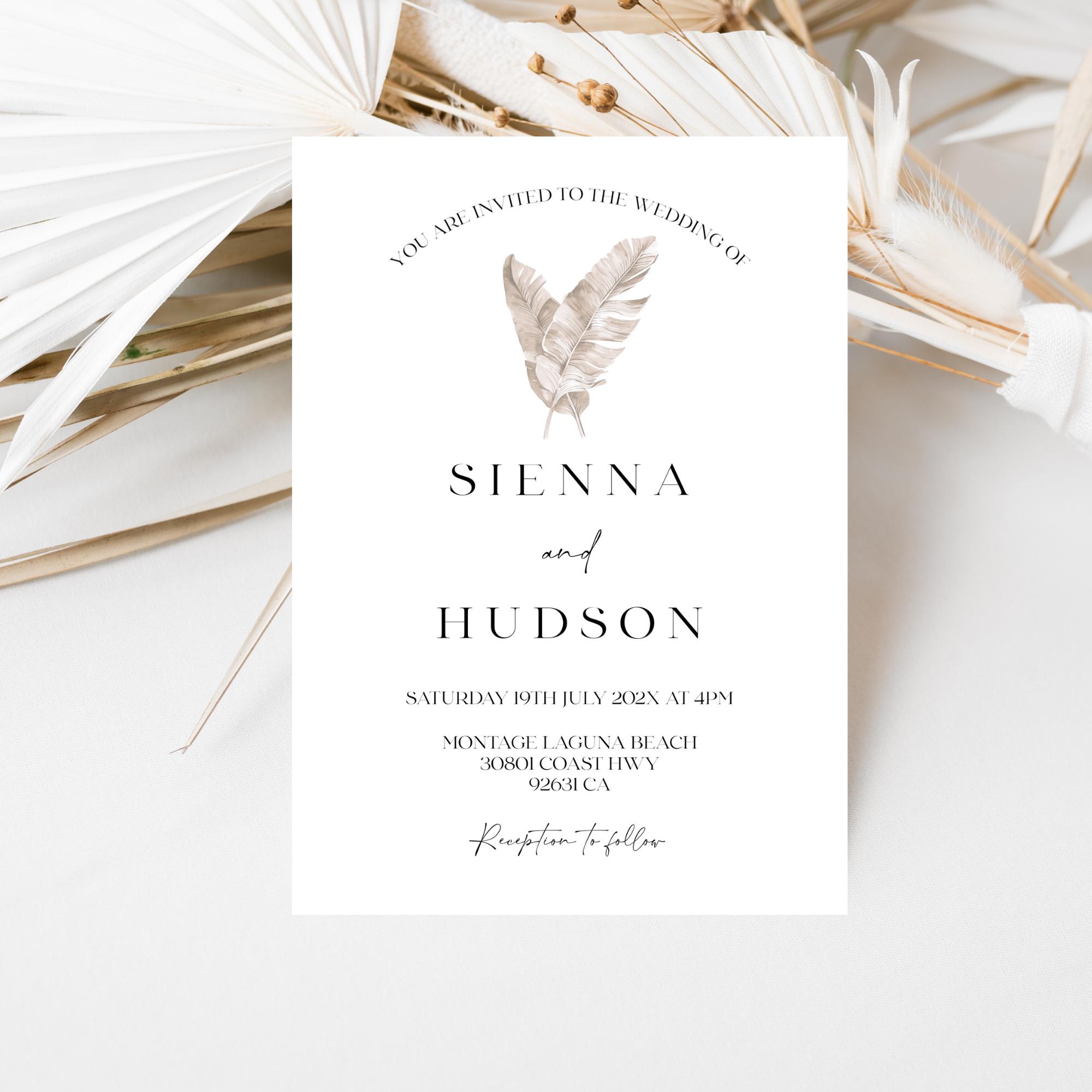 Modern Neutral Tropical Wedding Invitation Template Set. An Instant download digital file for you to edit in your web browser with Templett straight after your purchase. Once personalized you are ready to print.