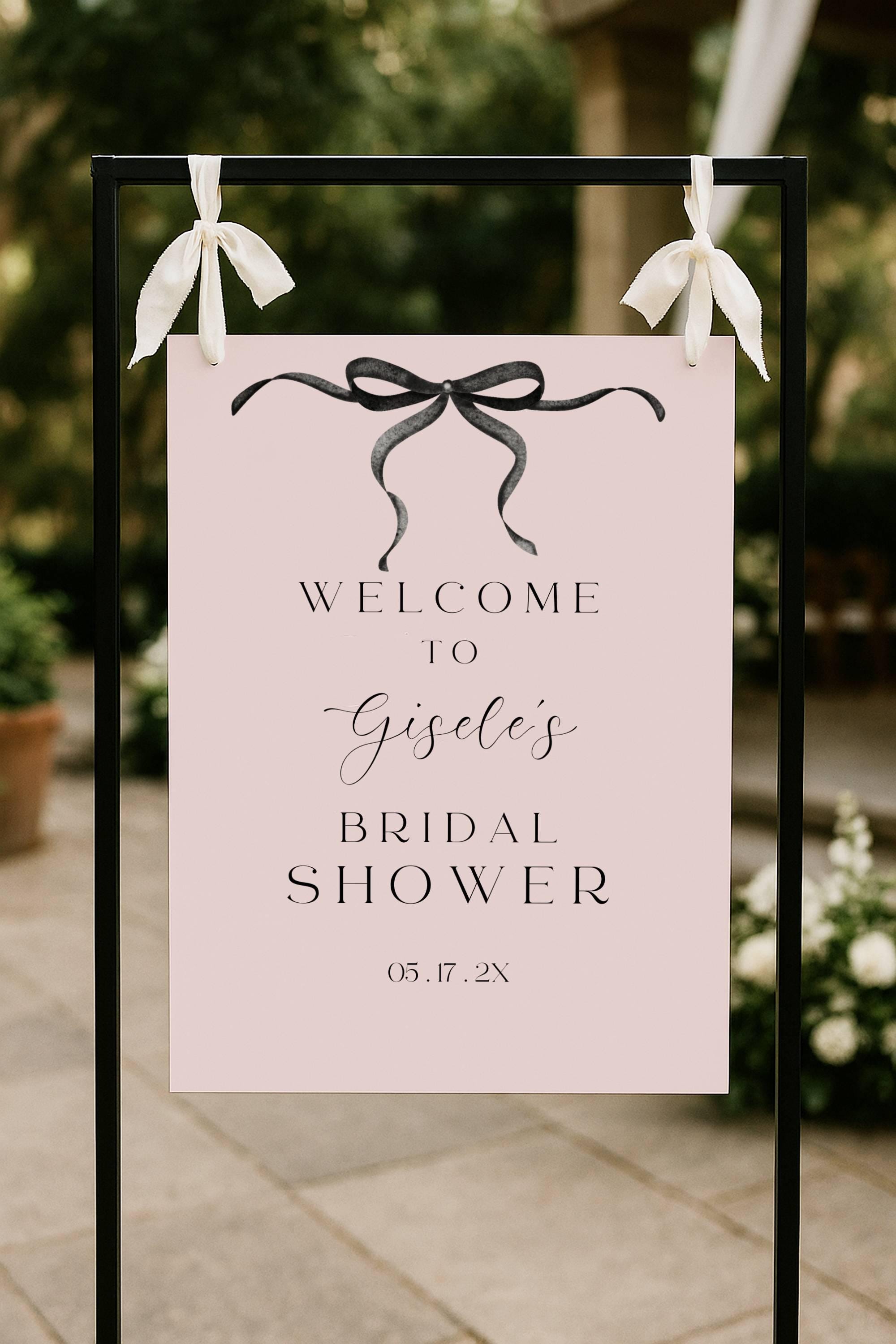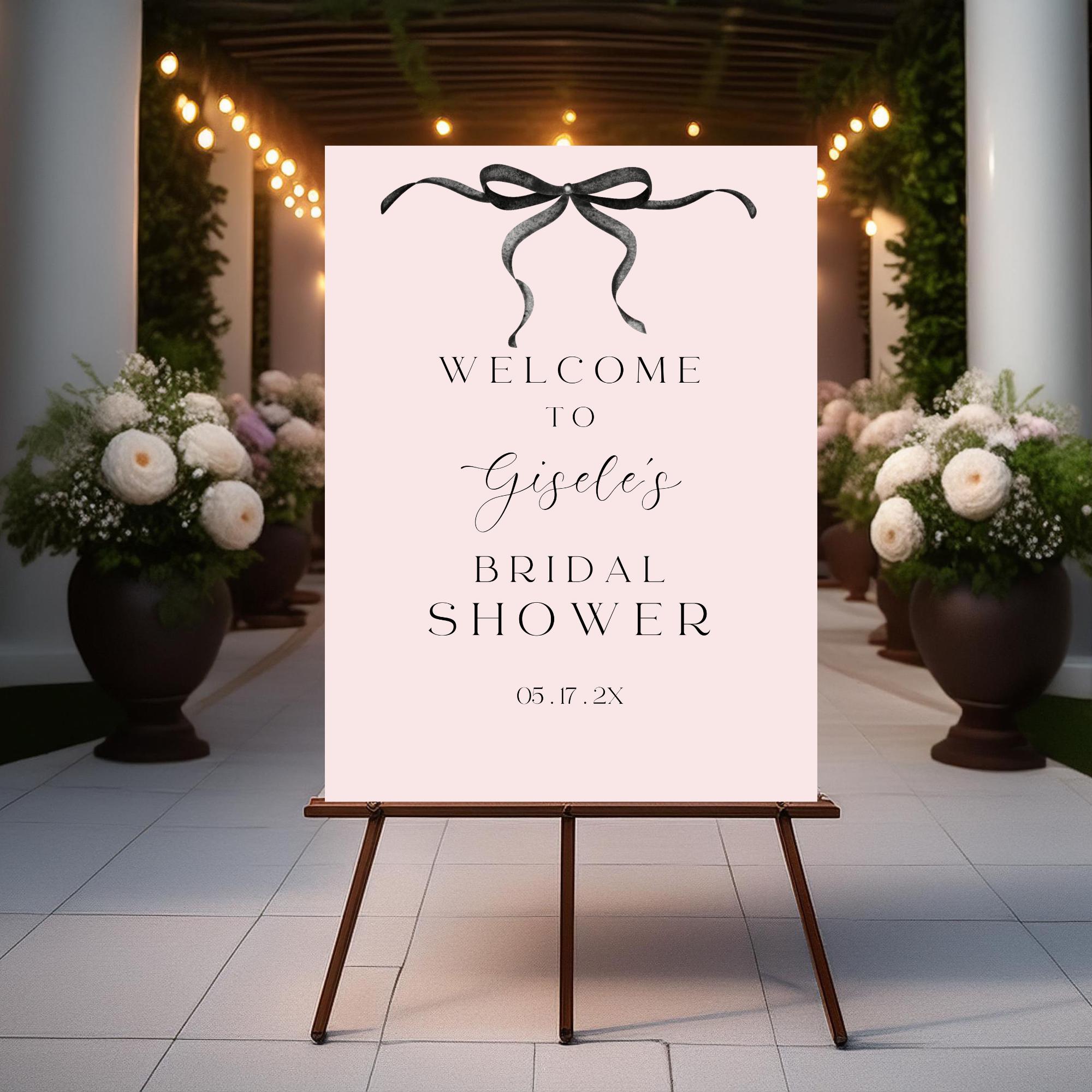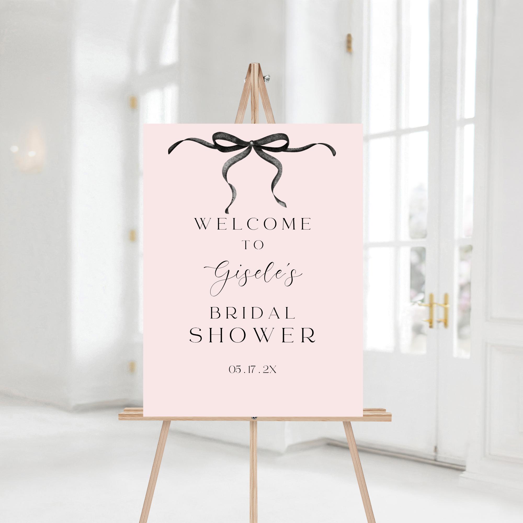 Modern Black Bow Bridal Shower Welcome Sign Template. An Instant download digital file for you to edit in your web browser with Templett straight after your purchase. Once personalized you are ready to print.