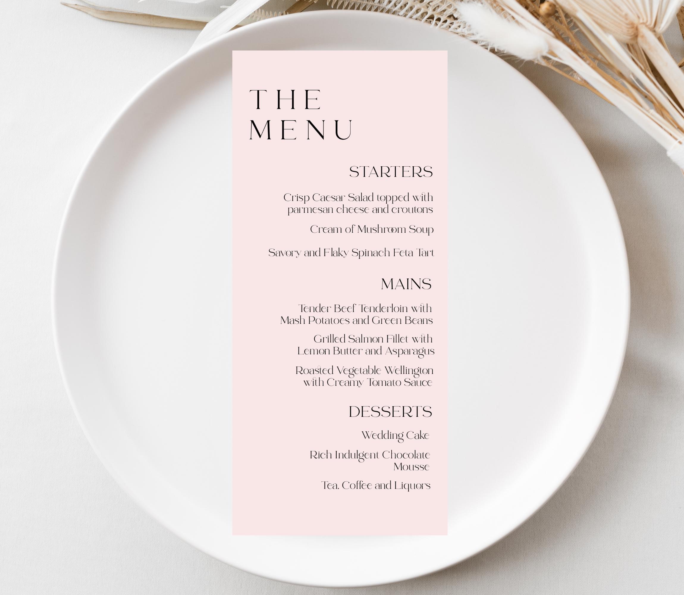 Modern Blush Wedding Menu Template. An Instant download digital file for you to edit in your web browser with Templett straight after your purchase. Once personalized you are ready to print.