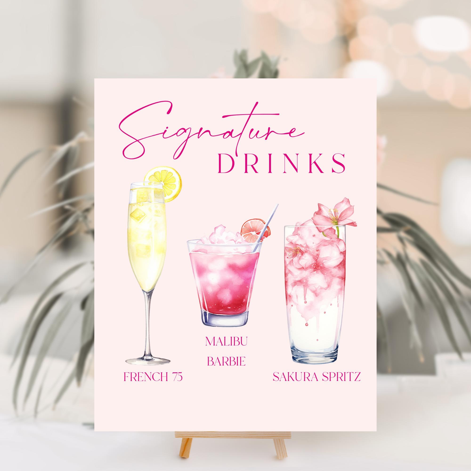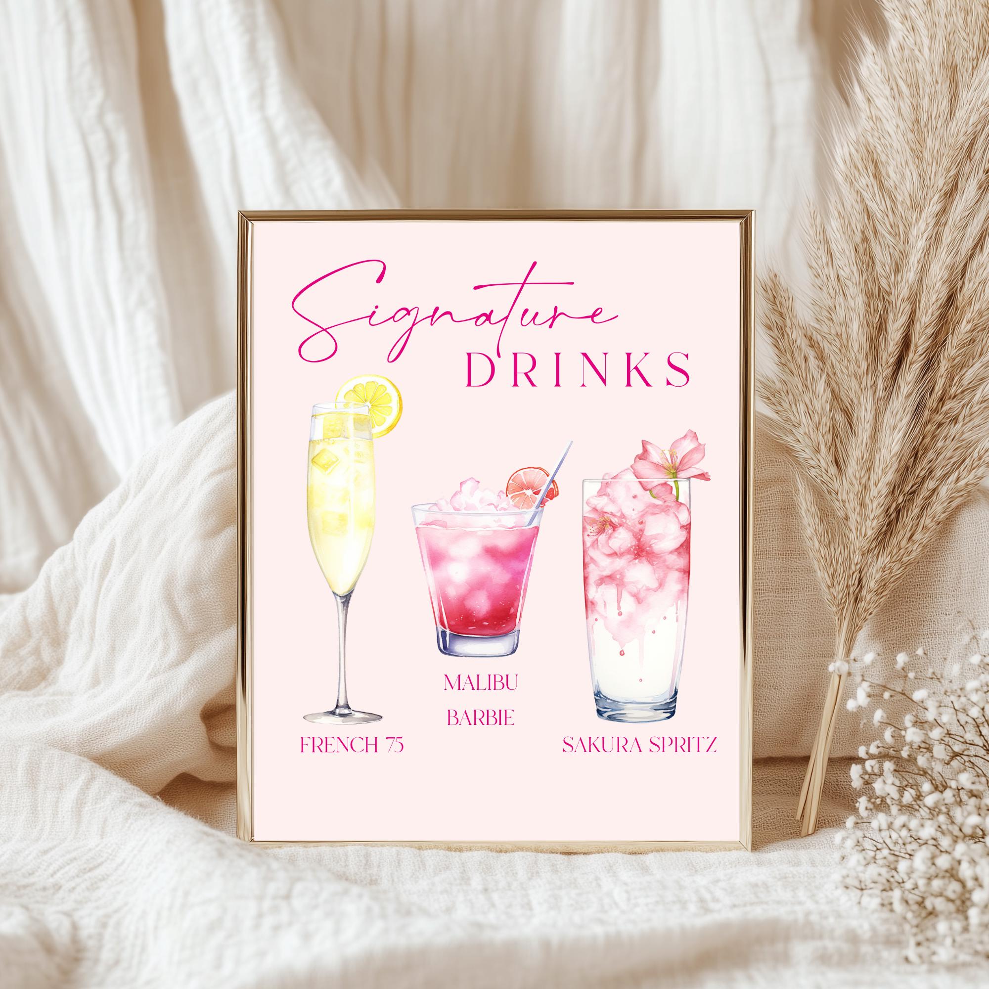 Pink Signature Drinks Sign Template. An Instant download digital file for you to edit in your web browser with Templett straight after your purchase. Once personalized you are ready to print.
