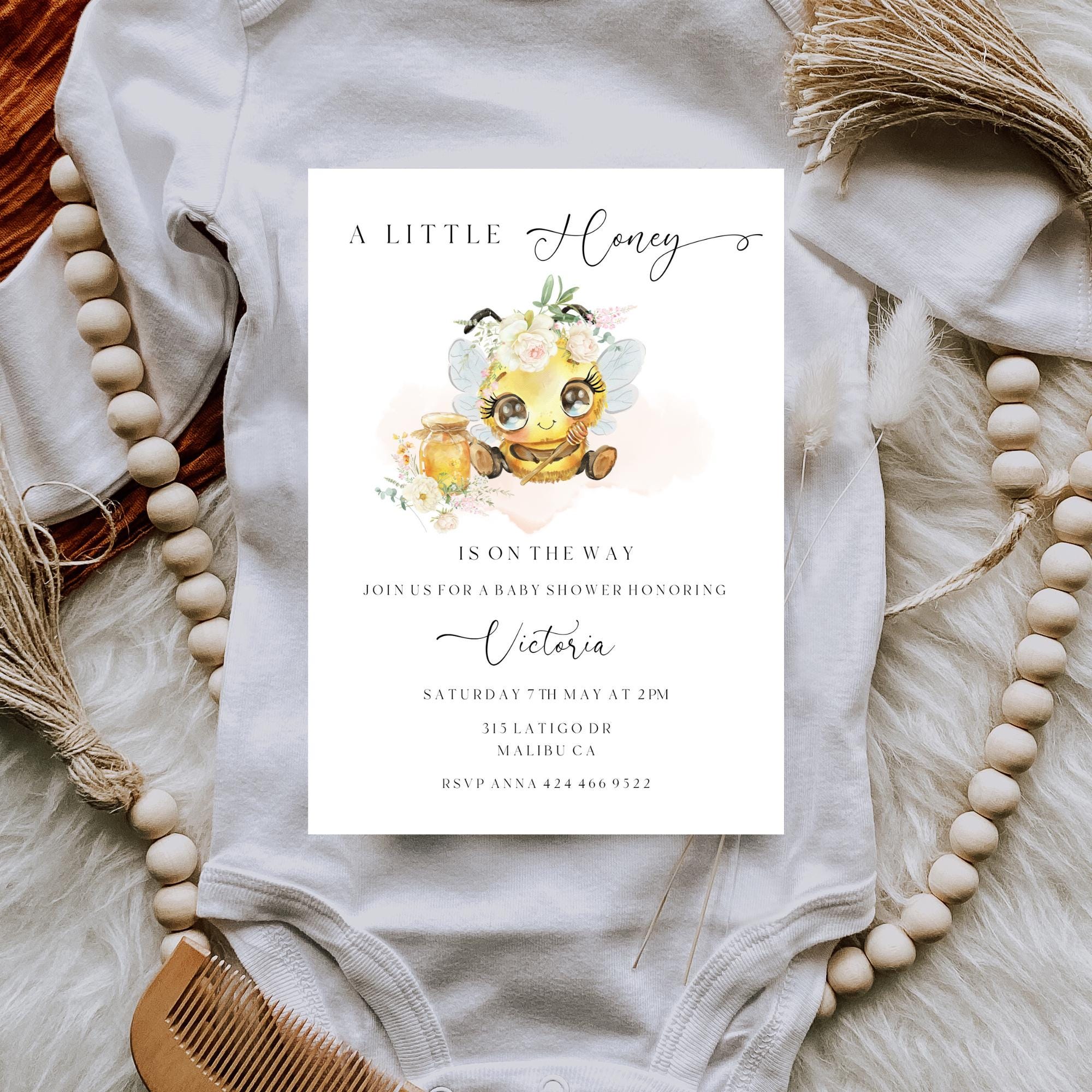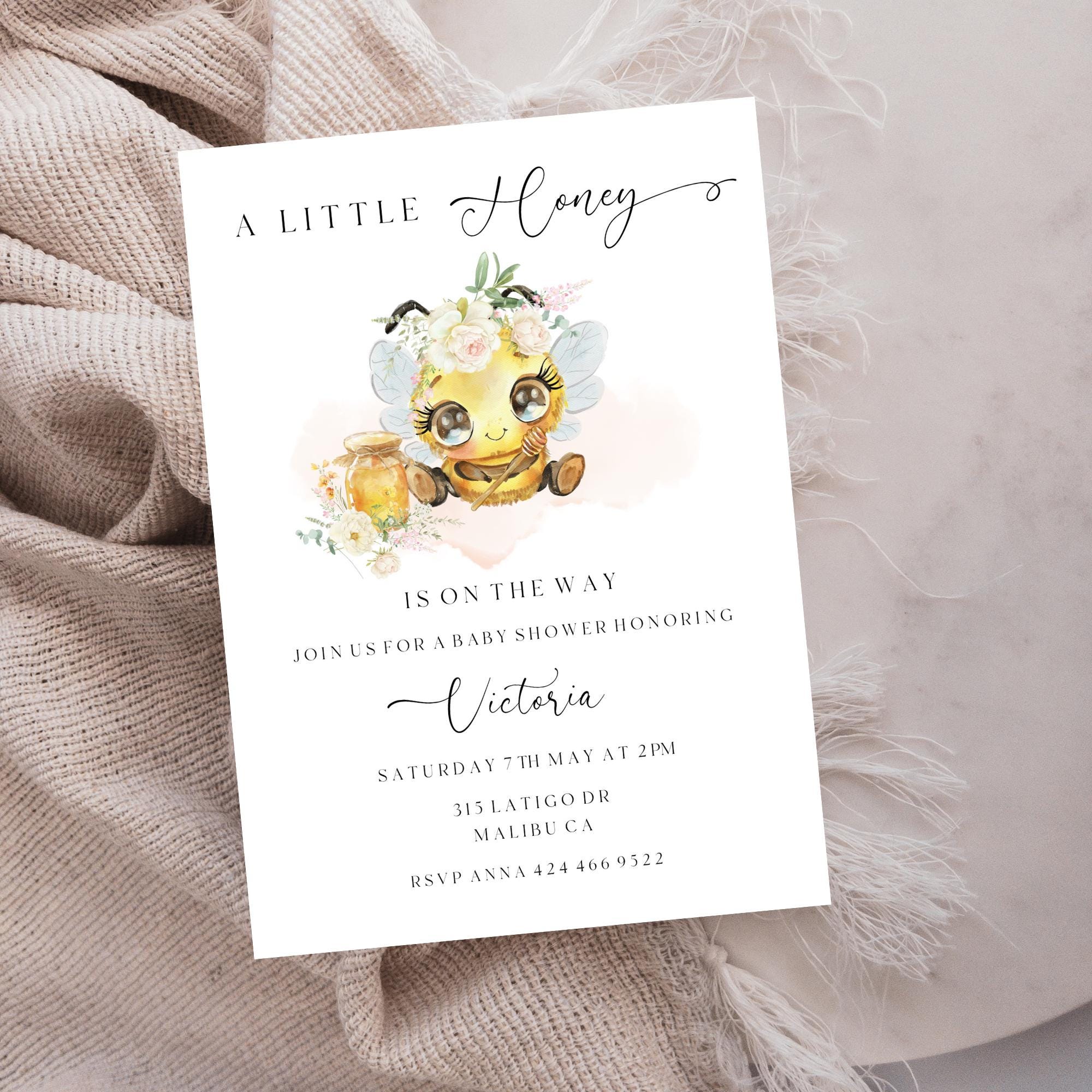 Honey Bee Baby Shower Invitation Template. An Instant download digital file for you to edit in your web browser with Templett straight after your purchase. Once personalized you are ready to print.