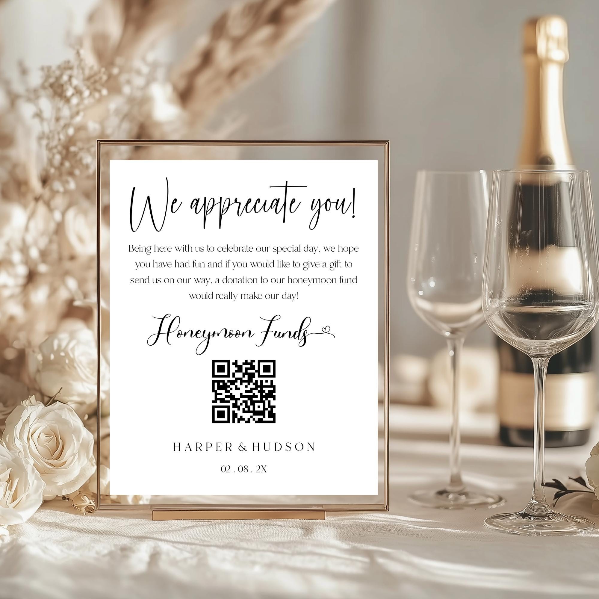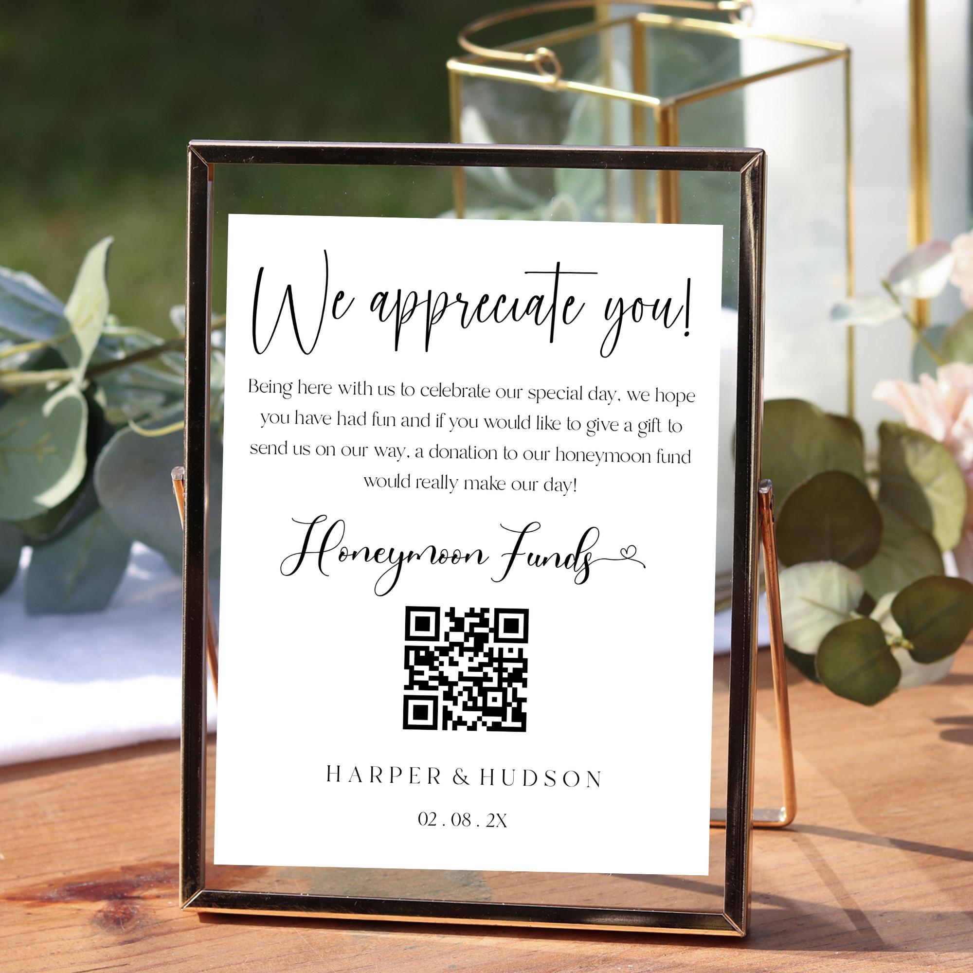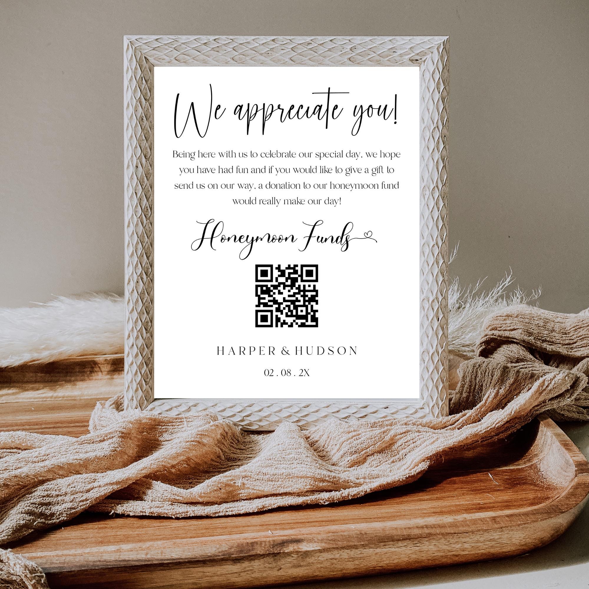 Modern Honeymoon fund QR Code Sign Template. An Instant download digital file for you to edit in your web browser with Templett straight after your purchase. Once personalized you are ready to print.