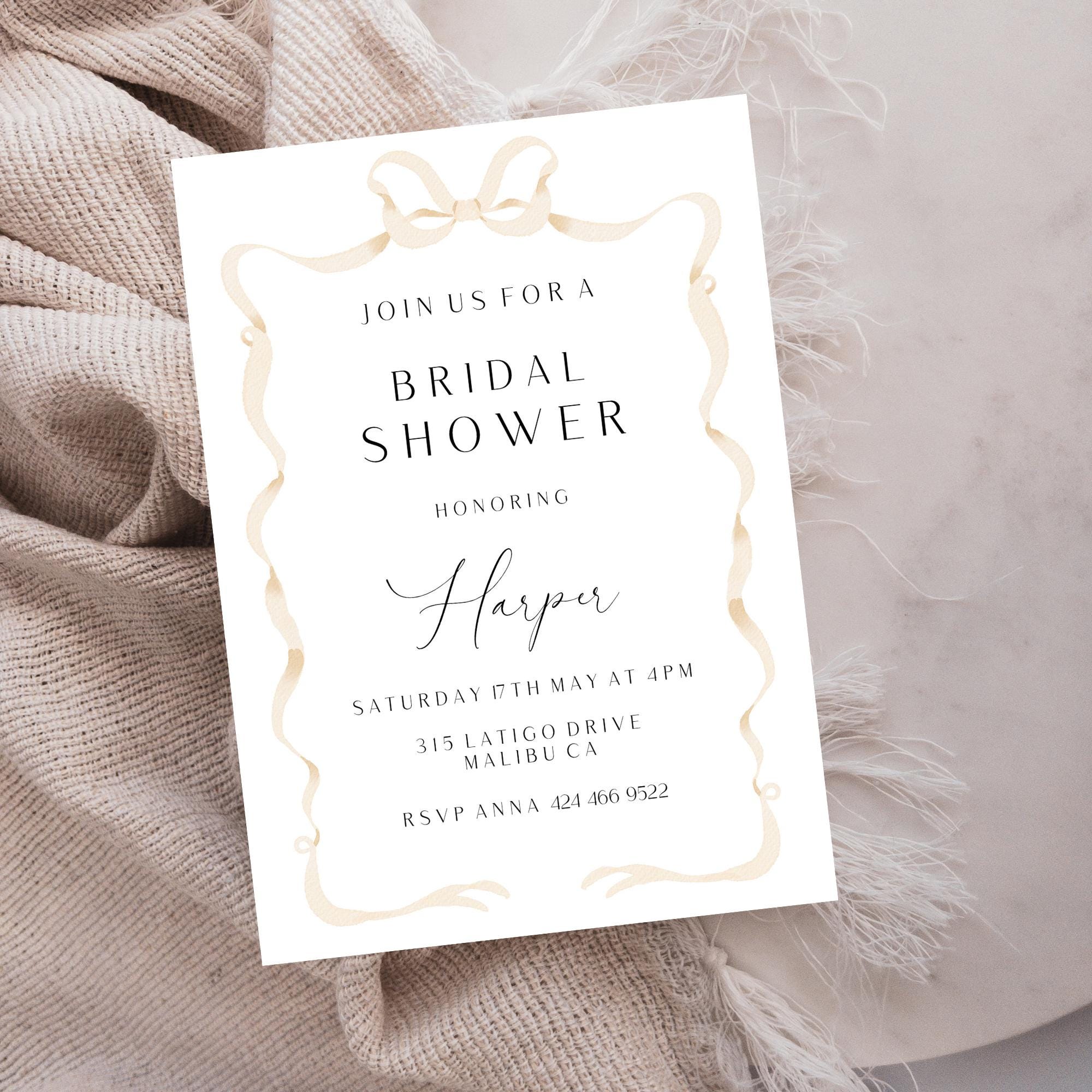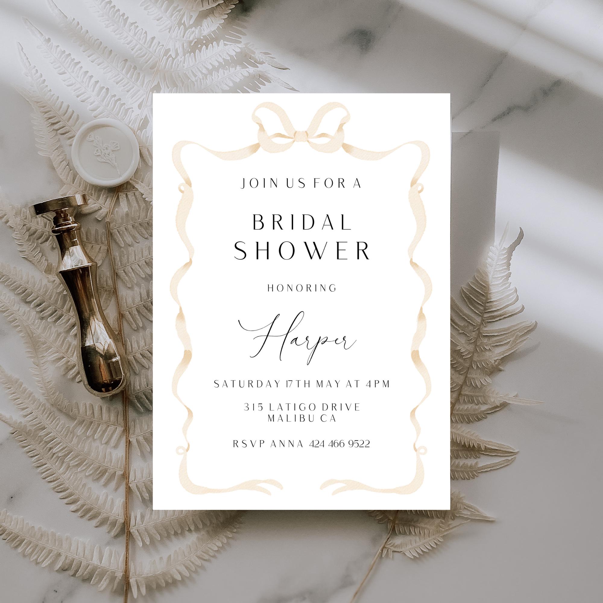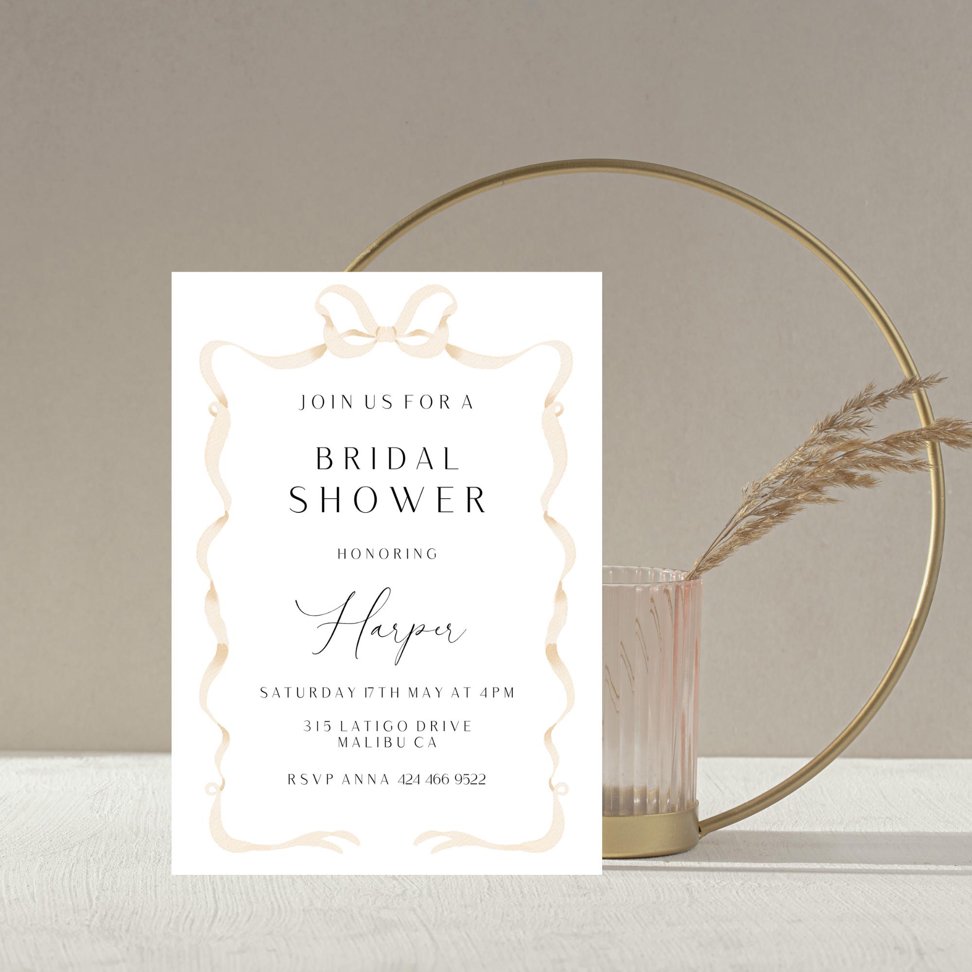 Beige Ribbon Bridal Shower Invitation Template. An Instant download digital file for you to edit in your web browser with Templett straight after your purchase. Once personalized you are ready to print.