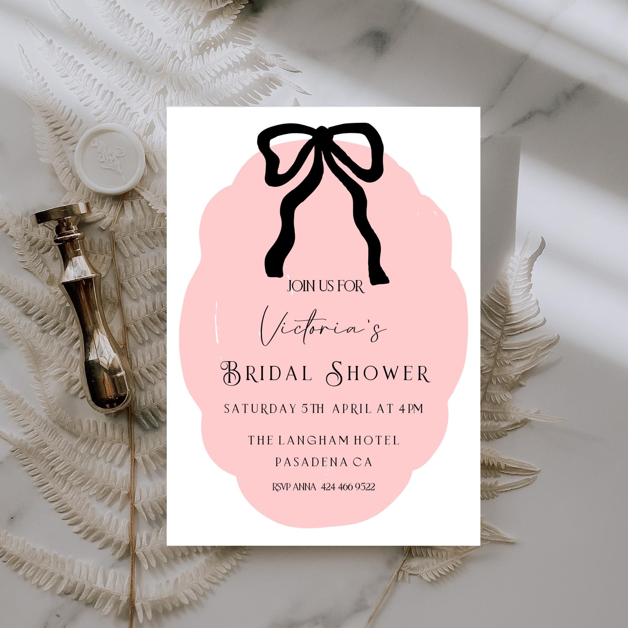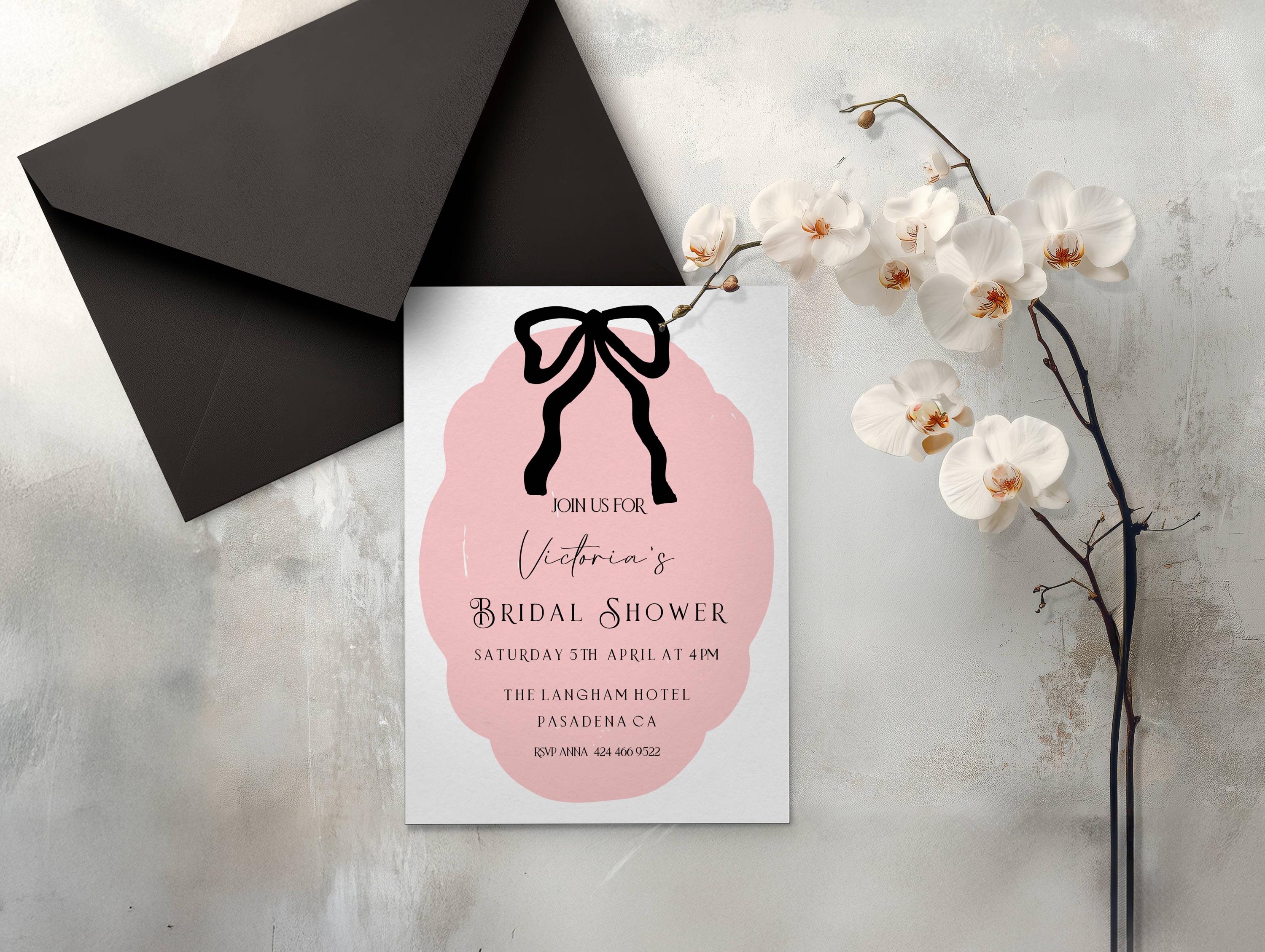 Black Bow bridal Shower Invitation Template. An Instant download digital file for you to edit in your web browser with Templett straight after your purchase. Once personalized you are ready to print.