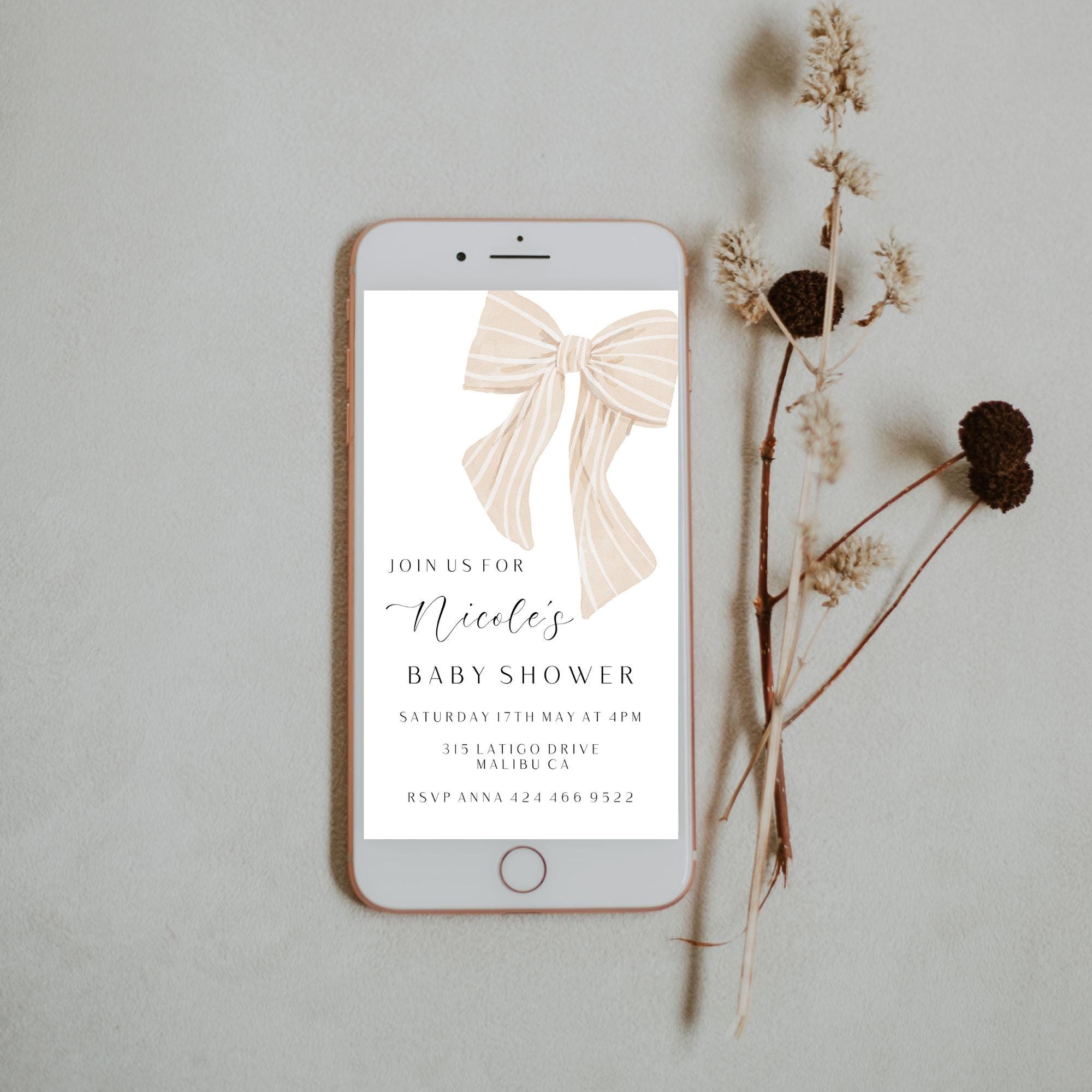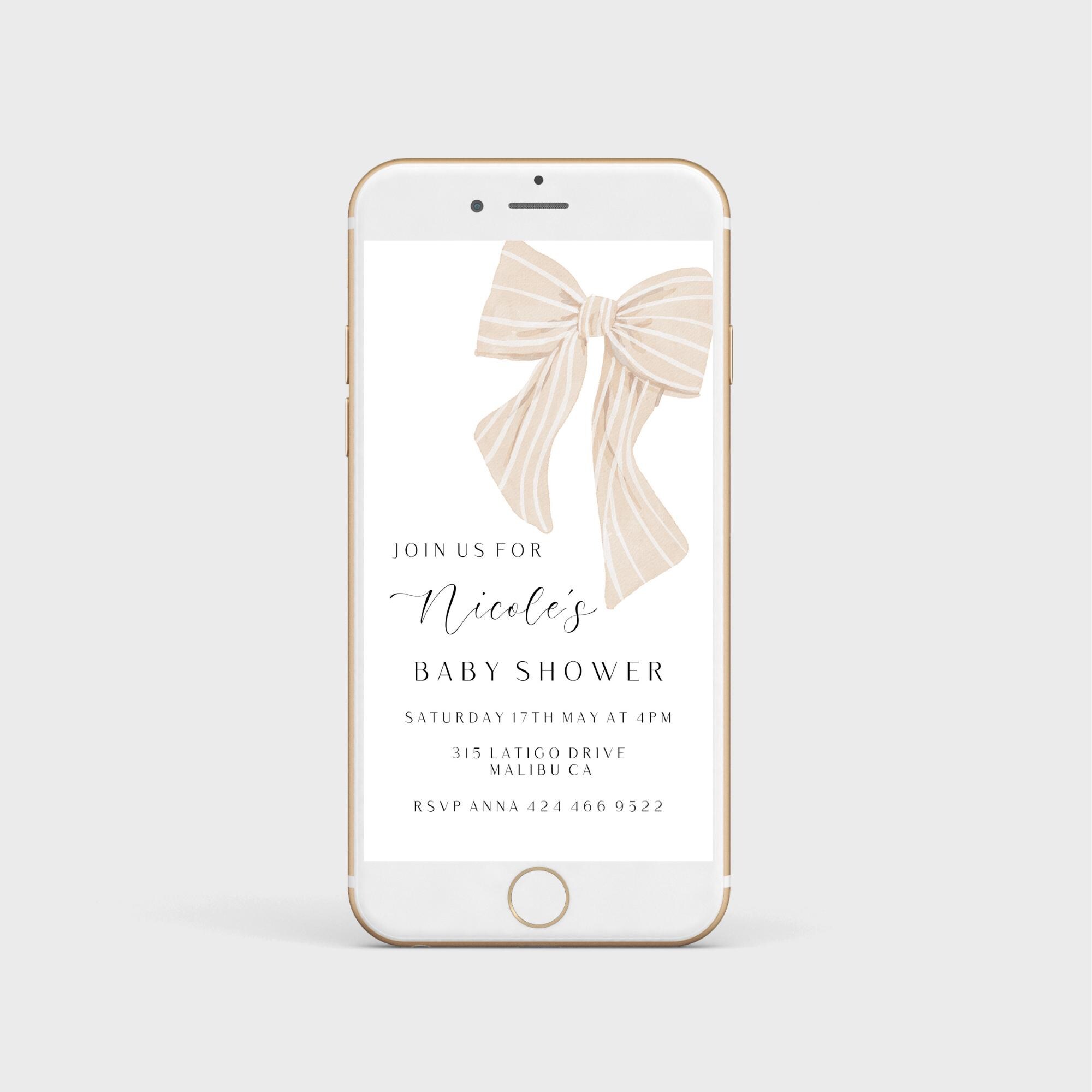Modern Beige Bow Baby Shower Evite Template. An Instant download digital file for you to edit in your web browser with Templett straight after your purchase. Once personalized you are ready to send.