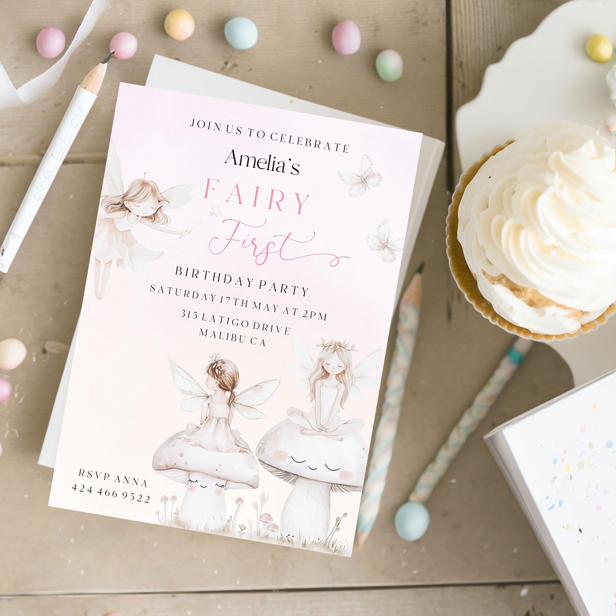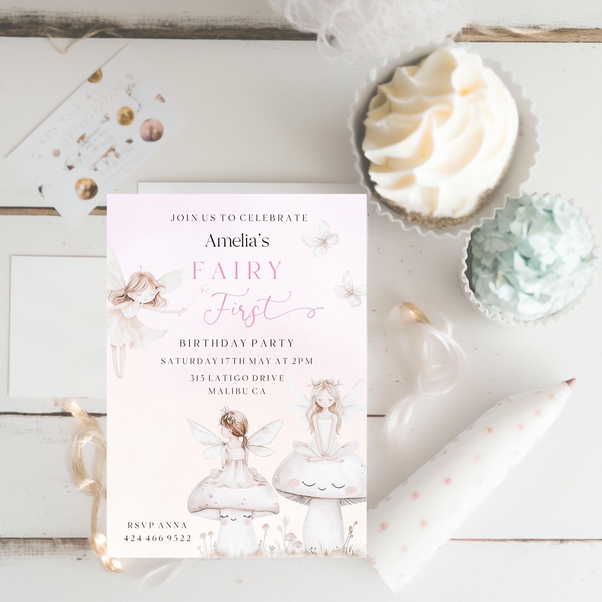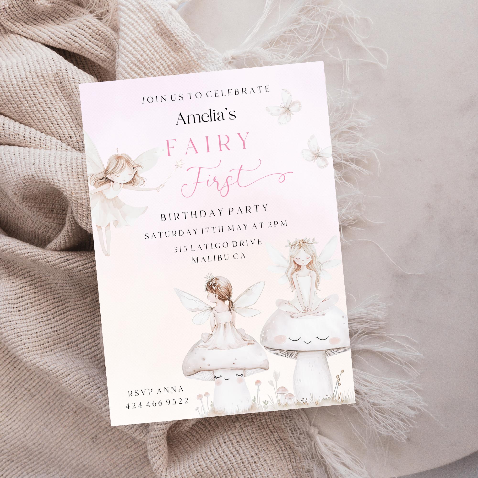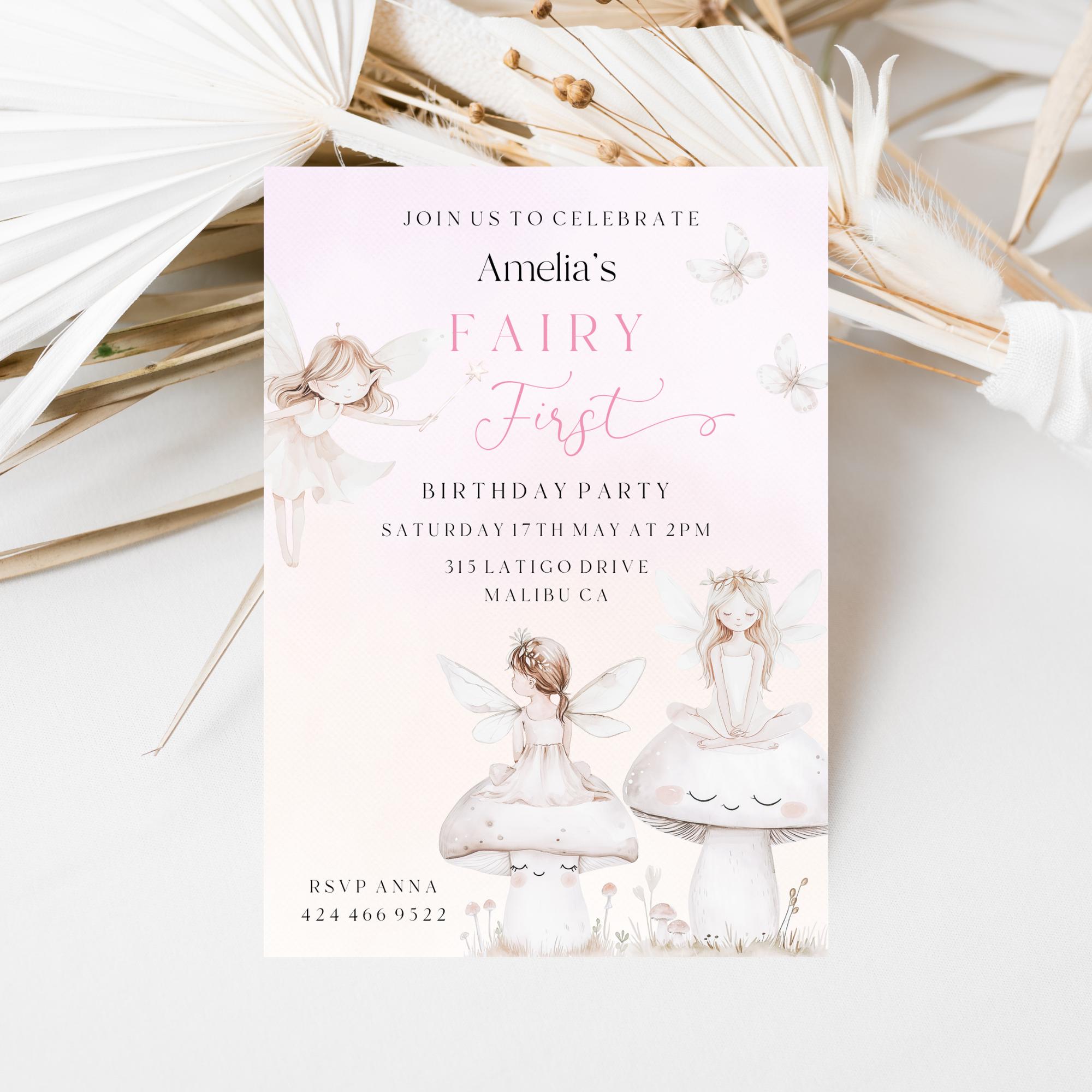 A Fairy First Birthday Party Invitation Template. An Instant download digital file for you to edit in your web browser with Templett straight after your purchase. Once personalized you are ready to print.