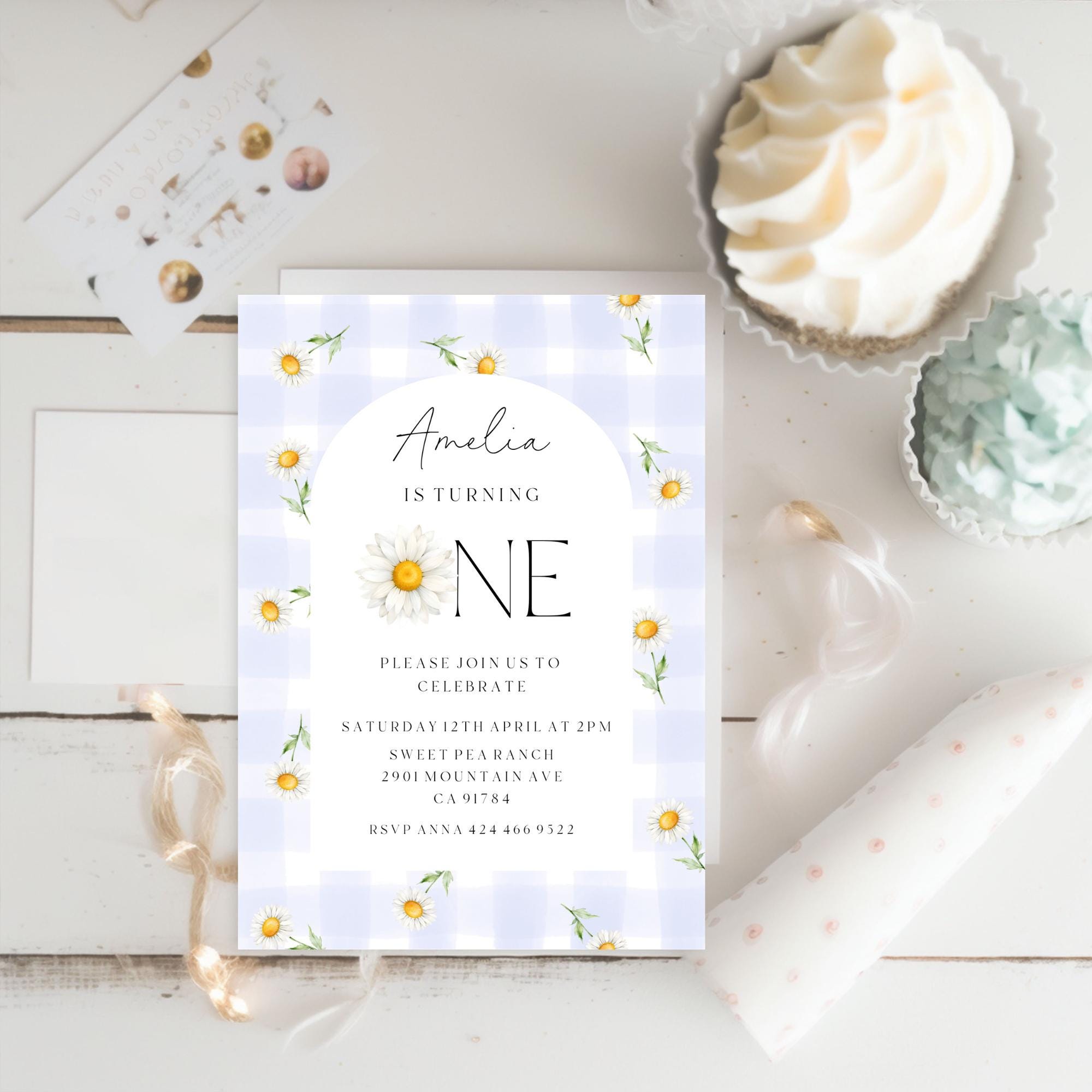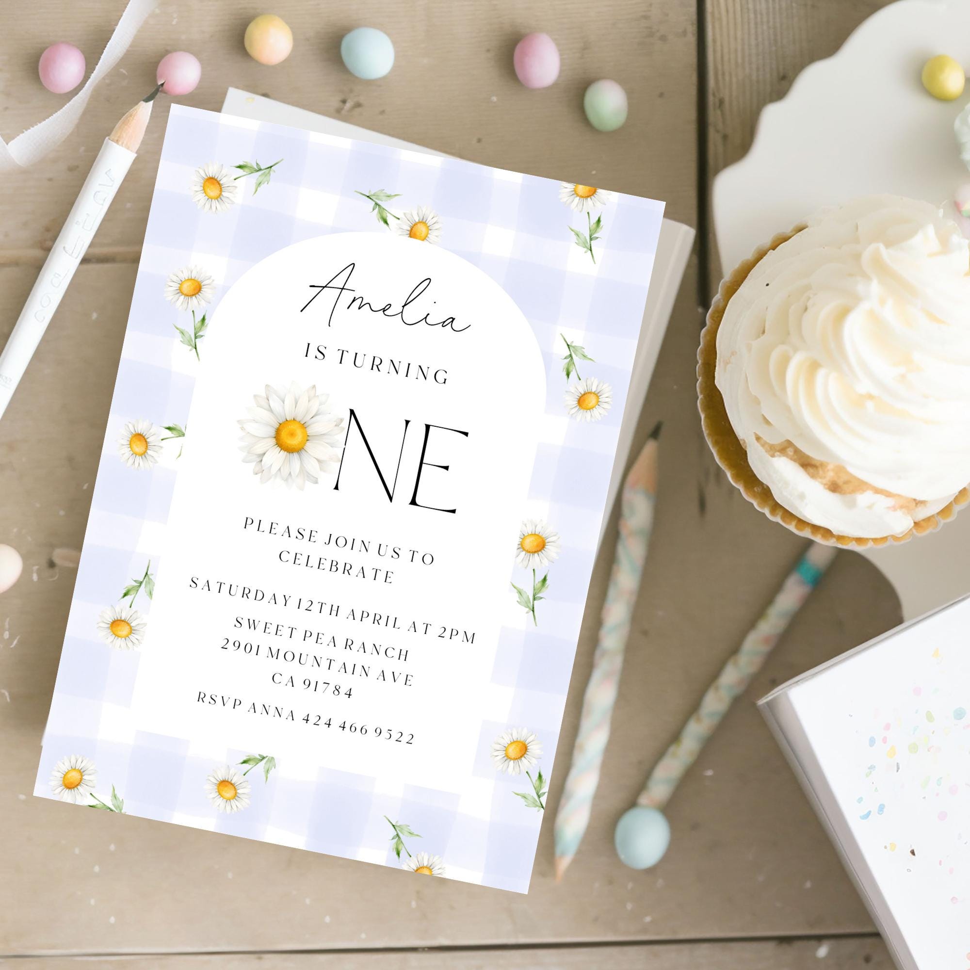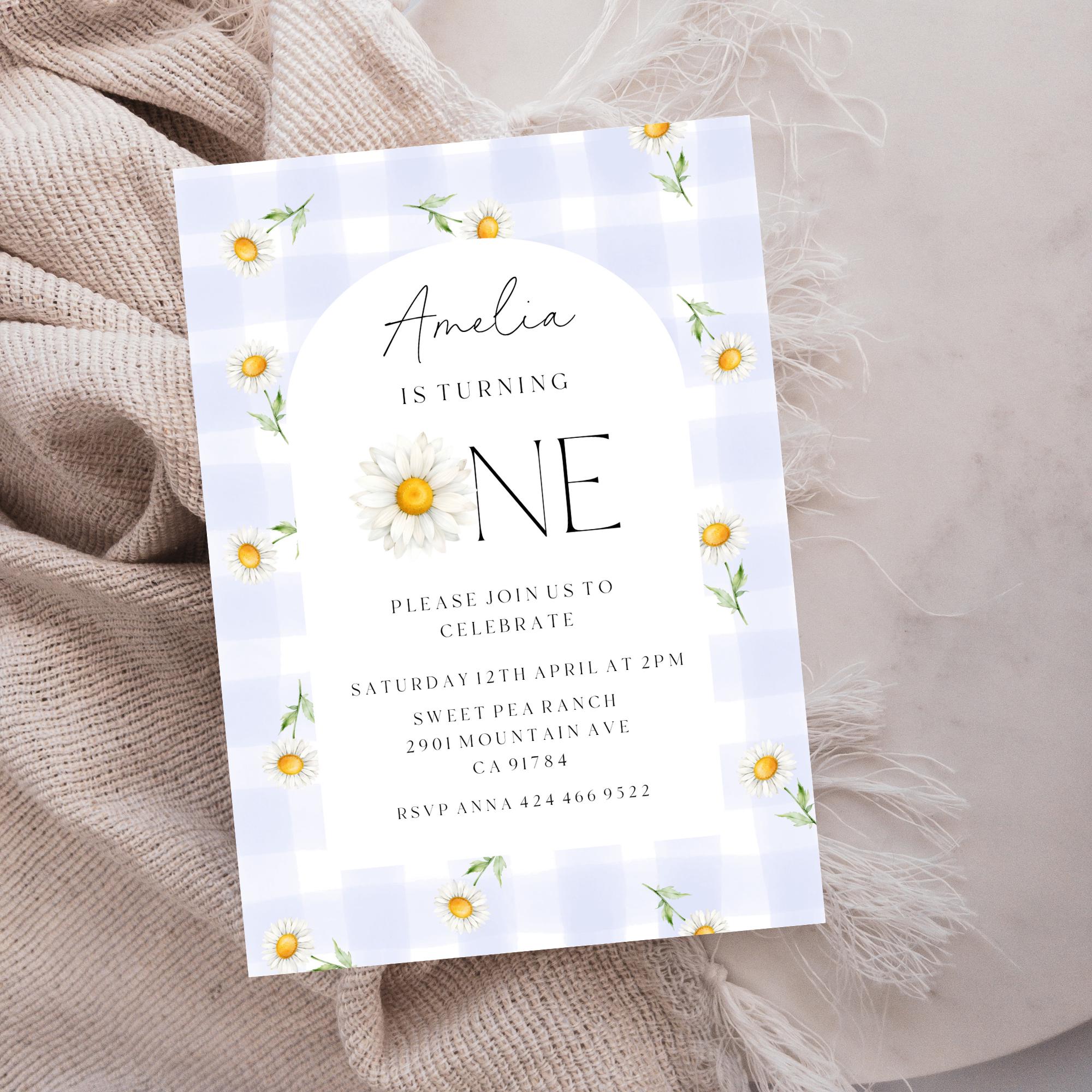 Daisy First Birthday Invitation Template. An Instant download digital file for you to edit in your web browser with Templett straight after your purchase. Once personalized you are ready to print.