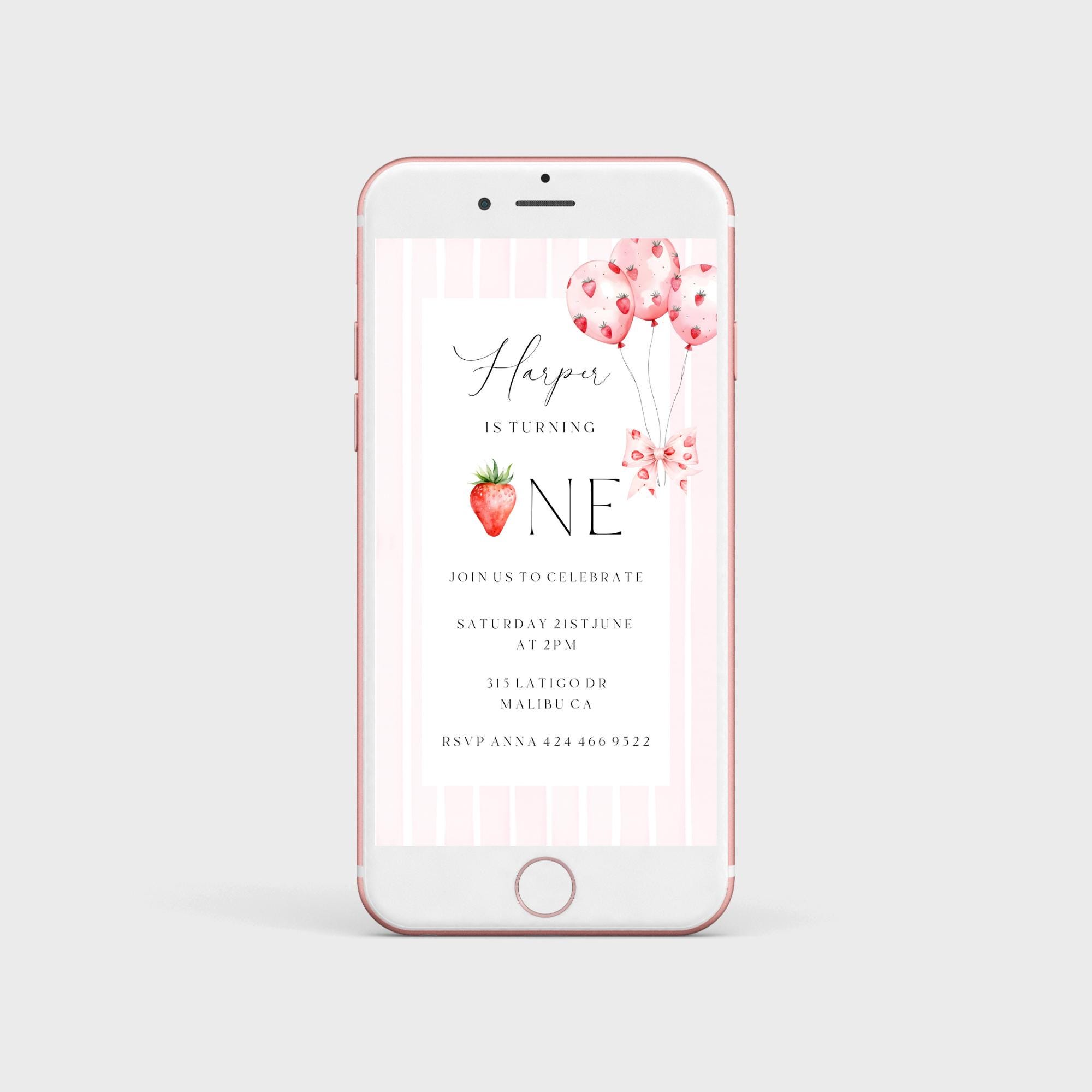 Strawberry First Birthday Evite Template. An Instant download digital file for you to edit in your web browser with Templett straight after your purchase. Once personalized you are ready to send.