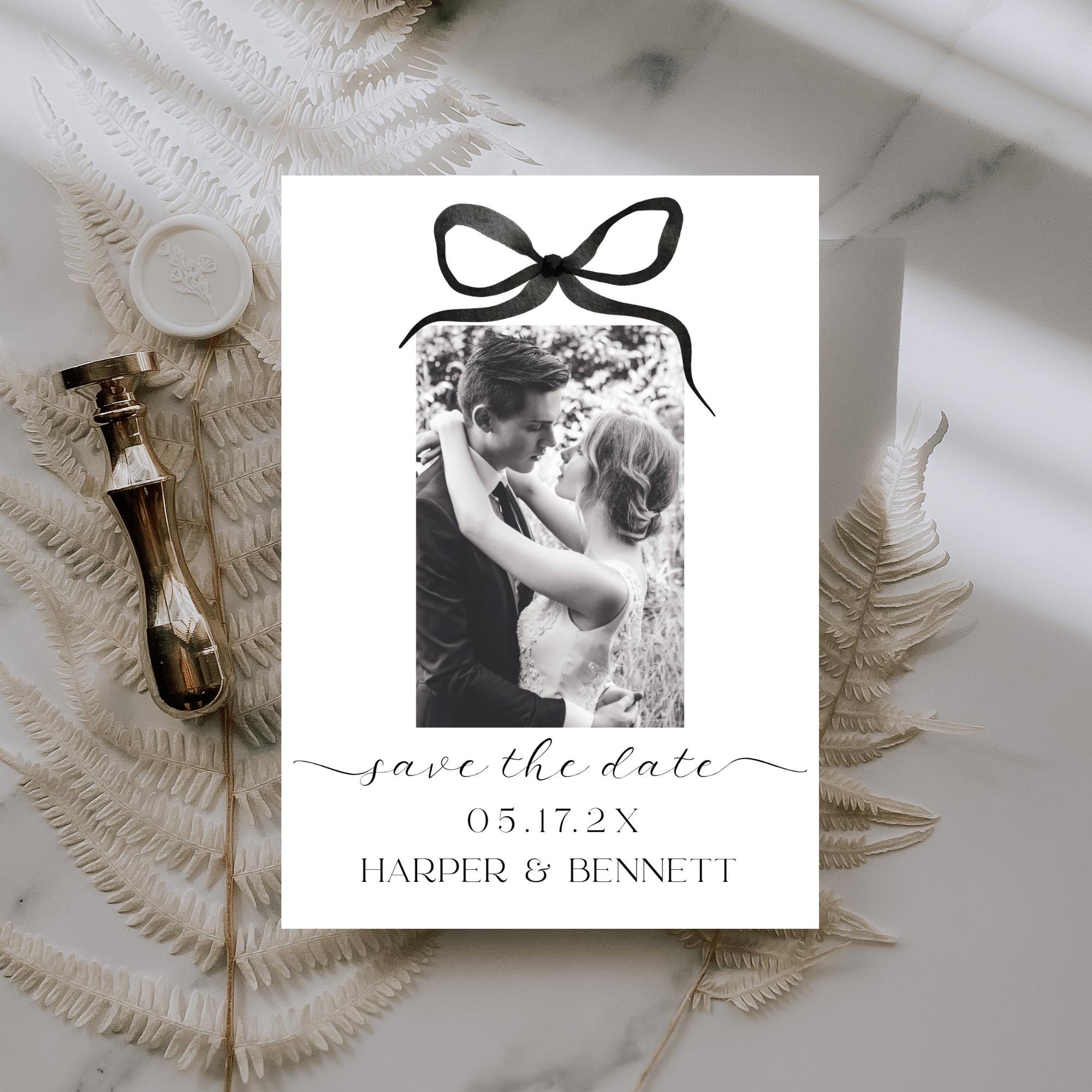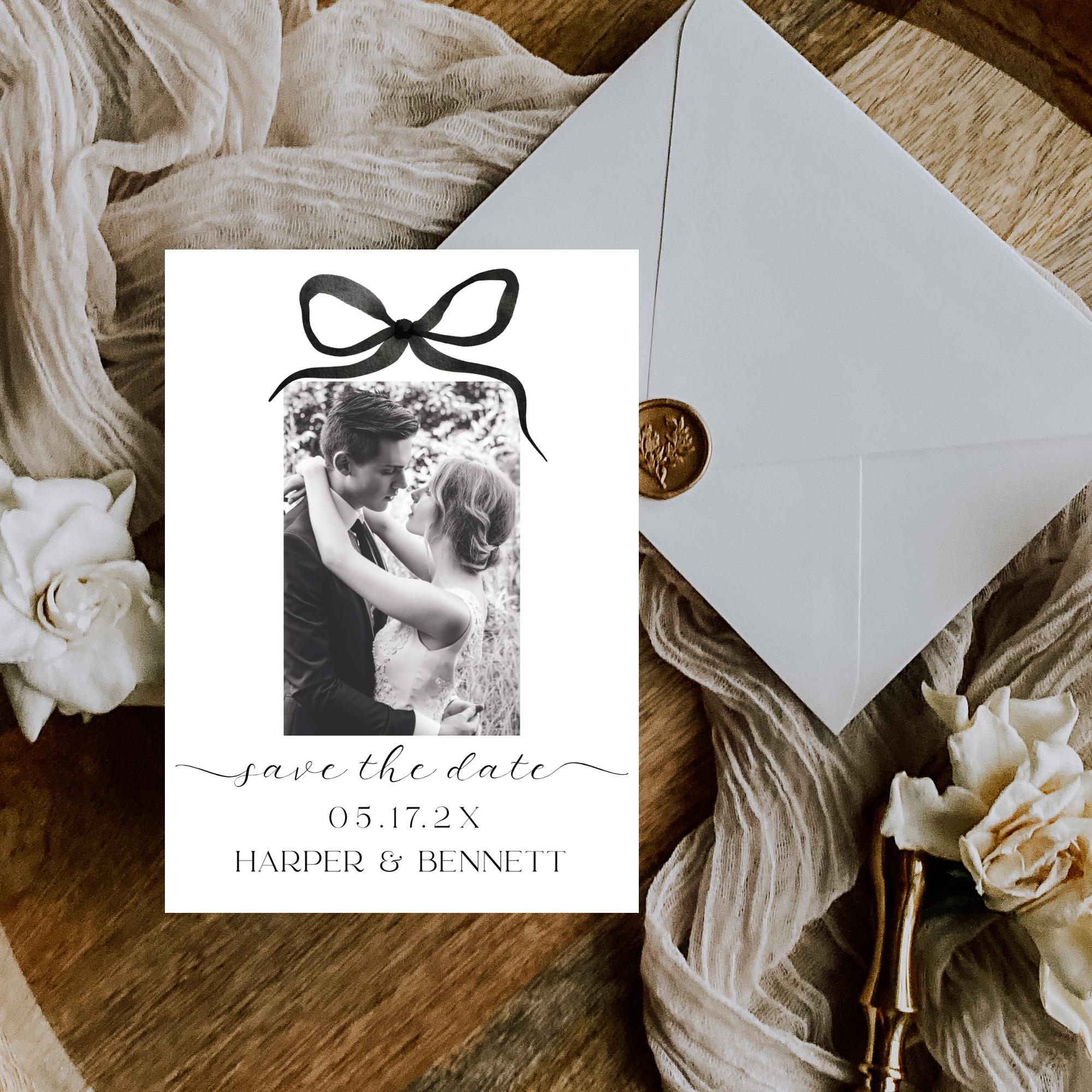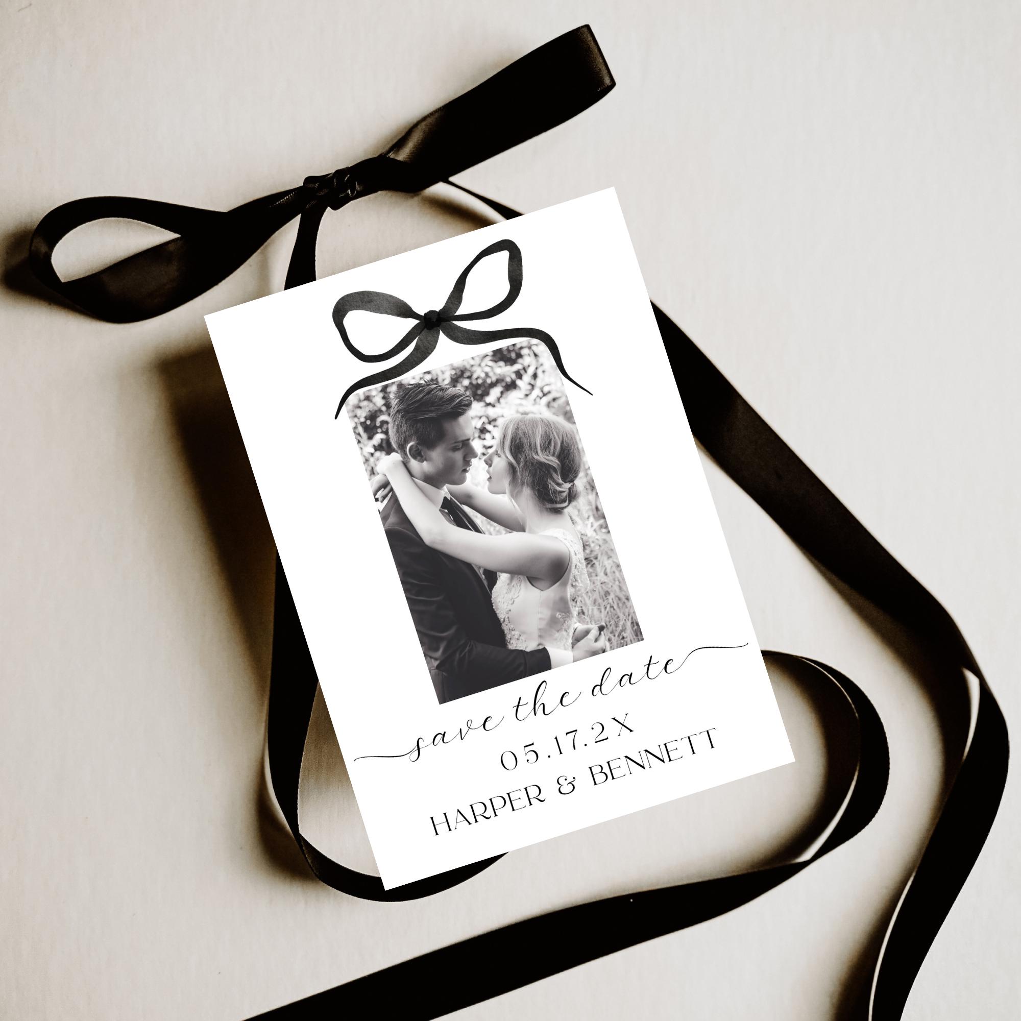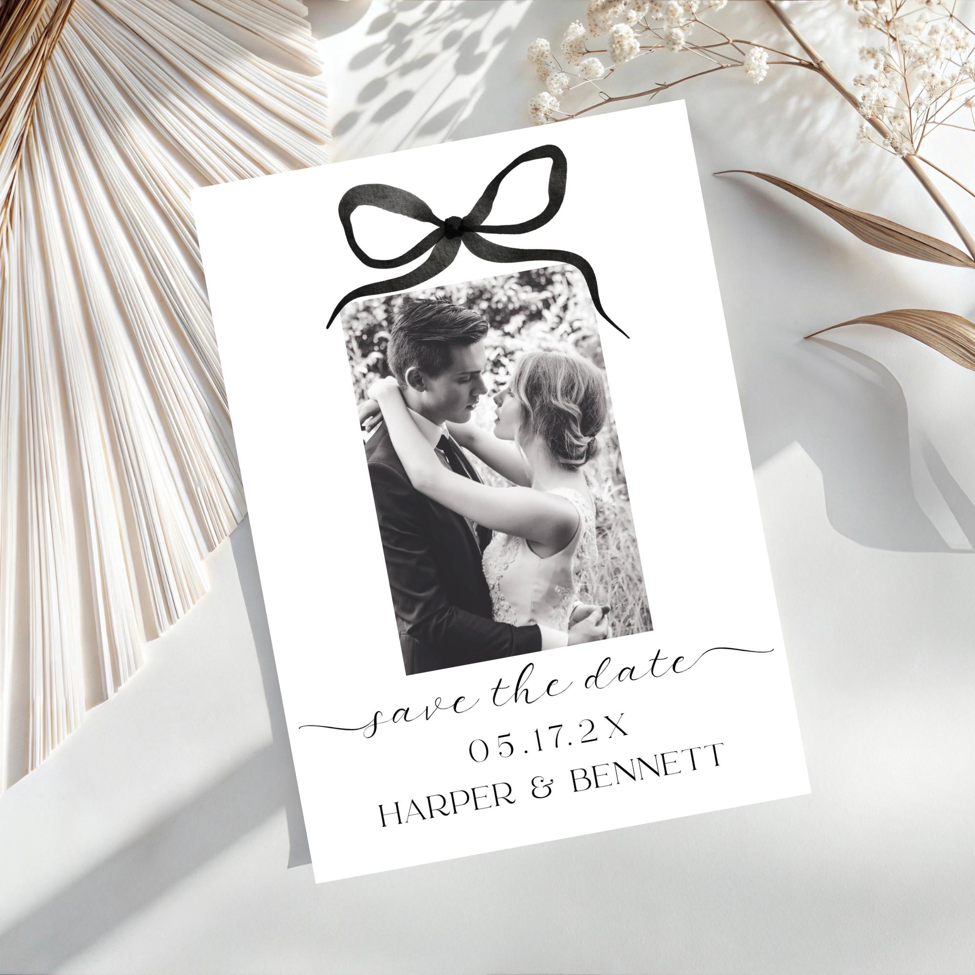Modern Bow Photo Save The Date Invitation Template. An Instant download digital file for you to edit in your web browser with Templett straight after your purchase. Once personalized you are ready to print.
