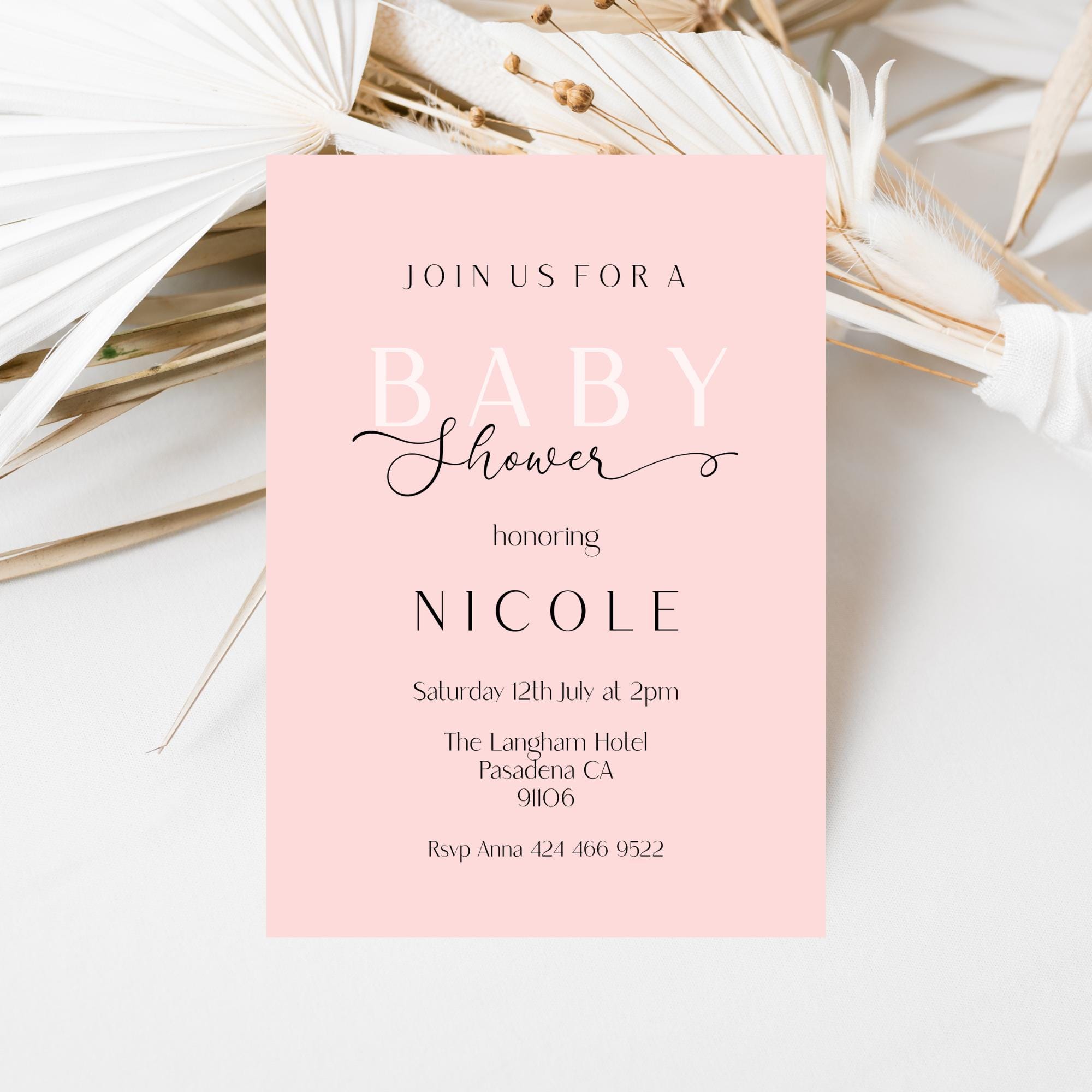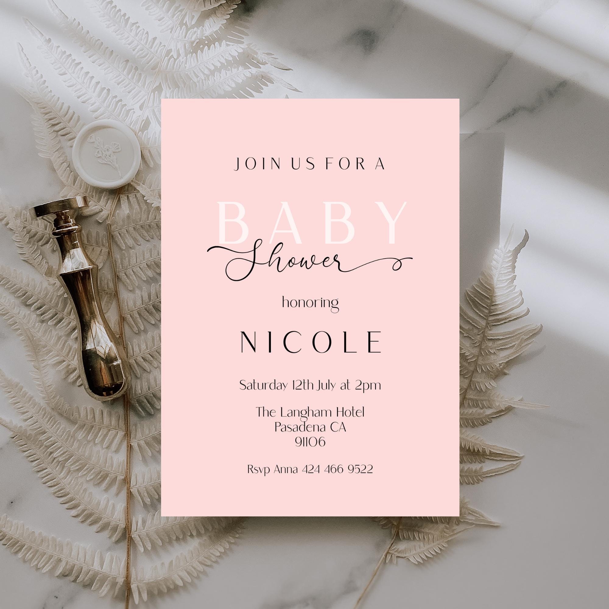 Modern Pink Baby Shower Invitation Template. An Instant download digital file for you to edit in your web browser with Templett straight after your purchase. Once personalized you are ready to print.
