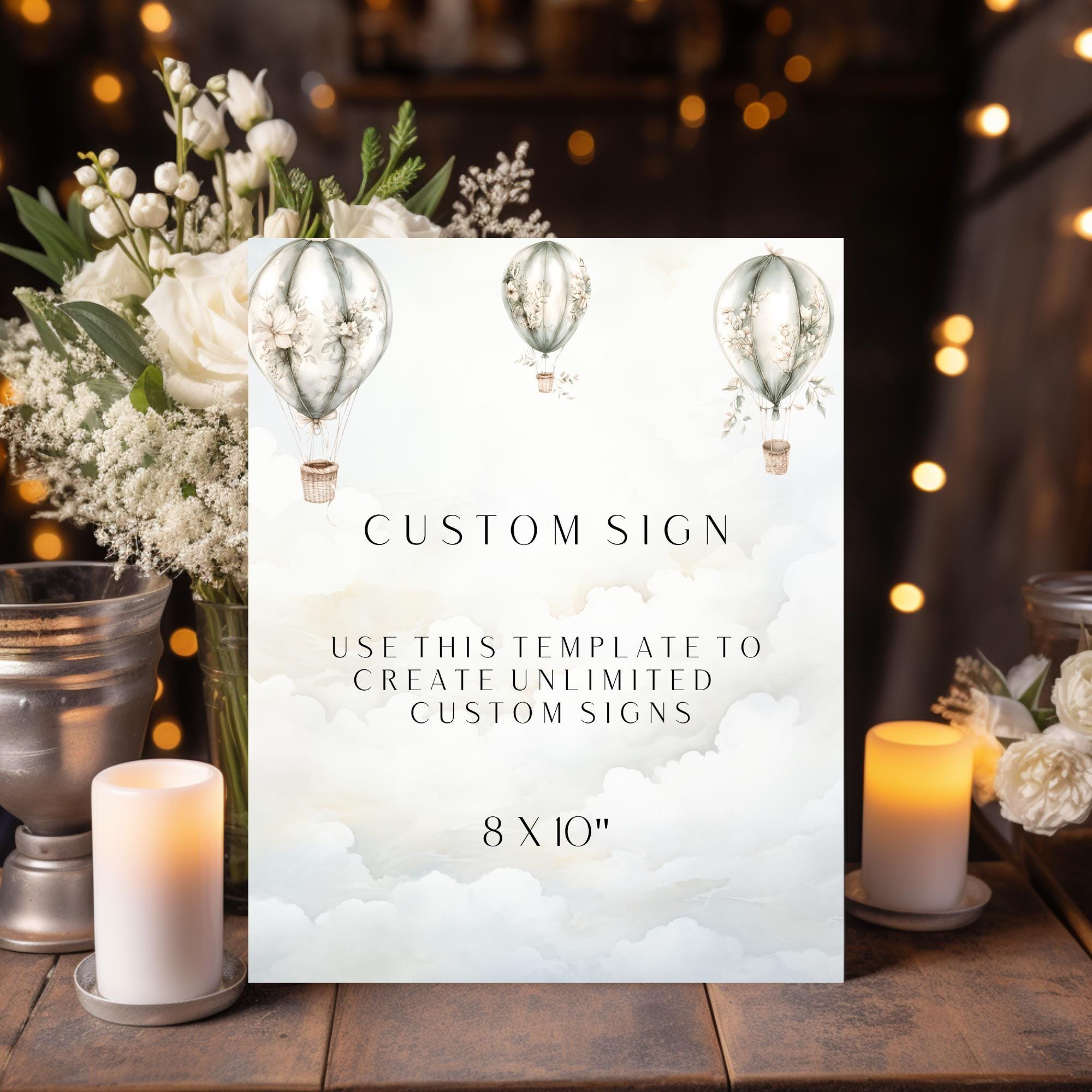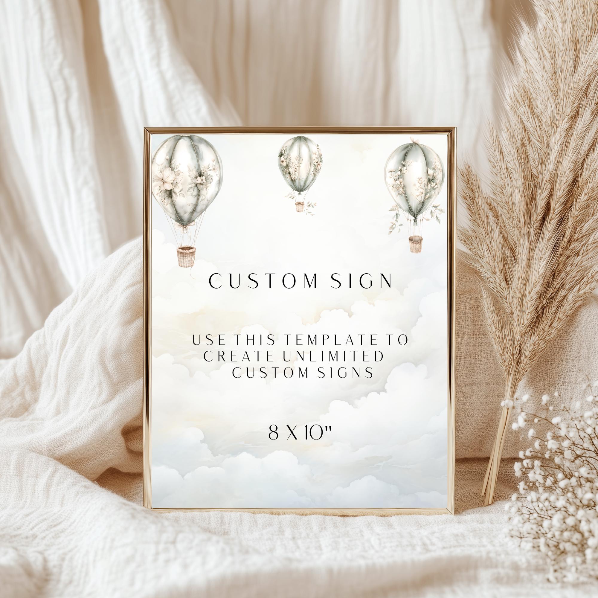 Hot Air Balloon Custom Sign Template. An Instant download digital file for you to edit in your web browser with Templett straight after your purchase. Once personalized you are ready to print.